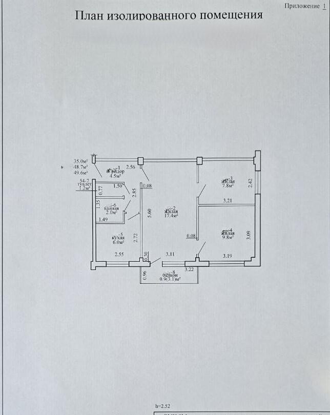 Площадь квартиры по СНБ 49,6 м2. (h-2,52м).