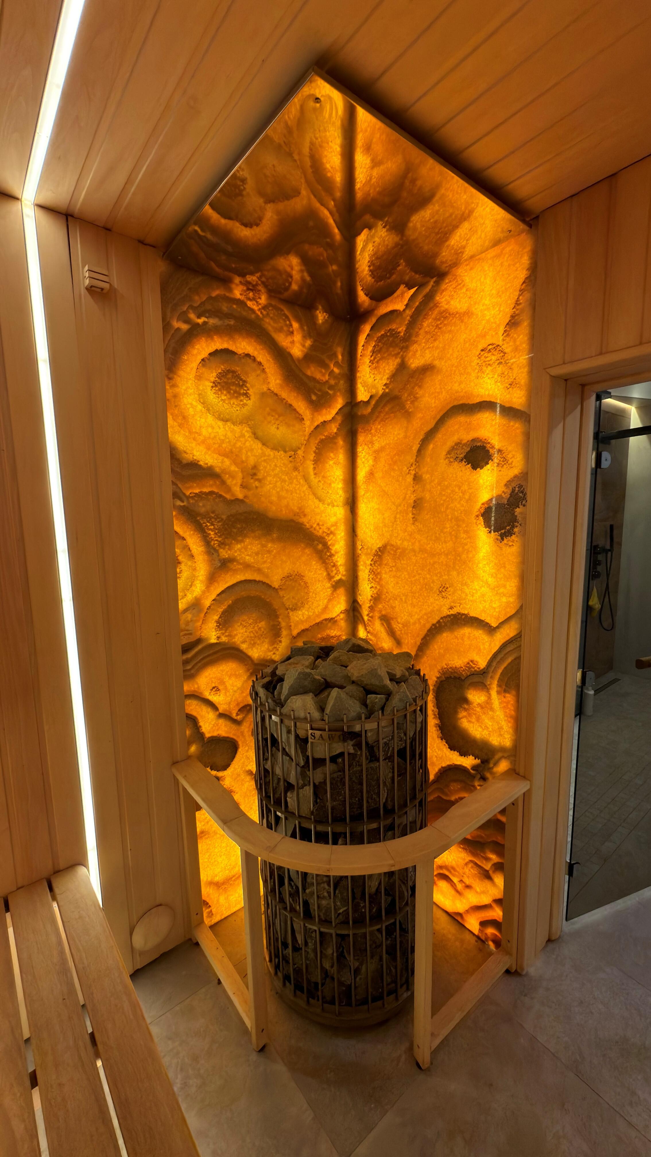 Сауна премиум-класса. Зона печи отделана натуральным ониксом с художественной подсветкой. Мощная энергетика камня и мягкая подсветка создают неповторимую атмосферу для настоящего отдыха и релаксации.