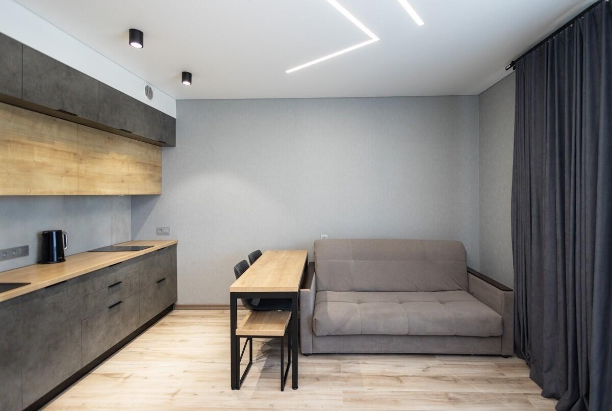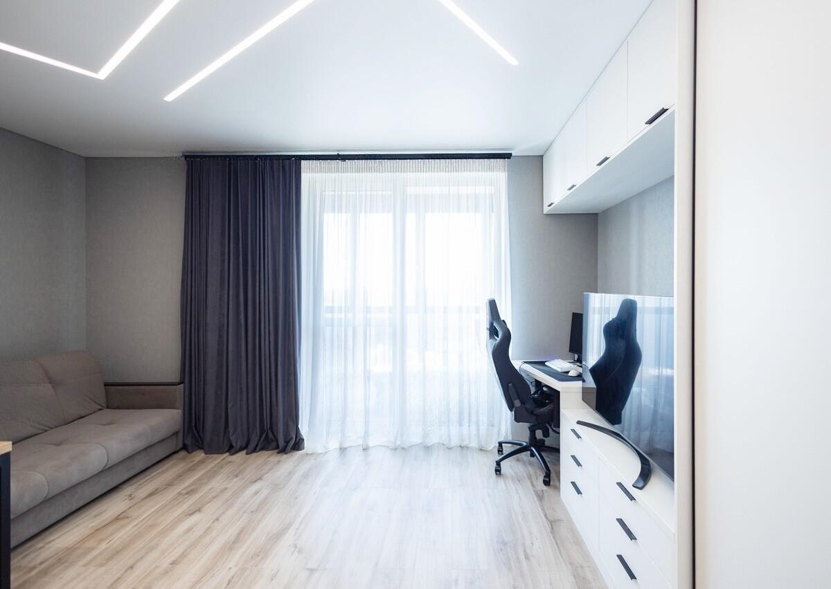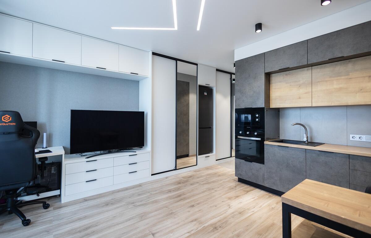 В студии выполнен современный, стильный ремонт с использованием качественных материалов, функциональная кухня, вместительный шкафы, большой совмещённый санузел, просторная застеклённая лоджия.