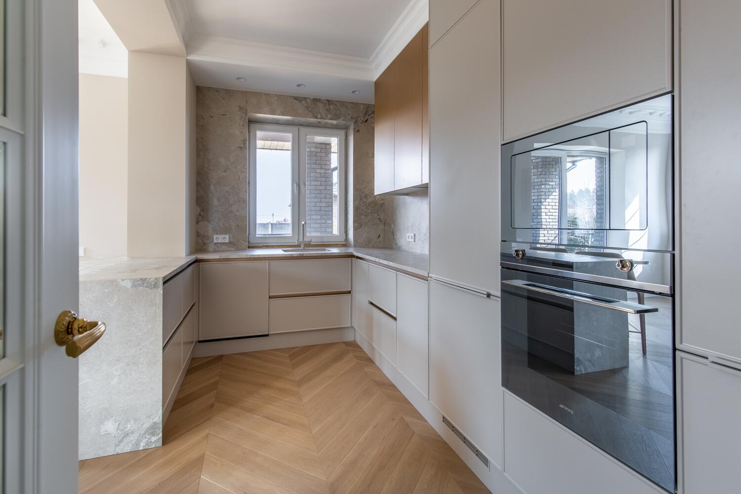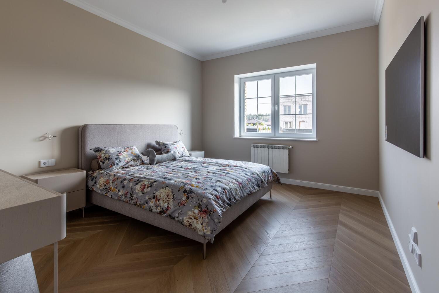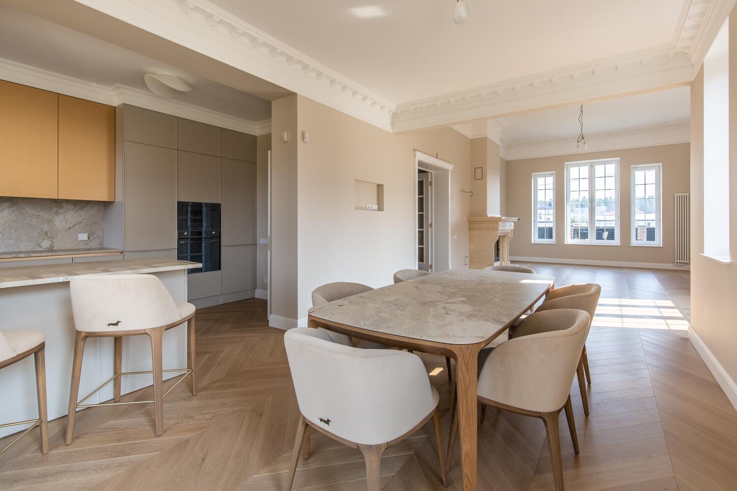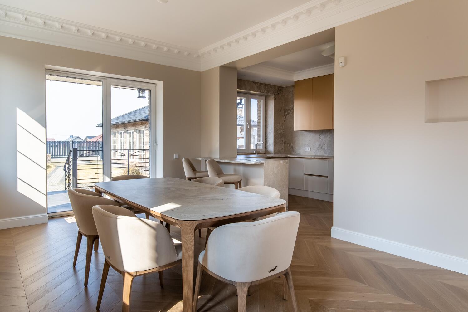 Внутри — пространство, в котором уже хочется жить. Кухня-гостиная с потолками почти 4 метра, камин, выход на террасу. Техника Smeg, Liebherr, Siemens, столешница из камня, обеденный стол из массива. Мастер-спальня с гардеробной и санузлом изолирована от остальных зон — своя тихая территория на первом этаже.