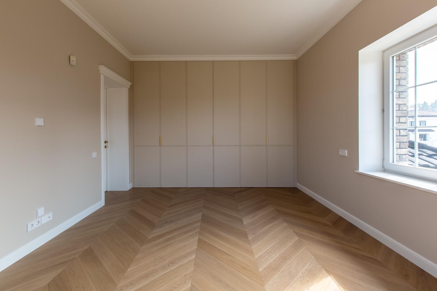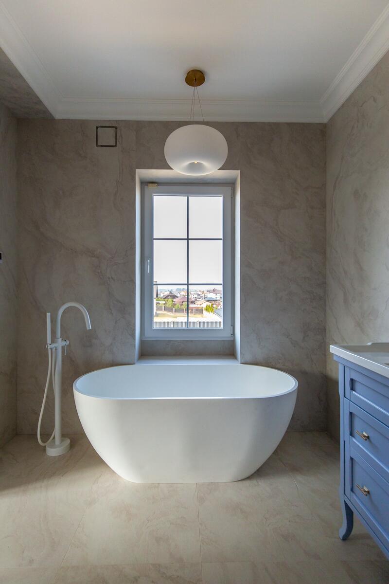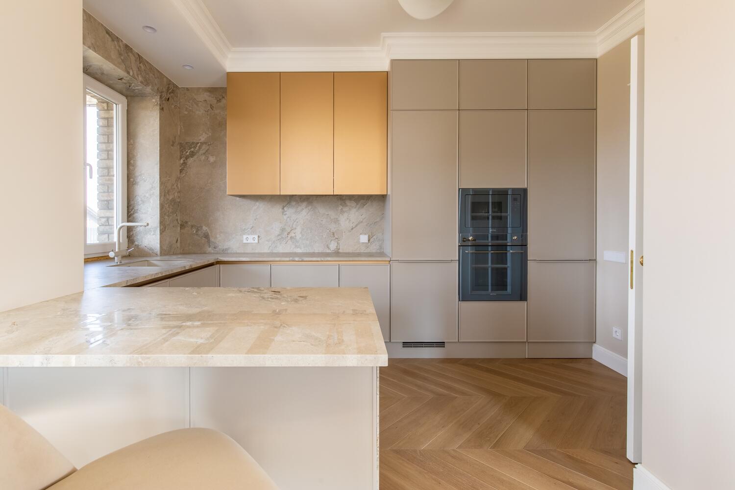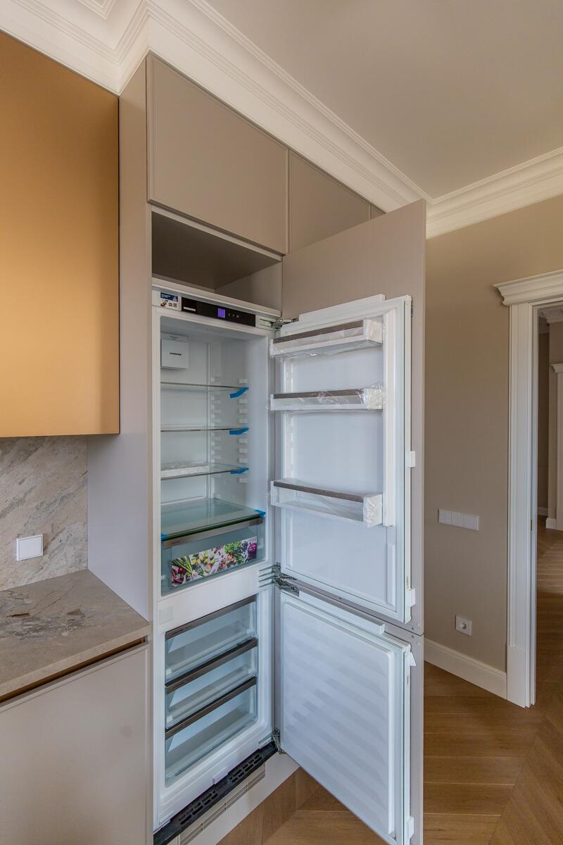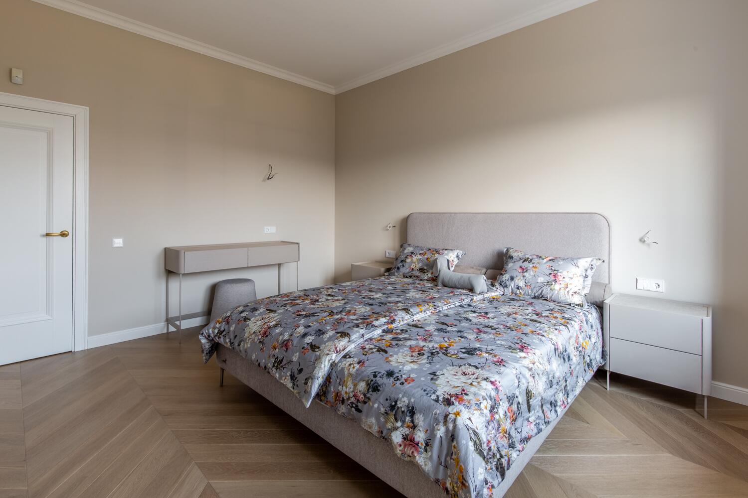 Внутри — пространство, в котором уже хочется жить. Кухня-гостиная с потолками почти 4 метра, камин, выход на террасу. Техника Smeg, Liebherr, Siemens, столешница из камня, обеденный стол из массива. Мастер-спальня с гардеробной и санузлом изолирована от остальных зон — своя тихая территория на первом этаже.