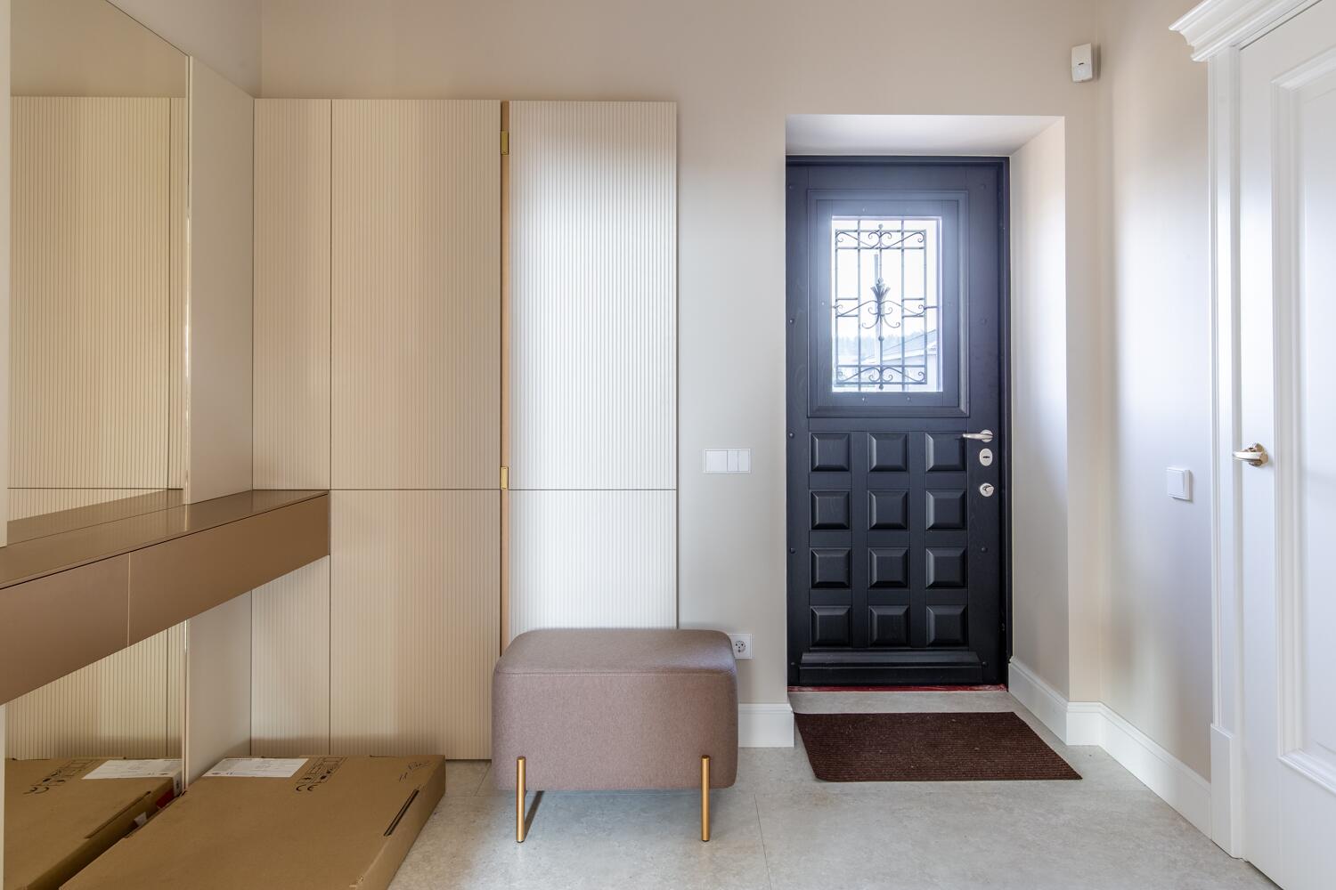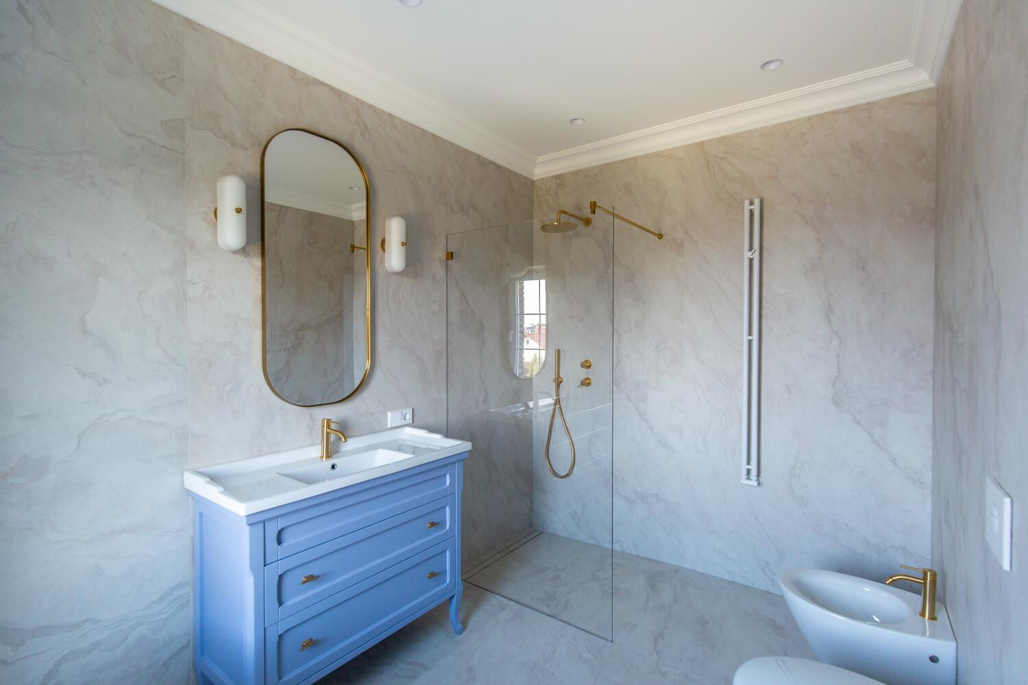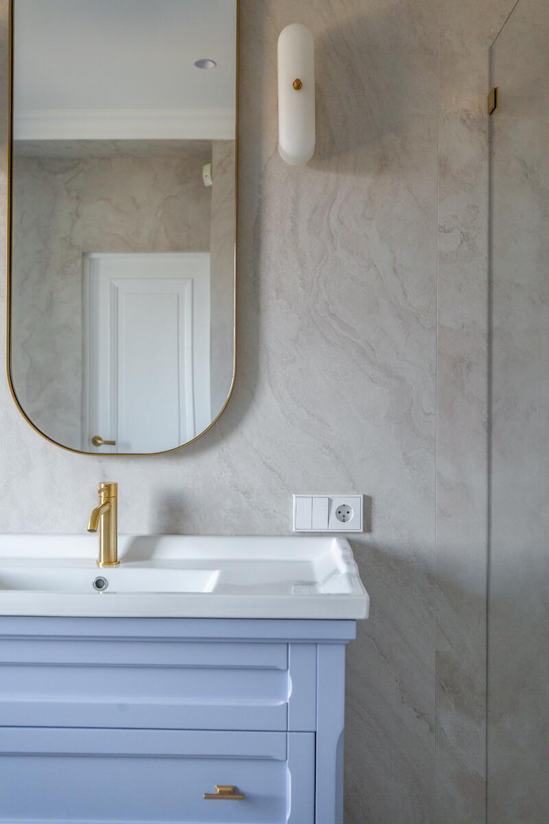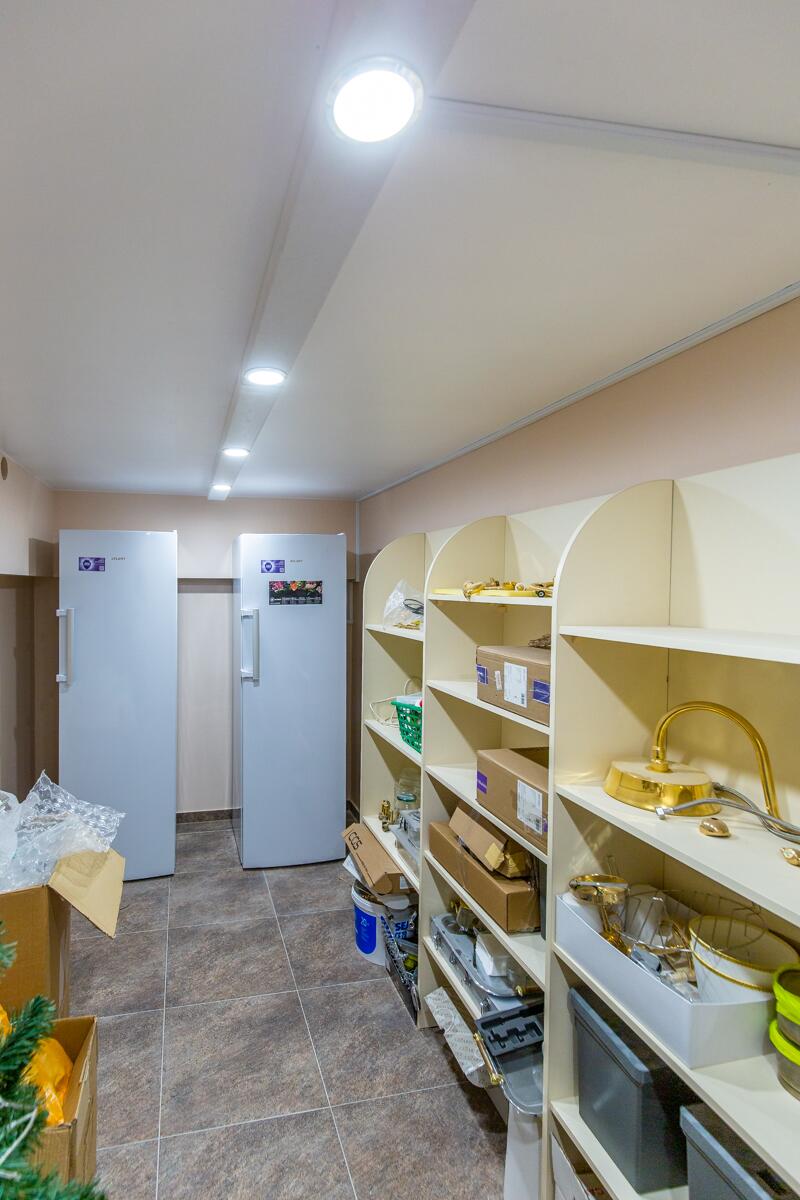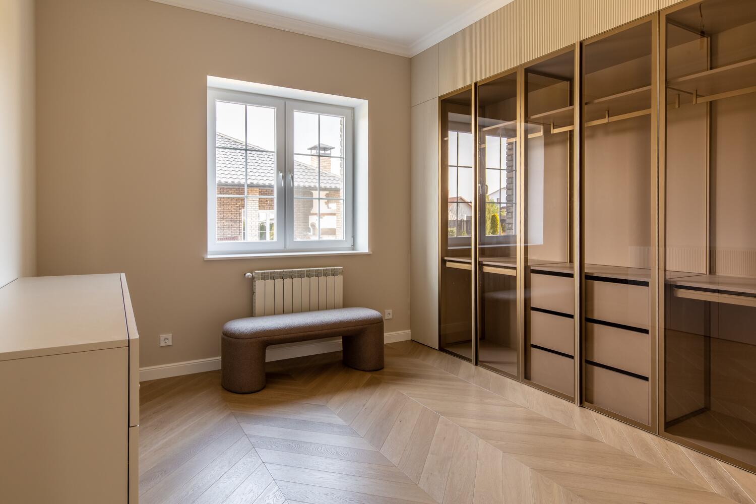 Внутри — пространство, в котором уже хочется жить. Кухня-гостиная с потолками почти 4 метра, камин, выход на террасу. Техника Smeg, Liebherr, Siemens, столешница из камня, обеденный стол из массива. Мастер-спальня с гардеробной и санузлом изолирована от остальных зон — своя тихая территория на первом этаже.
