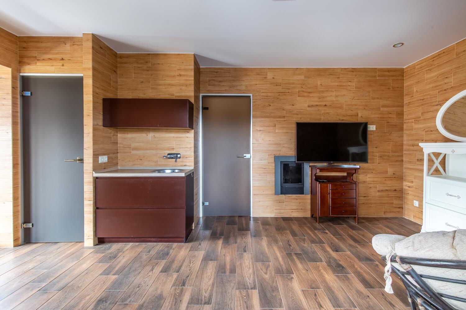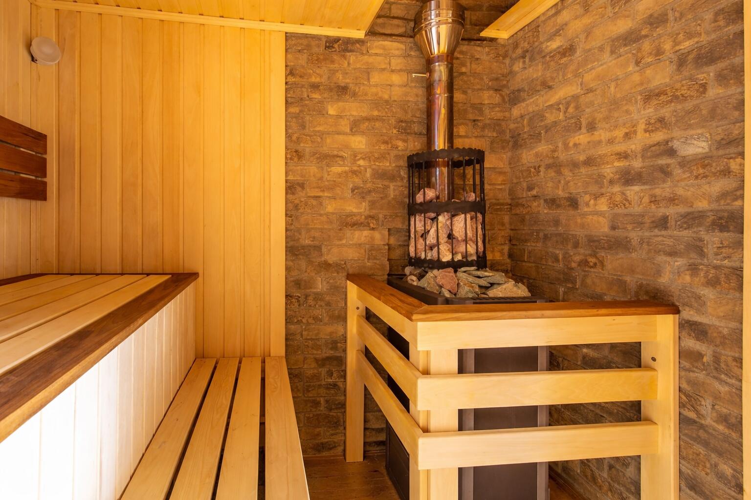 Банный дом — отдельная история: дровяная парная, бассейн, кухня, терраса с печью и барбекю. Полноценное второе пространство для жизни.