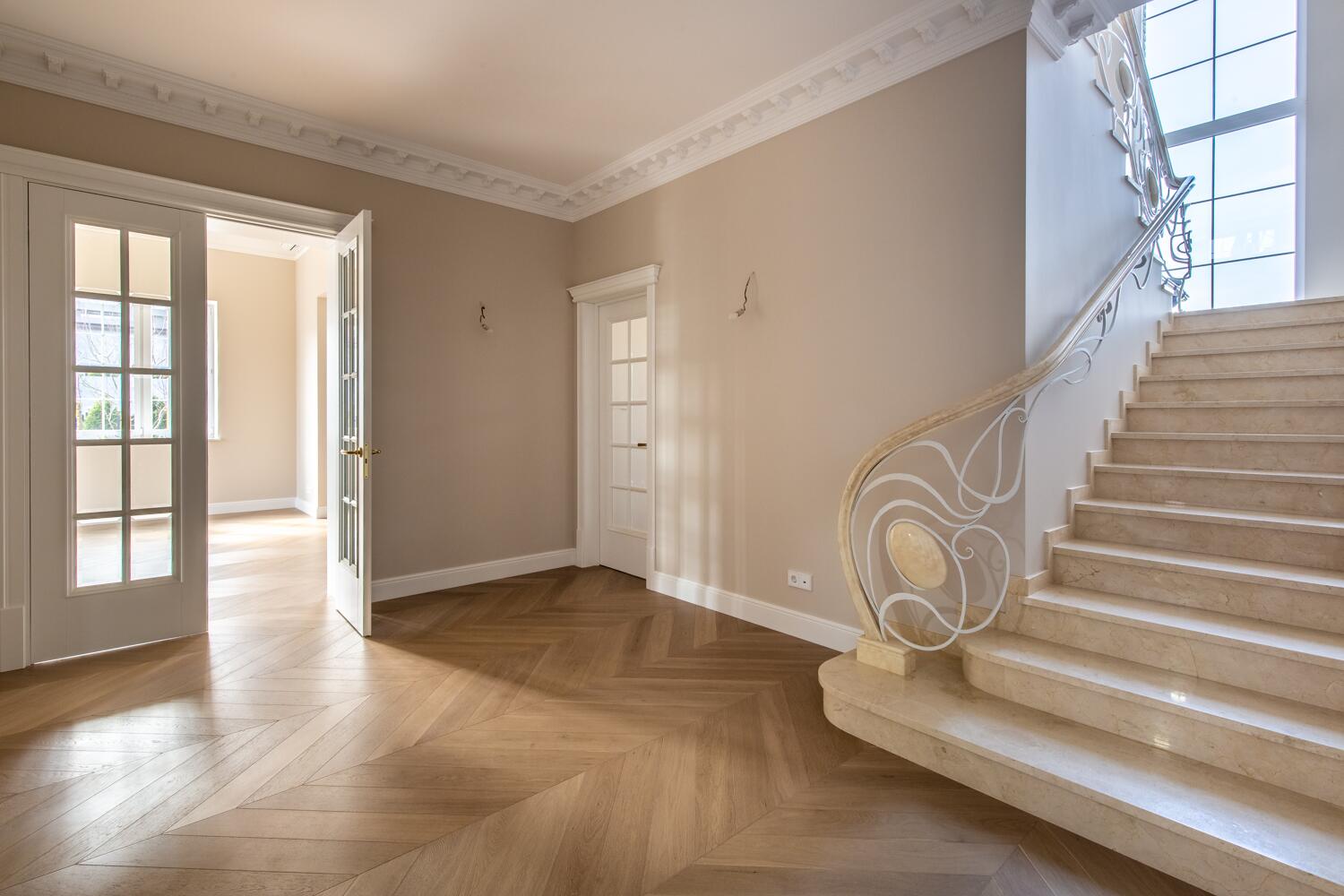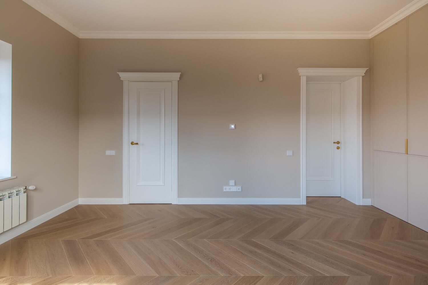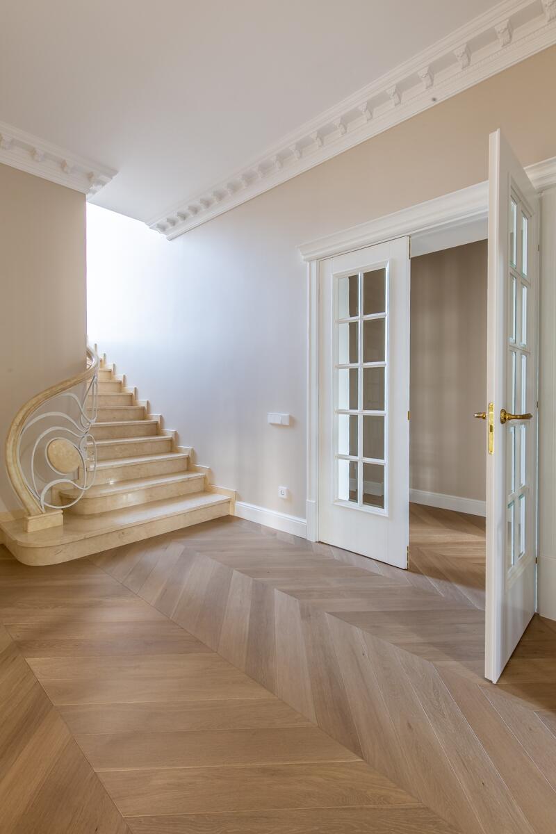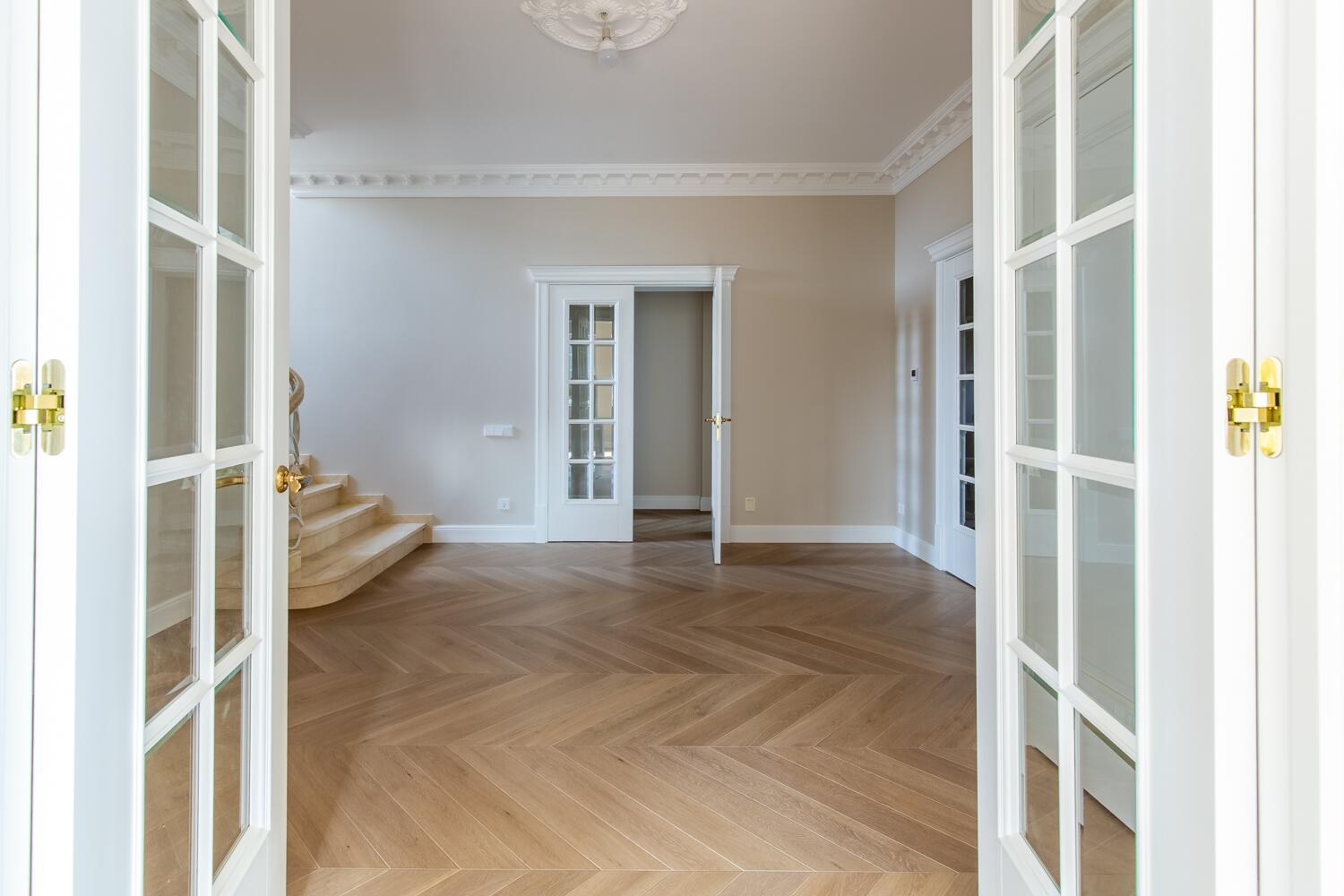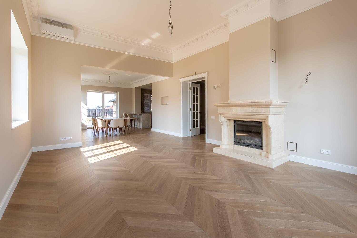 Отделка — дубовый паркет, гипсовая лепнина, итальянское освещение, двери из натурального дерева. Мебель в доме: Domani, Sofa Club.