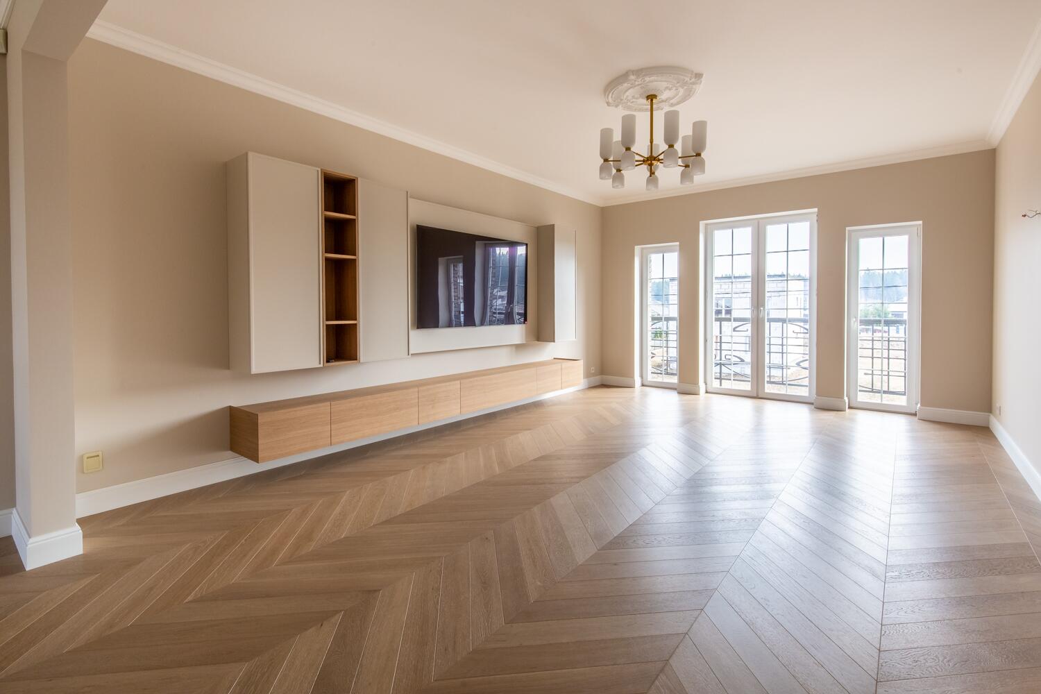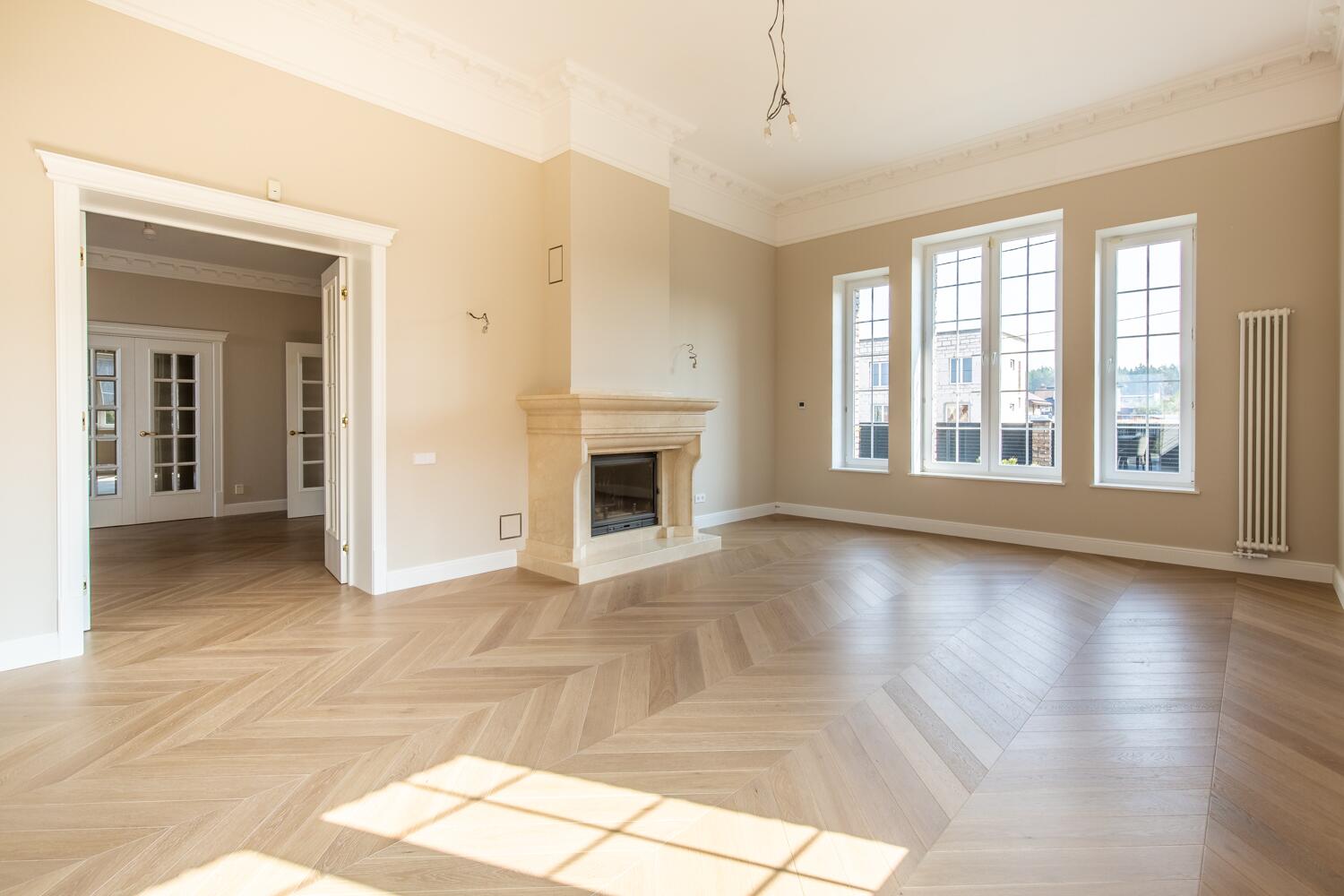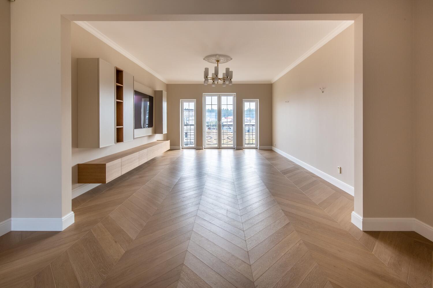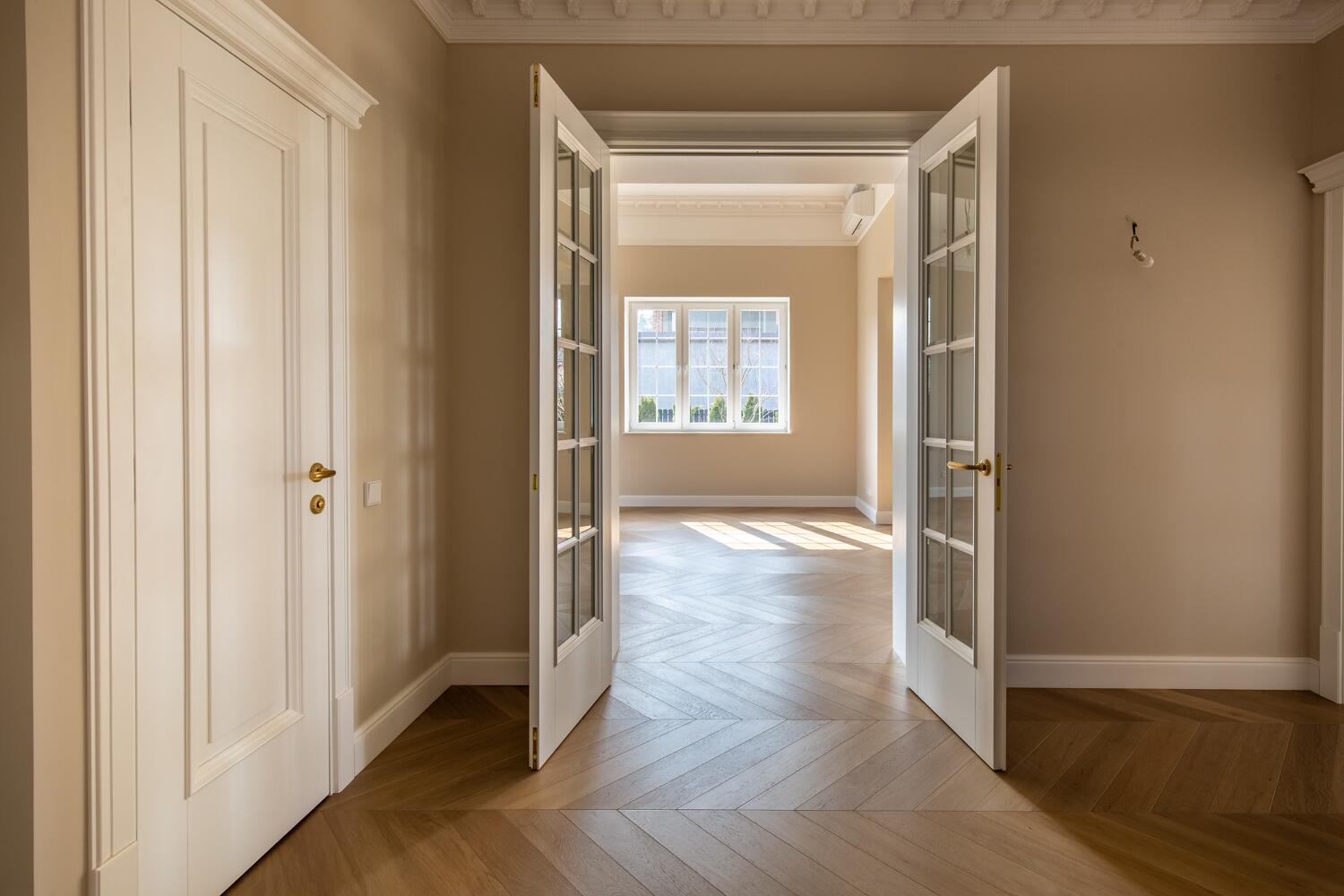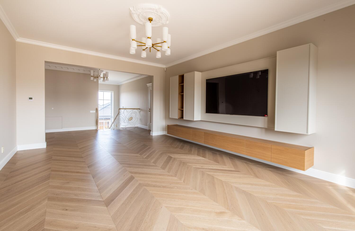 Отделка — дубовый паркет, гипсовая лепнина, итальянское освещение, двери из натурального дерева. Мебель в доме: Domani, Sofa Club.