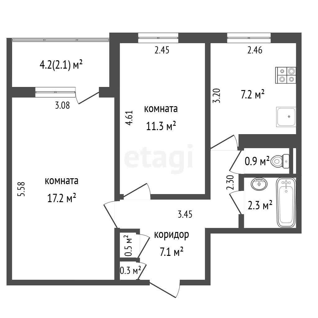 Общая площадь 48,9 кв.м.. по СНБ. Две изолированные комнаты – 17,2 кв.м. и 11.3 кв.м.. Раздельный санузел. Кухня – 7.2 квм.. Большая лоджия застеклена. На окнах стеклопакеты, на полу плитка и ламинат.