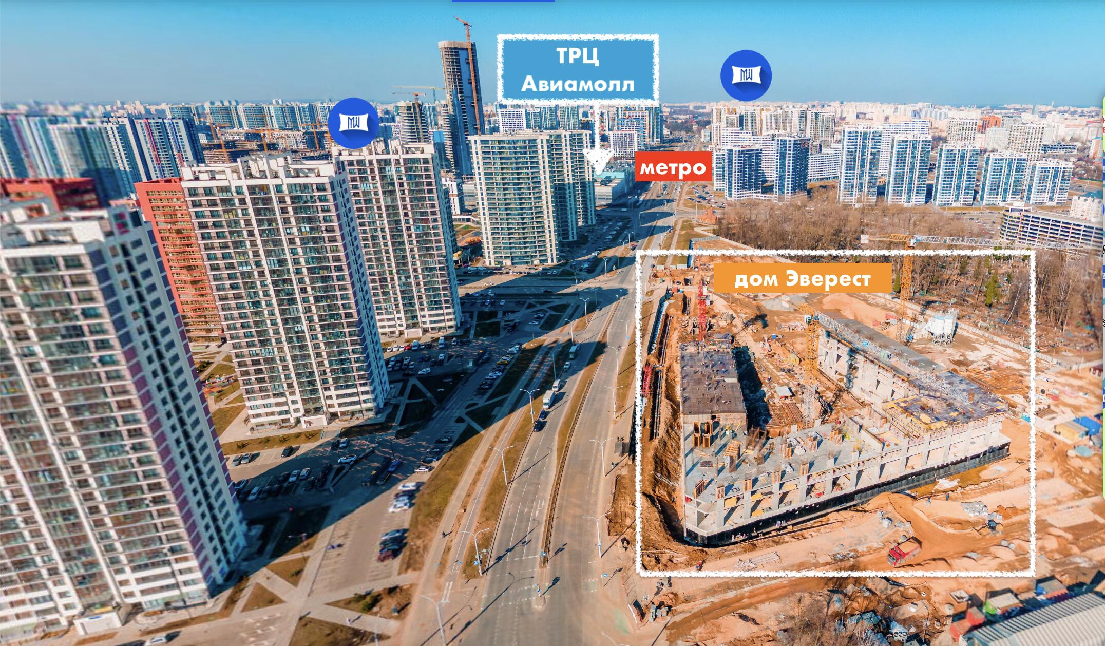 станция метро «Аэродромная», Международный финансовый коммерческий центр, торгово-общественный центр «Авиа Молл». В доме«Эверест» предусмотрены встроенные административно-торговые помещения на 1 этаже, бизнес-апартаменты со 2 по 15 этаж и подземный одноуровневый гараж-стоянка на 239 машино-мест с зарядными станциями для электромобилей, помещениями для хранения велосипедов и мототехники в местах общего пользования.