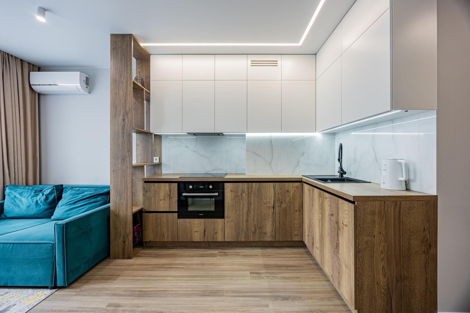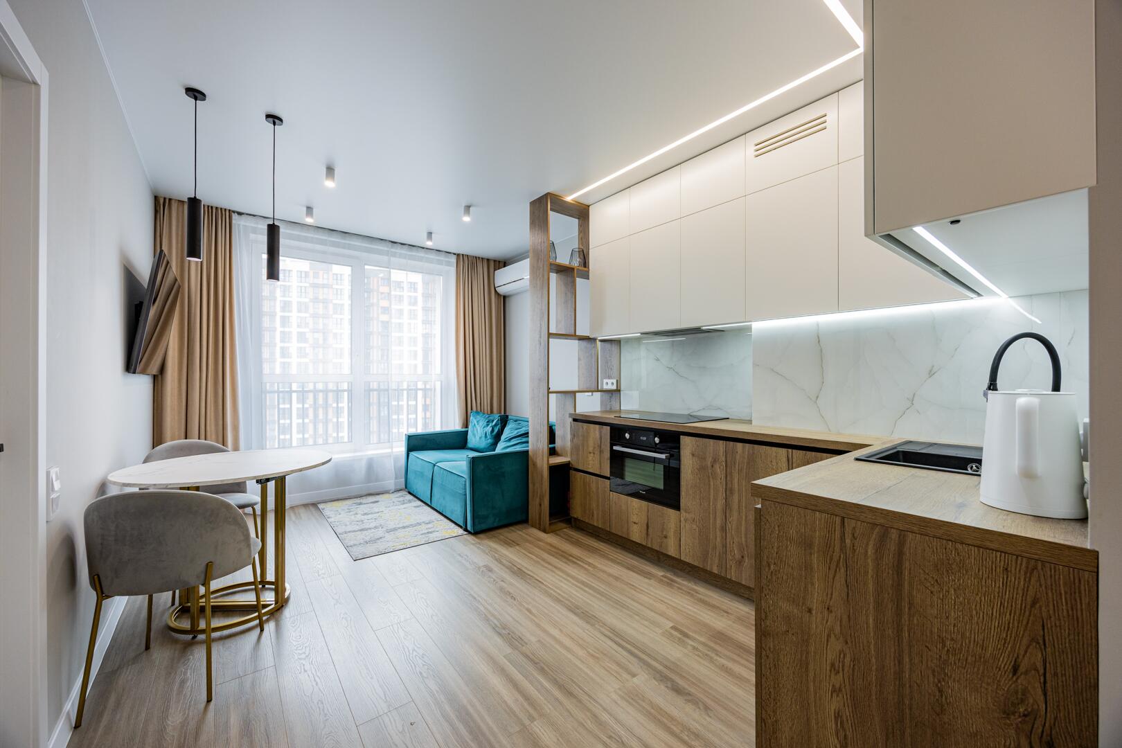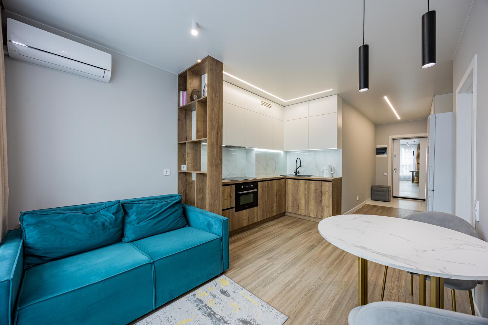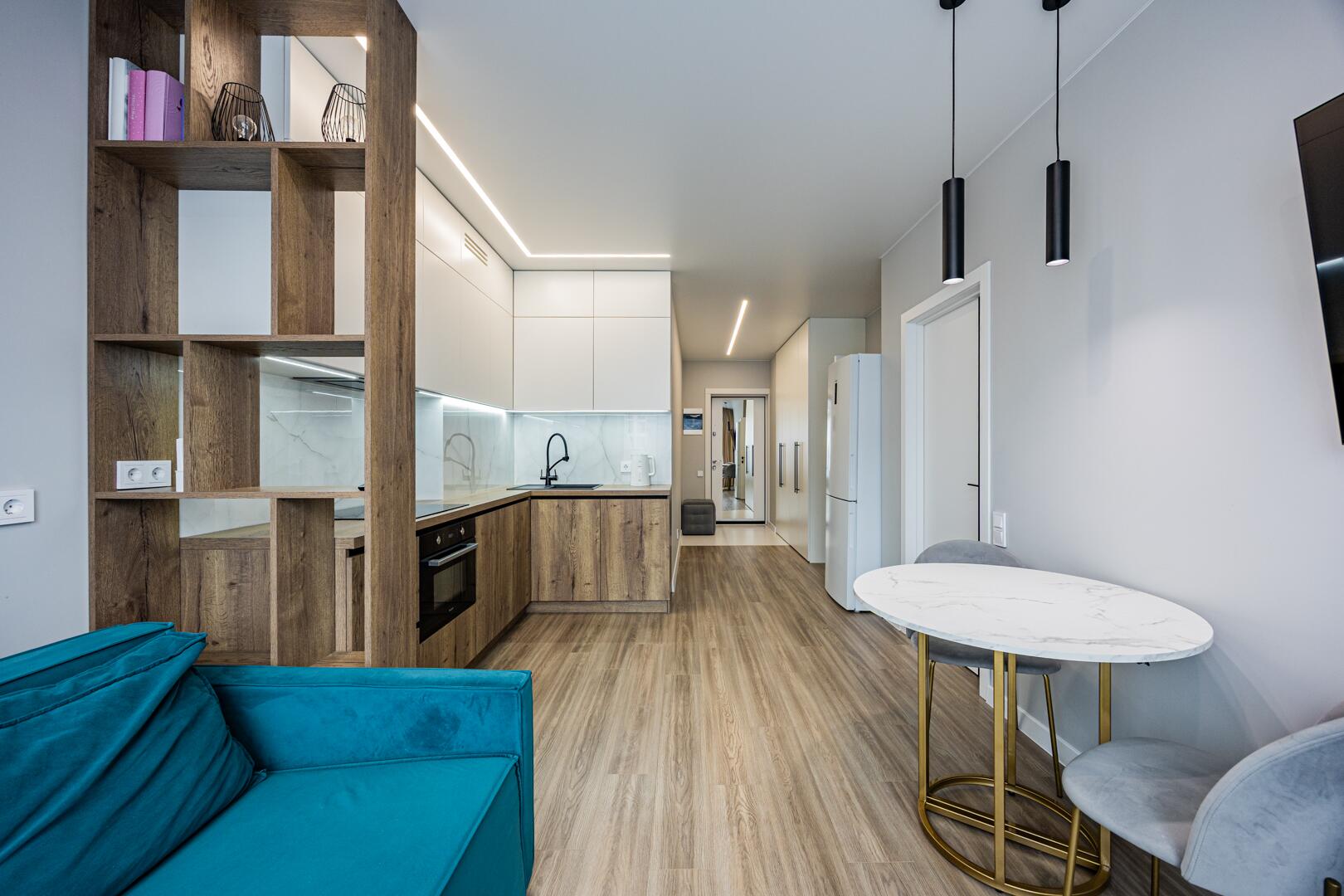 ∙ В кухне-гостиной комфортный диван, кухонный стол с раскладной системой.