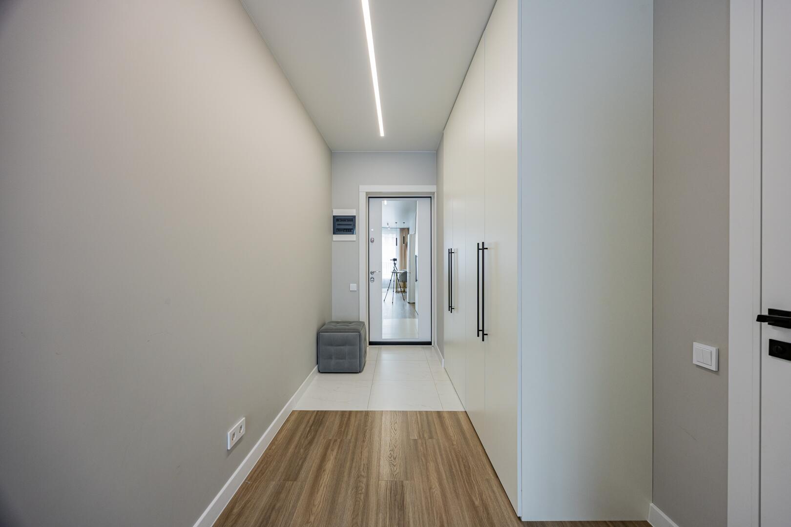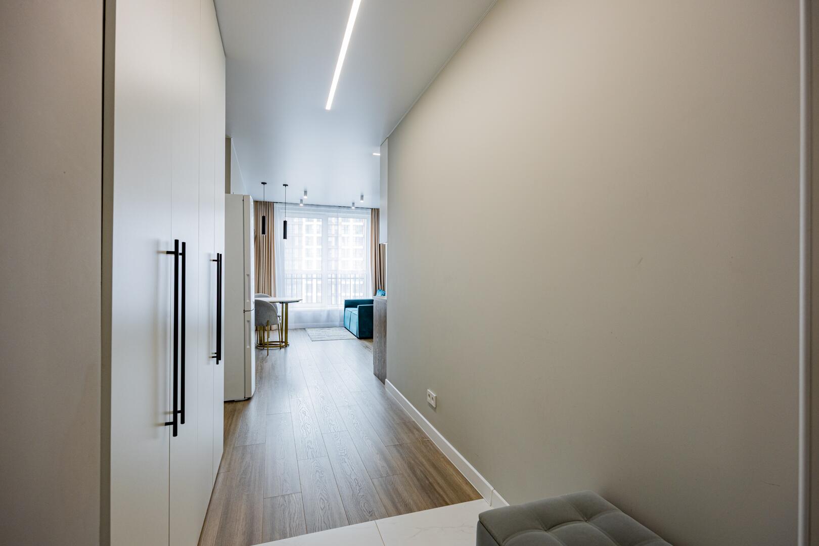 ∙ В прихожей вместительный встроенный шкаф-купе, встроенная кухня с крашенными фасадами МДФ, со всей техникой: электрическая индукционная плита, вытяжка, холодильник, встроенный духовой шкаф с функцией микроволновой печи.