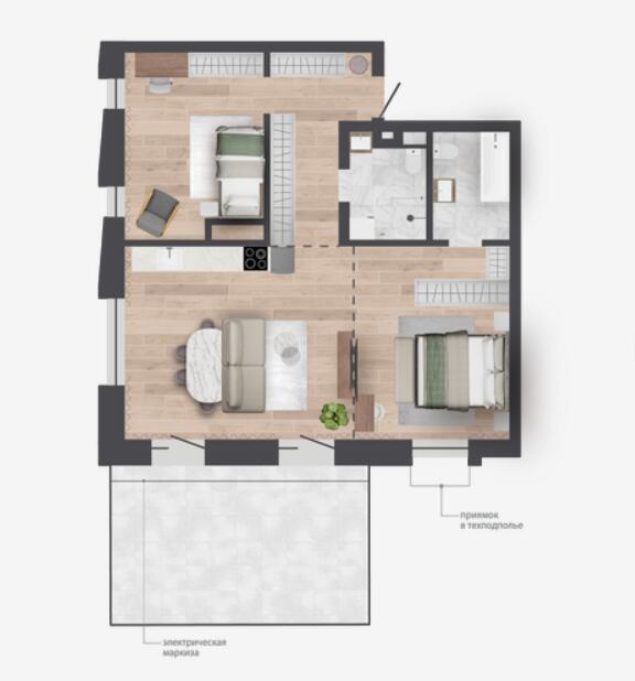 Рядом благоустроенная прогулочная зона и зелёный коридор с воркаут и баскетбольной площадкой. Выходя из дома, вы попадаете не в промзону, а в пространство для активного и спокойного отдыха.