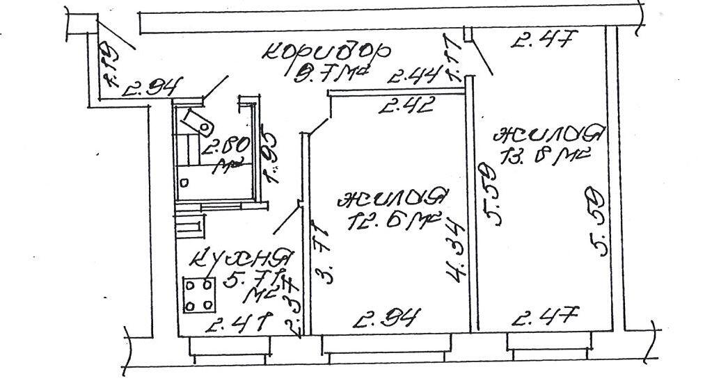 Параметры: 44,61(СНБ)44,61/26,4/5,71 санузел совмещен, прихожая -9,7м, высота потолка-2,5м.