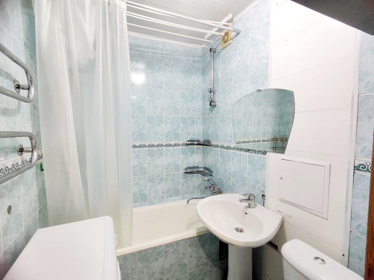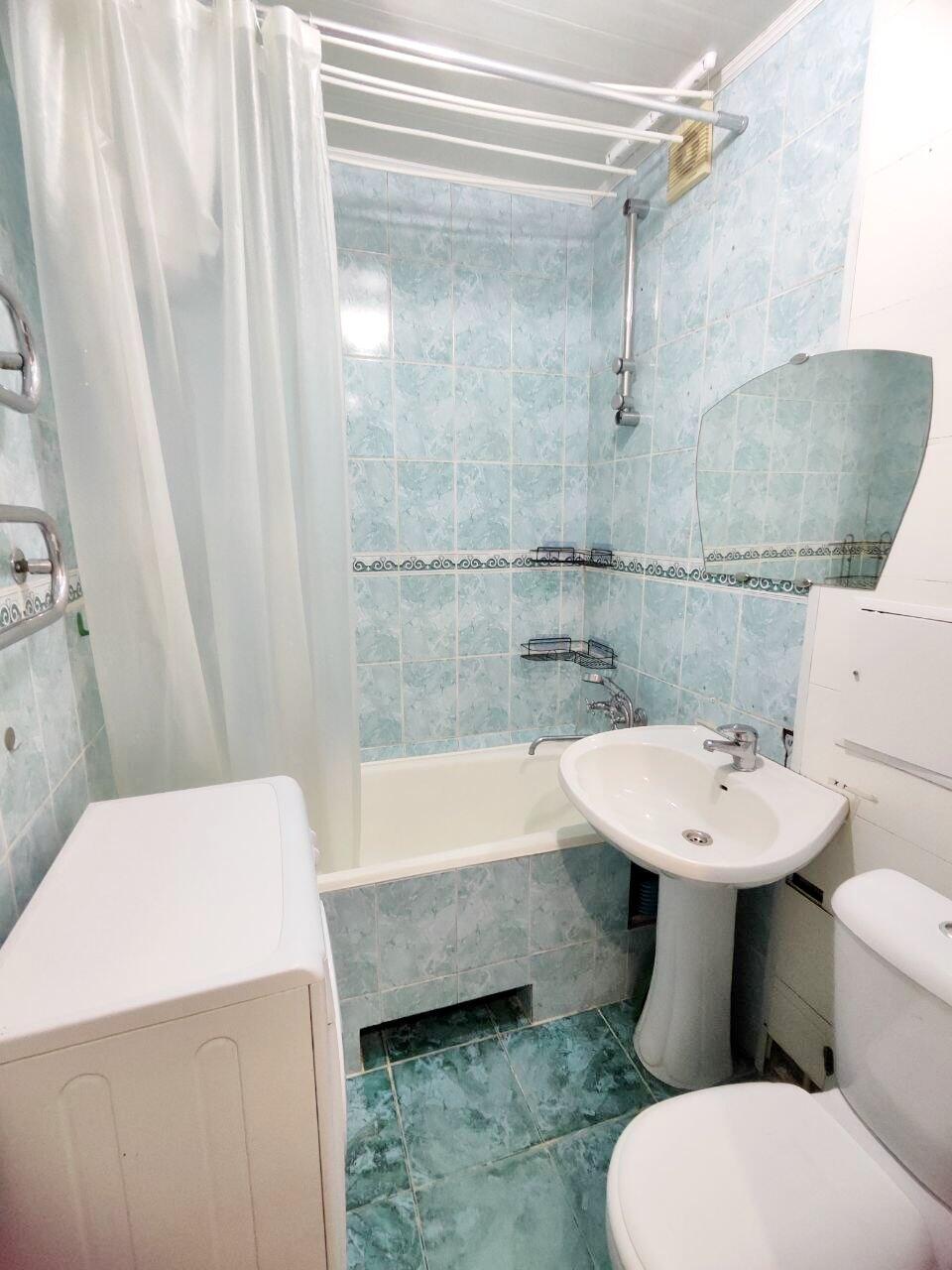 Санузел отделан керамической плиткой, установлена стиральная машина.