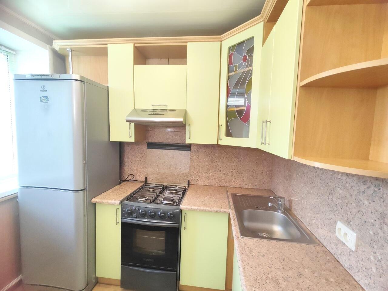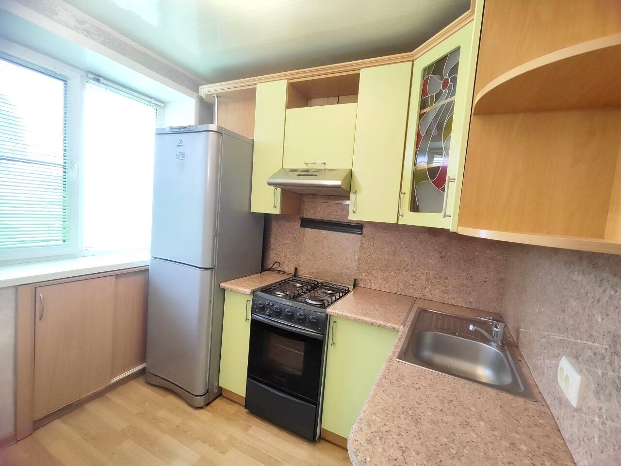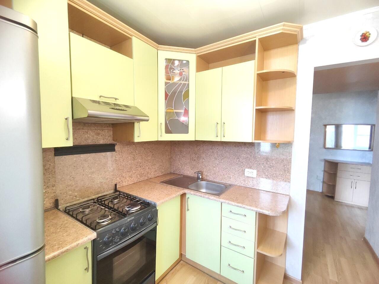 Встроенная кухня с бытовой техникой (газовая плита, вытяжка, холодильник).