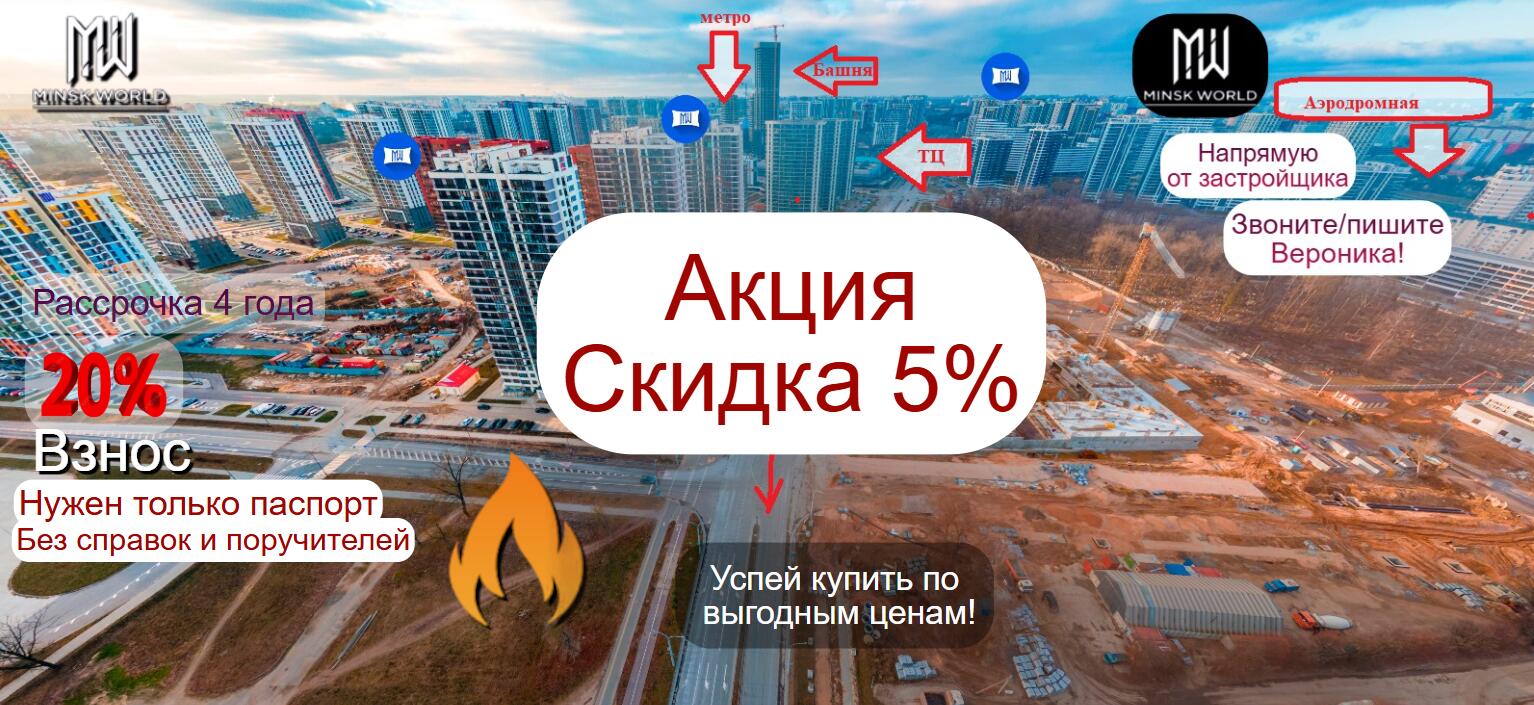 Без комиссии агентству! Рассрочка от застройщика Рассрочка от застройщика в Минске до 48 месяцев Первый взнос от 20% Без справок и поручителей Возможна покупка апартаментов от застройщика в рассрочку При полной оплате: 90% + 10% после сдачи дома Характеристики апартаментов Minsk World Площади от 26 до 71 м2 Свободная планировка апартаментов Высота потолков 2,7 м Панорамные окна Лоджии...