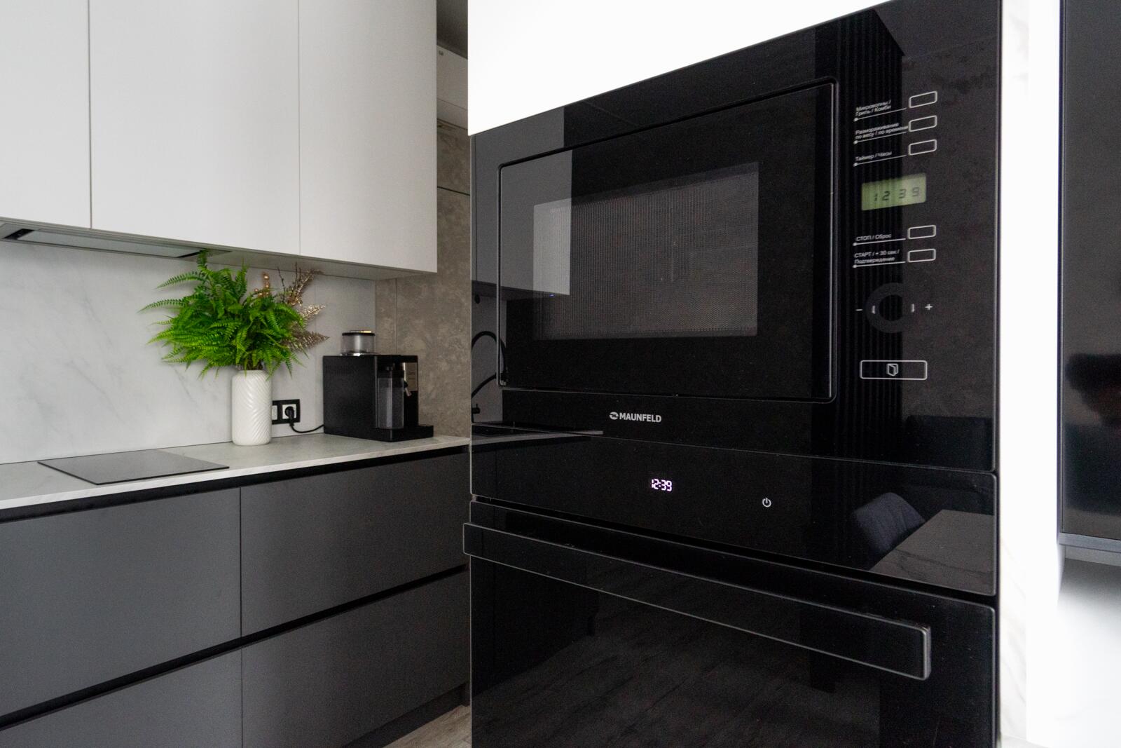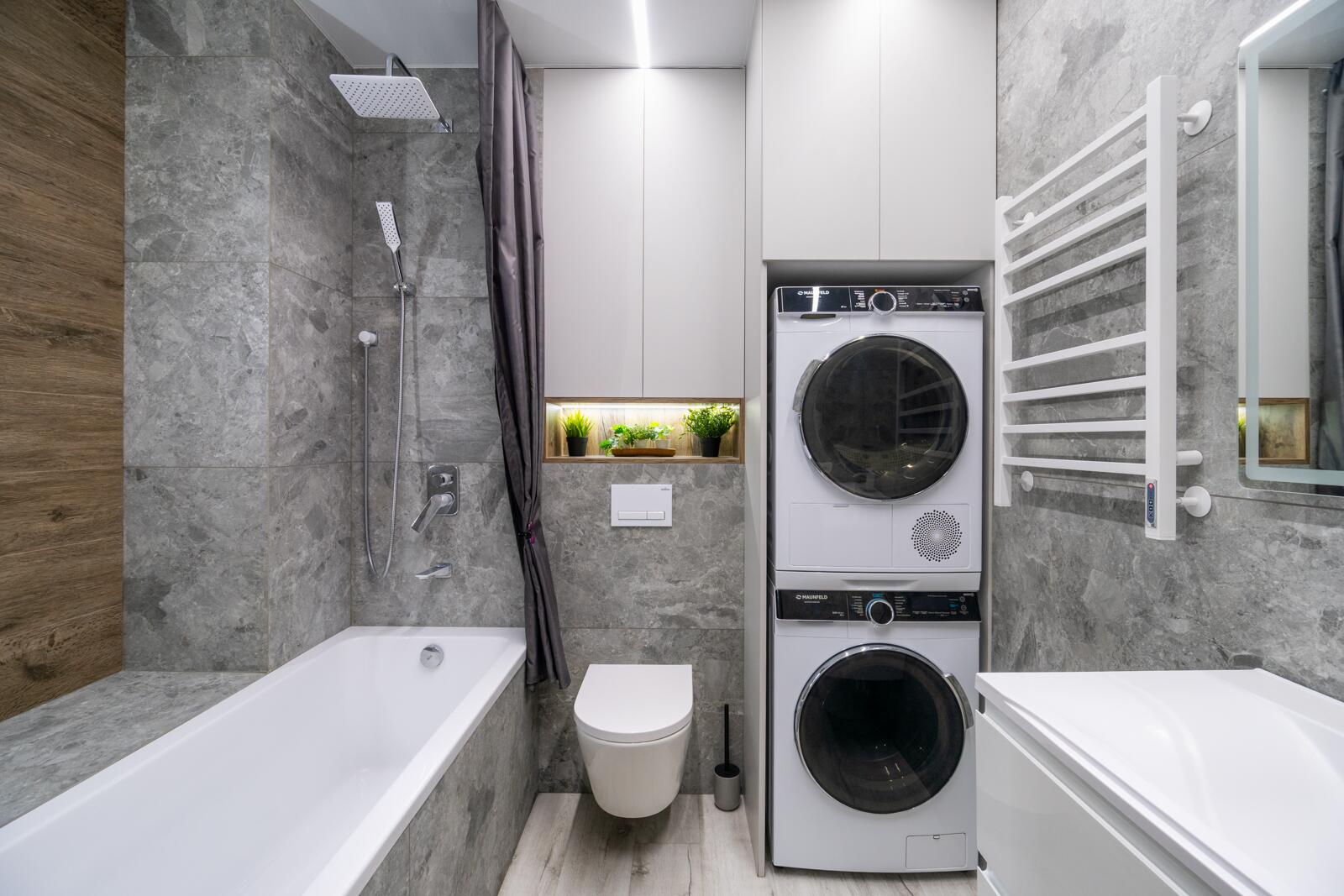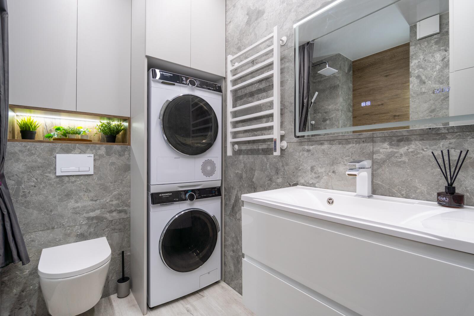 Для удобства в квартире установлены стиральная и сушильная машины Maunfeld — это современный бренд бытовой техники, который зарекомендовал себя как надежный и функциональный. Техника отличается стабильной работой, продуманными программами и хорошим соотношением цены и качества.