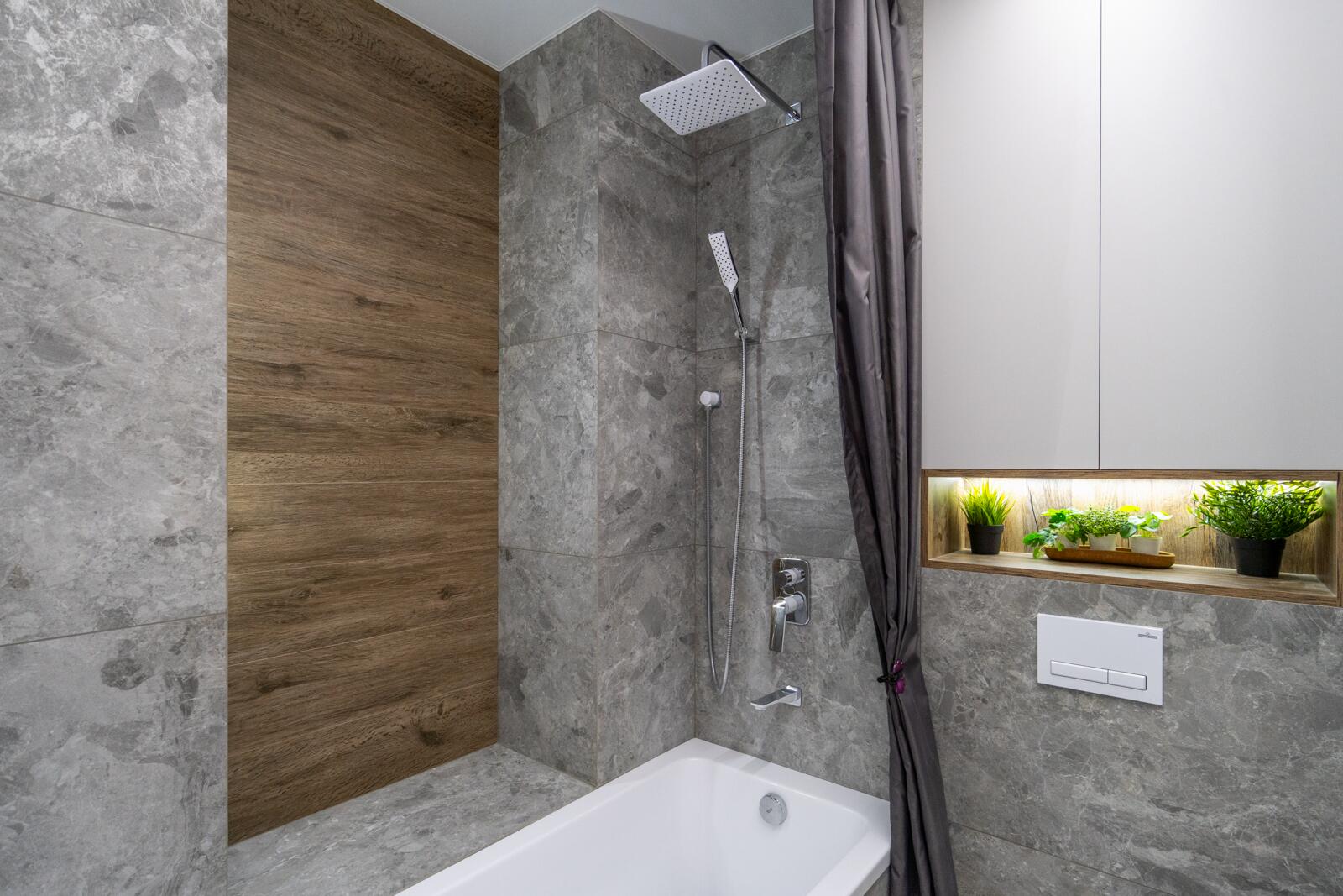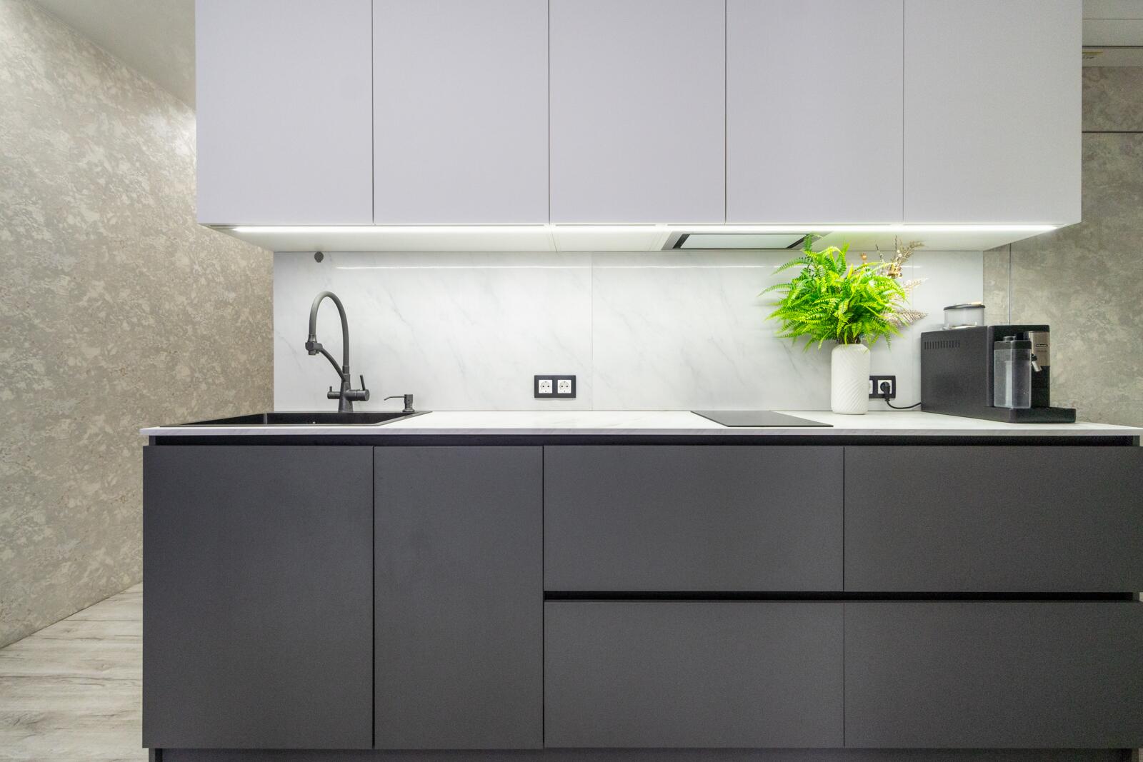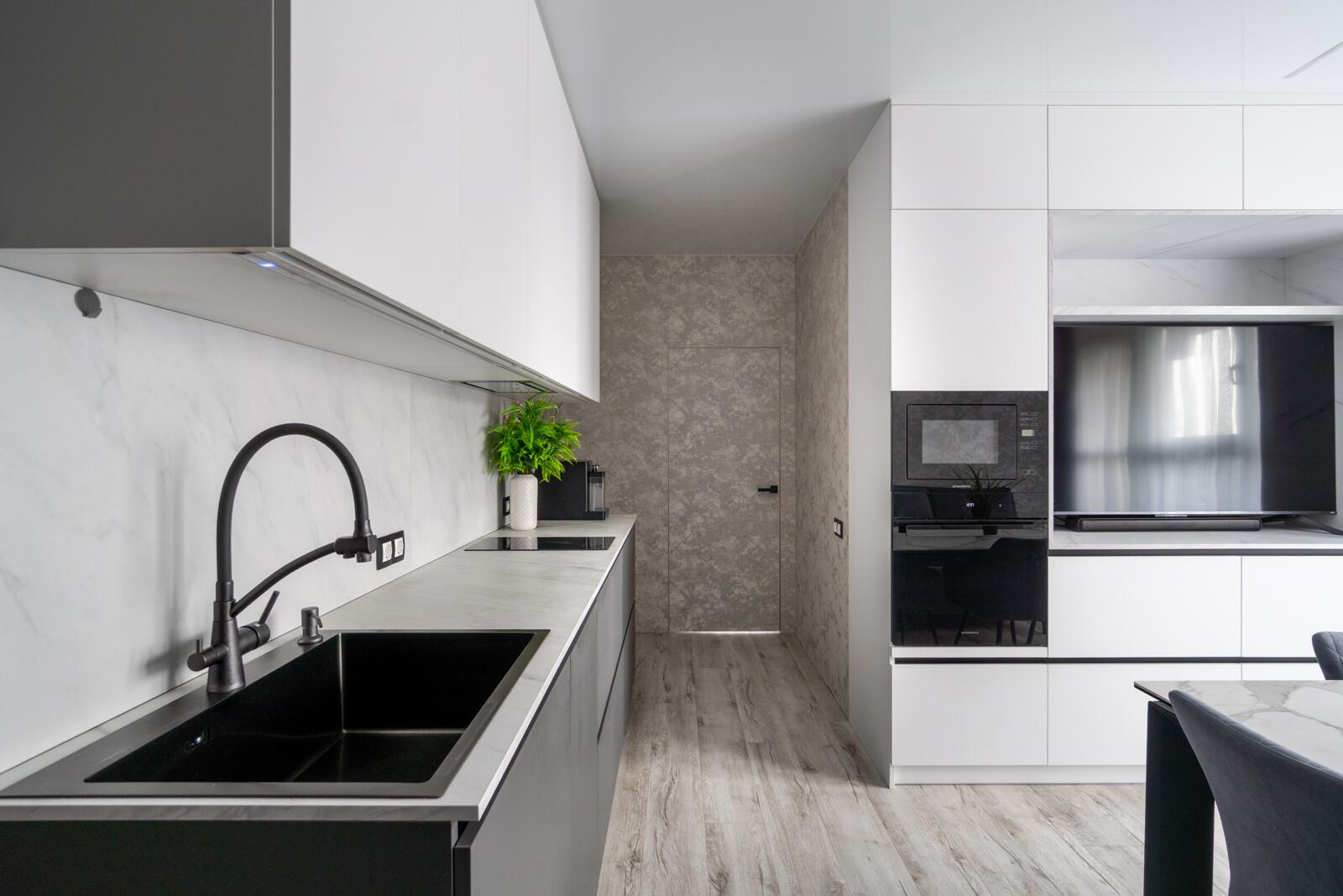 Отдельное внимание заслуживает напольное покрытие: использован современный материал, напоминающий винил, но с заводской подложкой на каждой дощечке. Это решение обеспечивает отличную шумоизоляцию, поглощает вибрации и абсолютно не боится влаги. Практичность и долговечность делают его покрытием «на годы», которое сохранит внешний вид даже при активной эксплуатации.