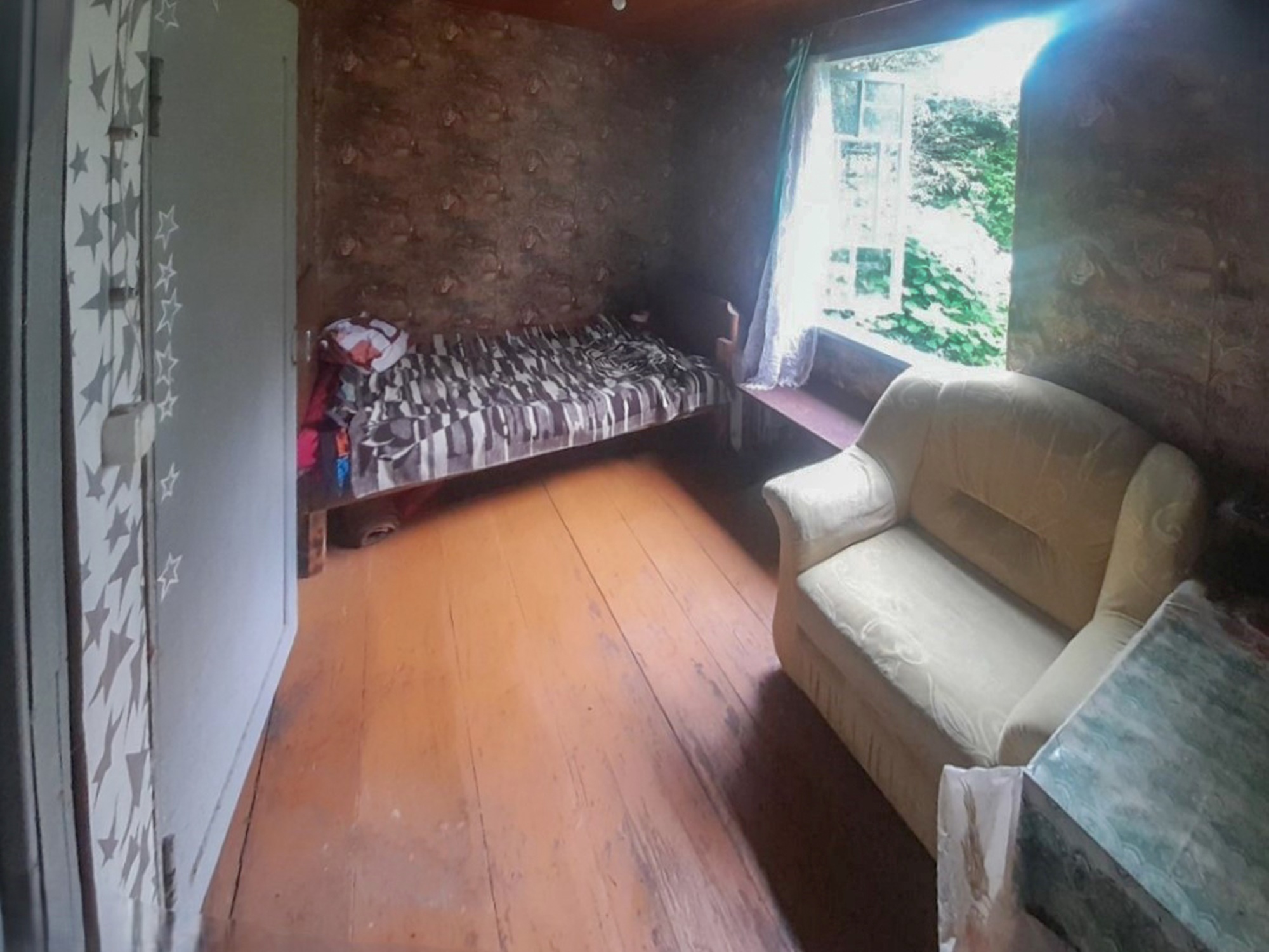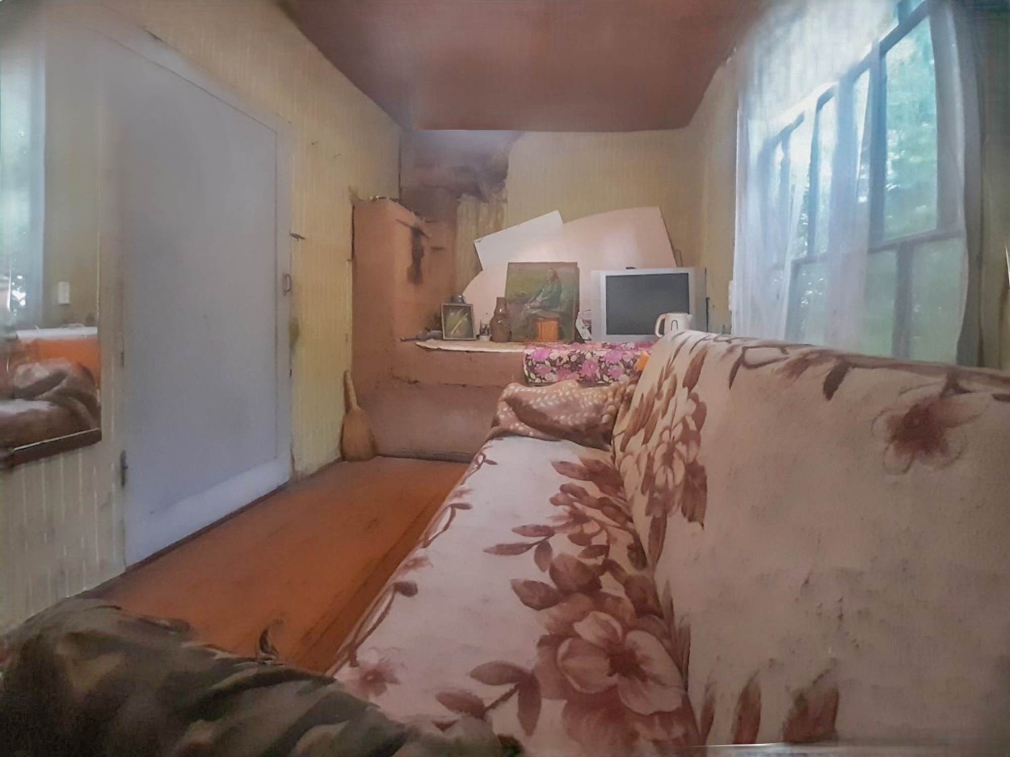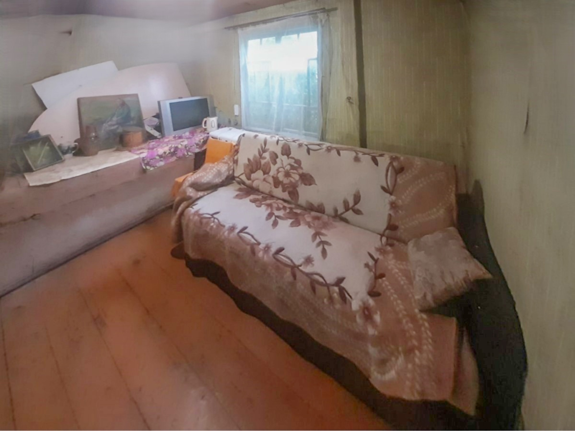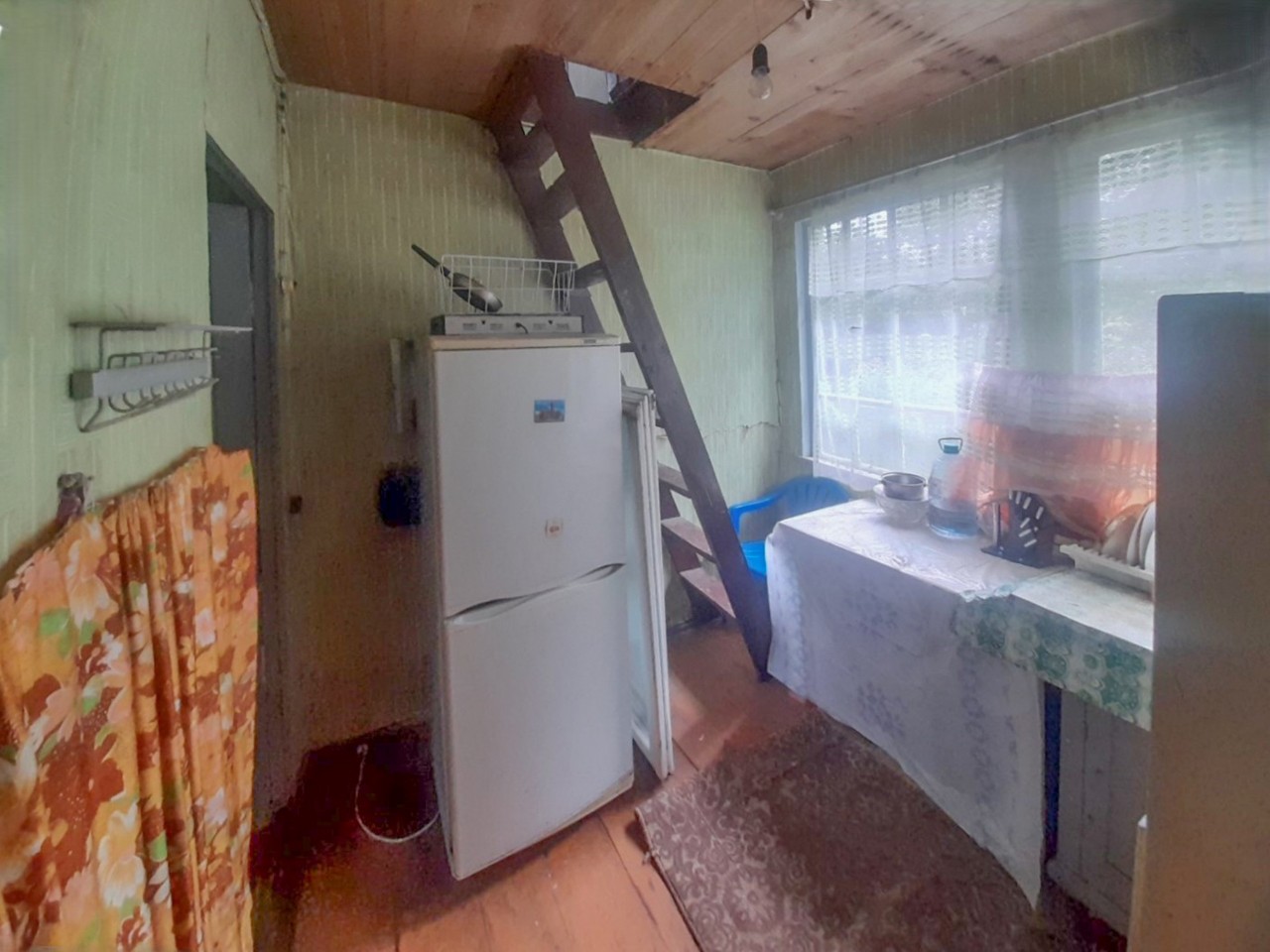Хороший добротный дом (5.1х6.7), построен из бруса, утеплен, крыша шифер, два уровня. Общая площадь 51.4м2. Площадь жилая 40.8 м2 представлена тремя небольшими комнатами на первом этаже и просторной комнатой на втором. Площадь кухни 6.1м2.