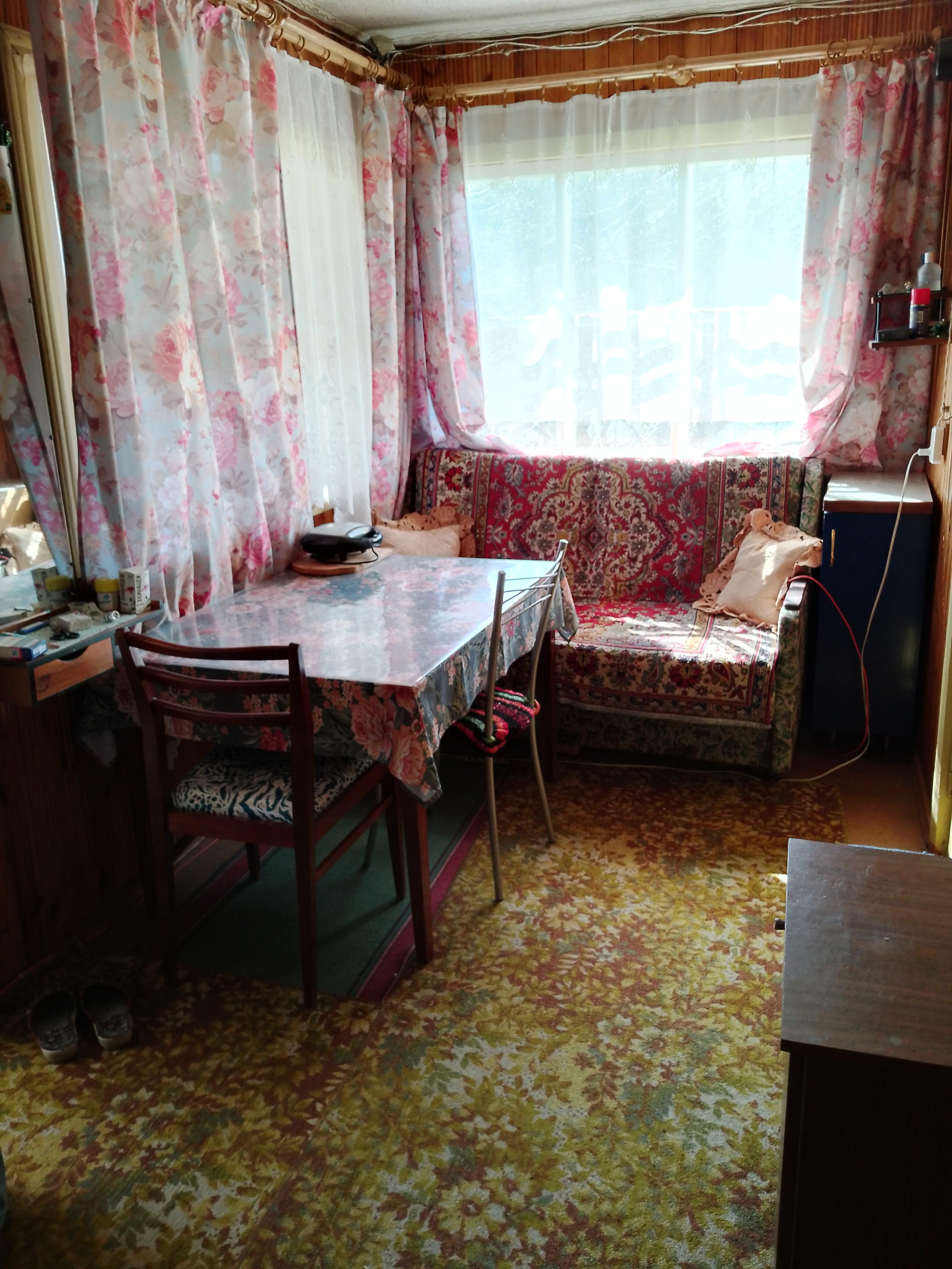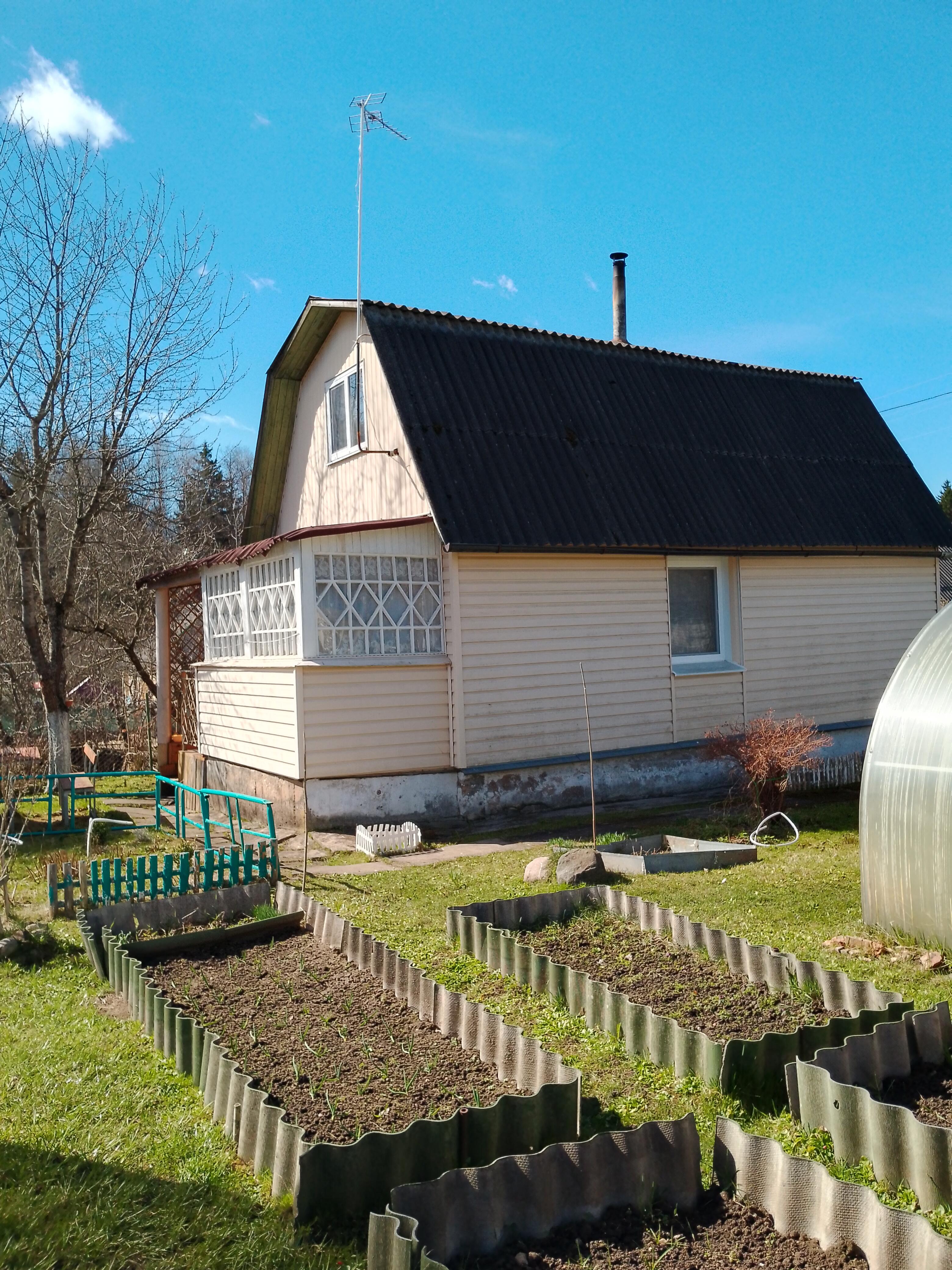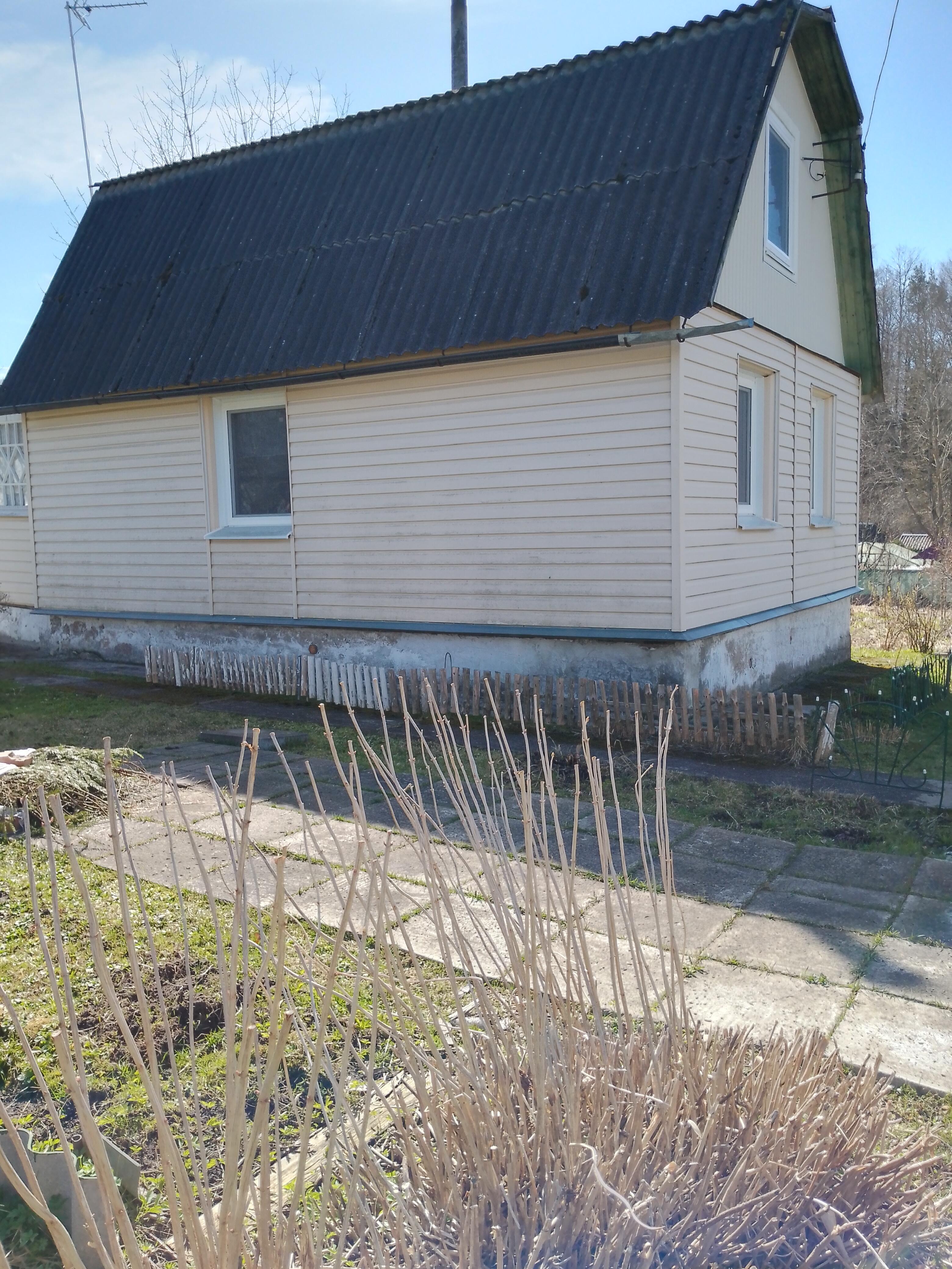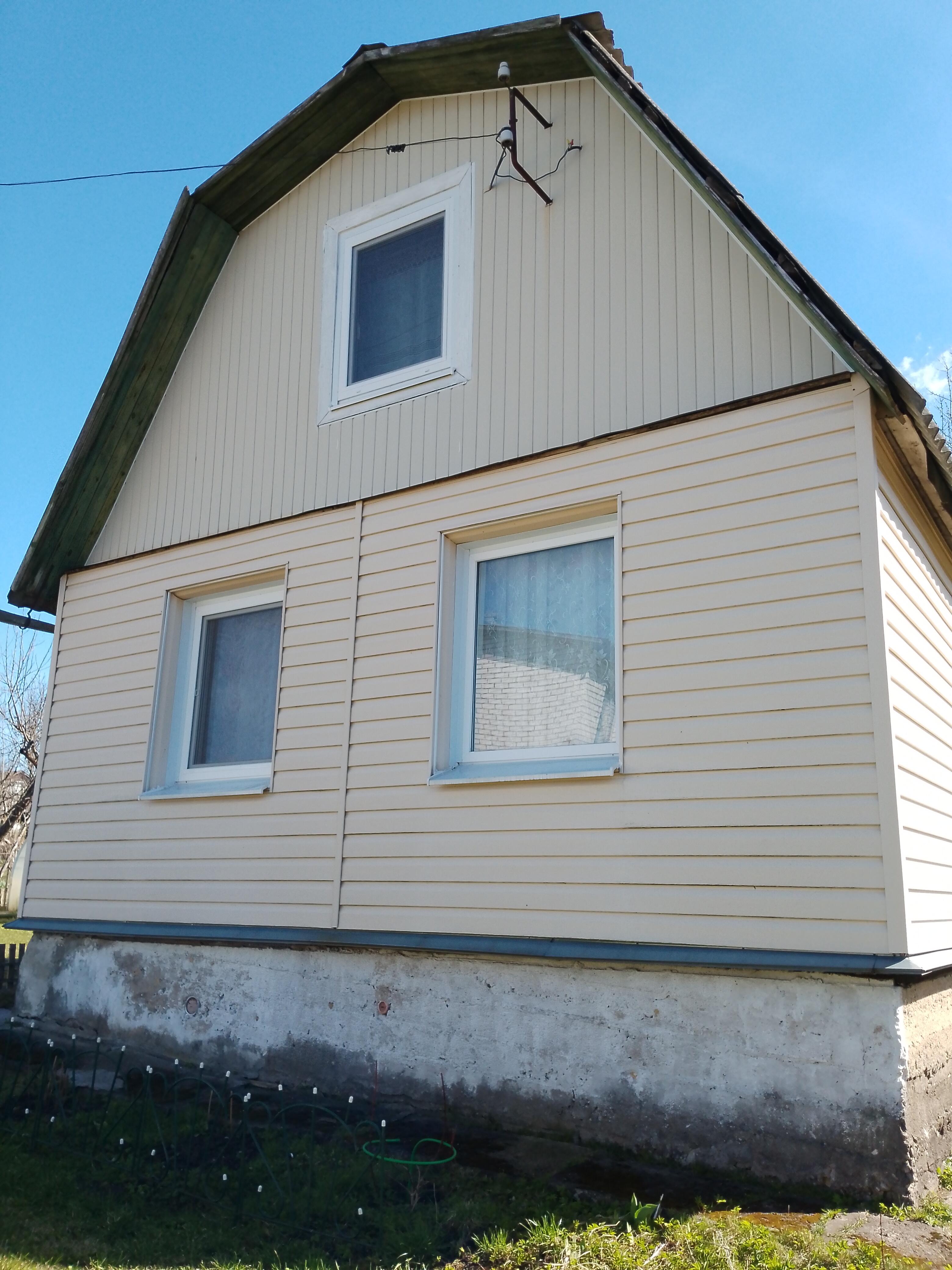Дача - 41 кв.м., три жилые комнаты (10.9м.кв. + 13.3 м.кв.71 м.кв.), кухня (5.2 м.кв.), веранда (4.6 м.кв.). Высокий бетонный фундамент. Дом изначально каркасно-засыпной, обложен кирпичом + обшит панелями ПВХ с утеплением. Перекрытия деревянные, полы дощатые, кровля из шифера. Оконные проемы – стеклопакеты ПВХ + деревянные двойные рамы. В доме есть рабочая печь, обогревающая весь первый этаж. В кухне: настольная газовая плита на 2 конфорки (газовый баллон), набор кухонной мебели, мойка с тумбой и электрическим водонагревателем, стол кухонный. В жилых комнатах остаётся мягкая мебель и кровати.
