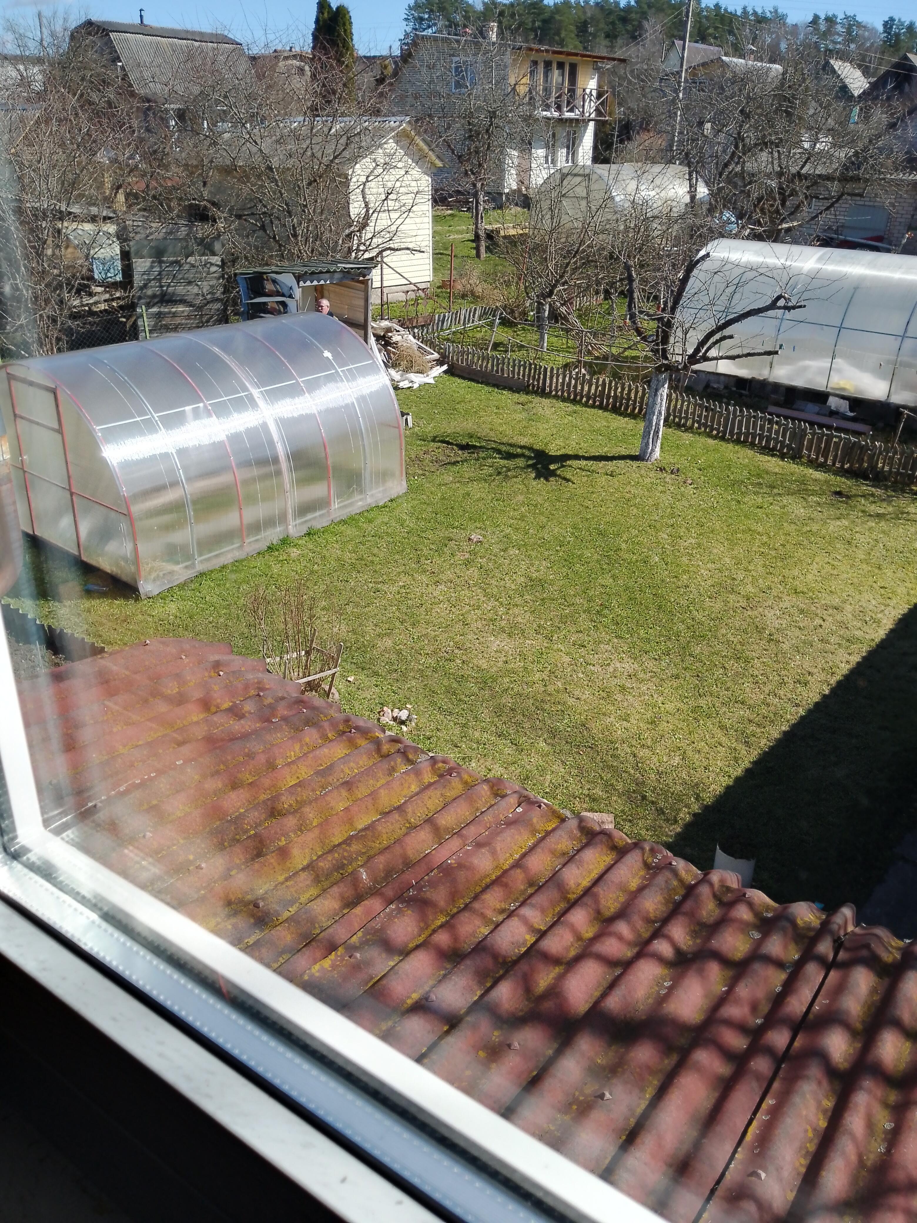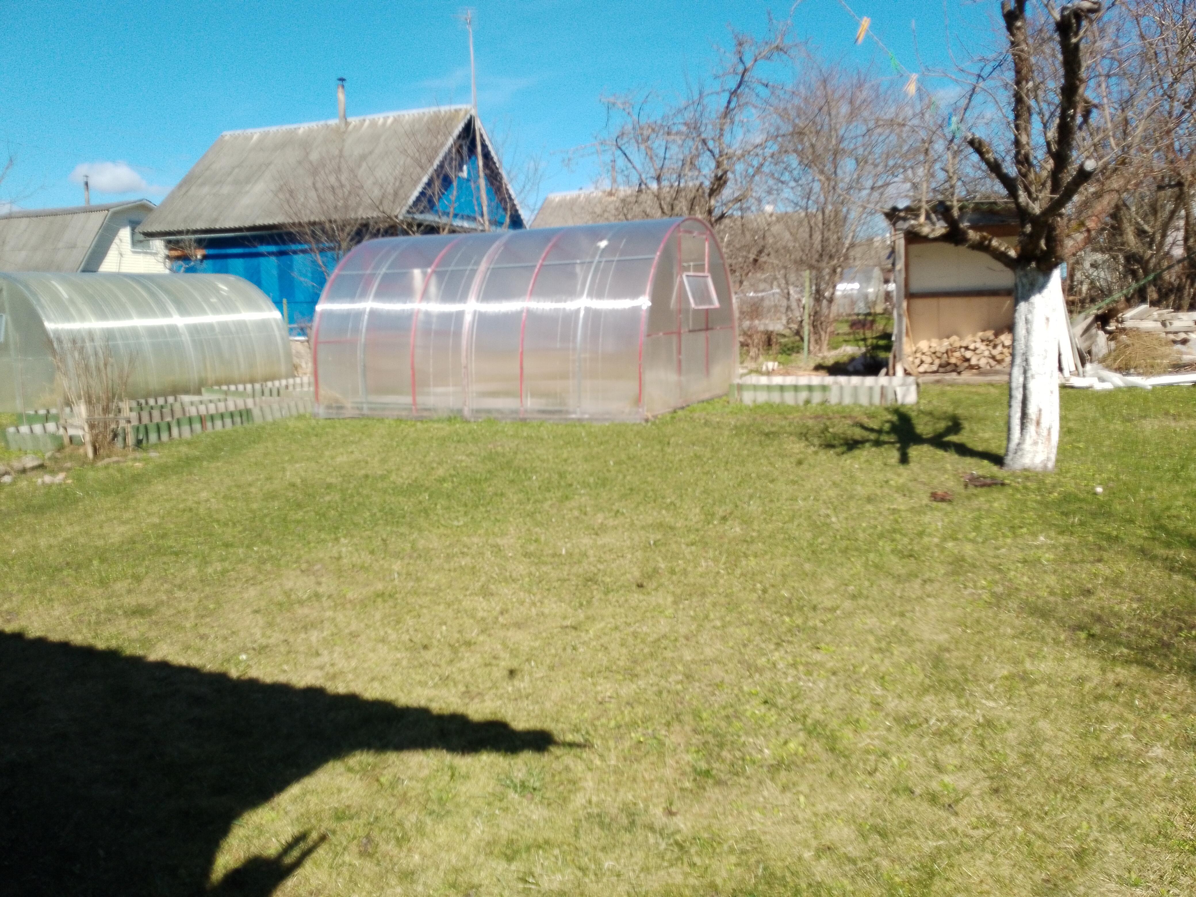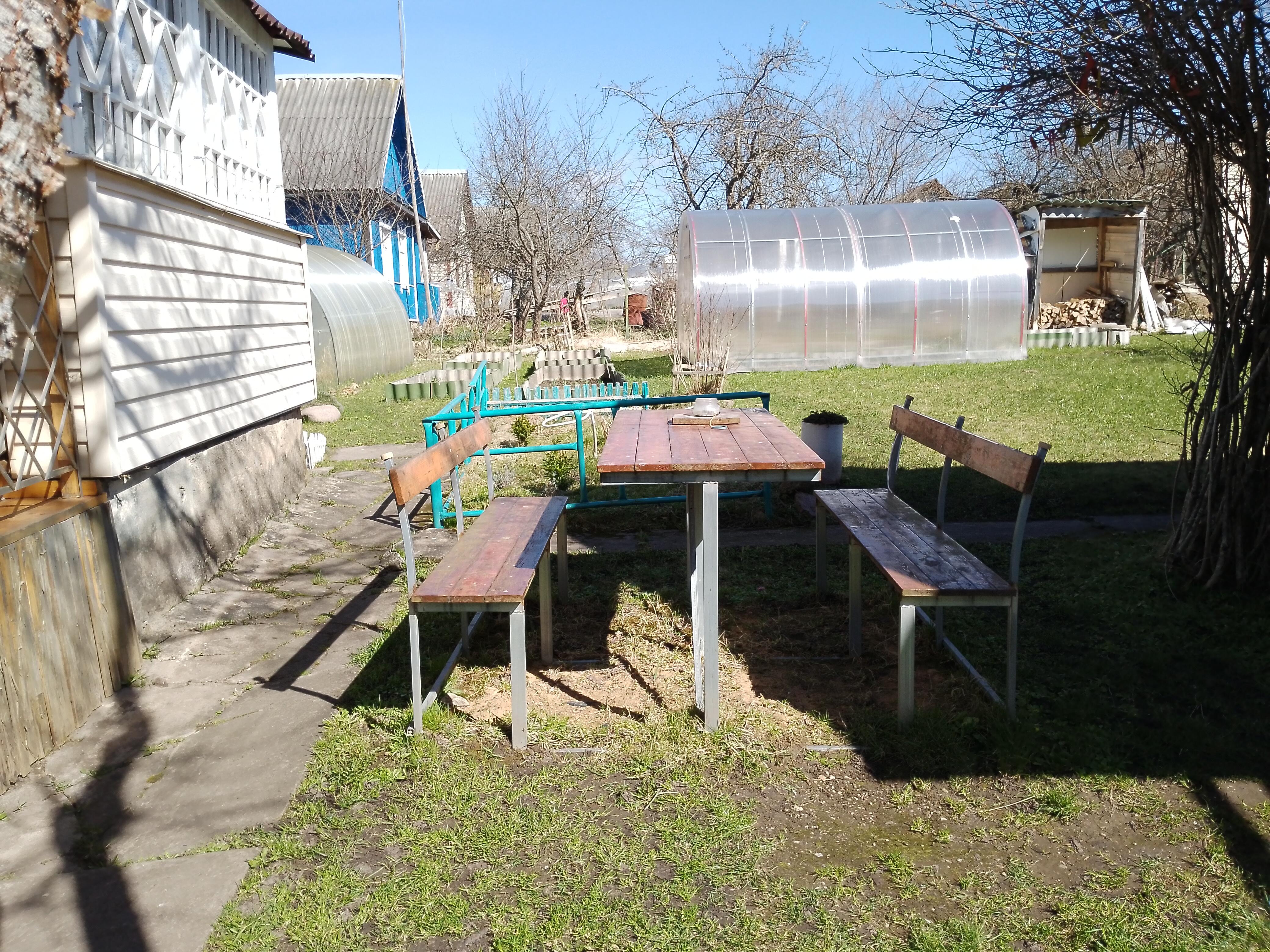 Две большие теплицы, разработанные грядки. Из насаждений: яблоня, кусты смородины, много декоративных растений. Ограждение с 3-х сторон сеткой рабицой. Уютное место для отдыха со столом и скамейками перед домом.
