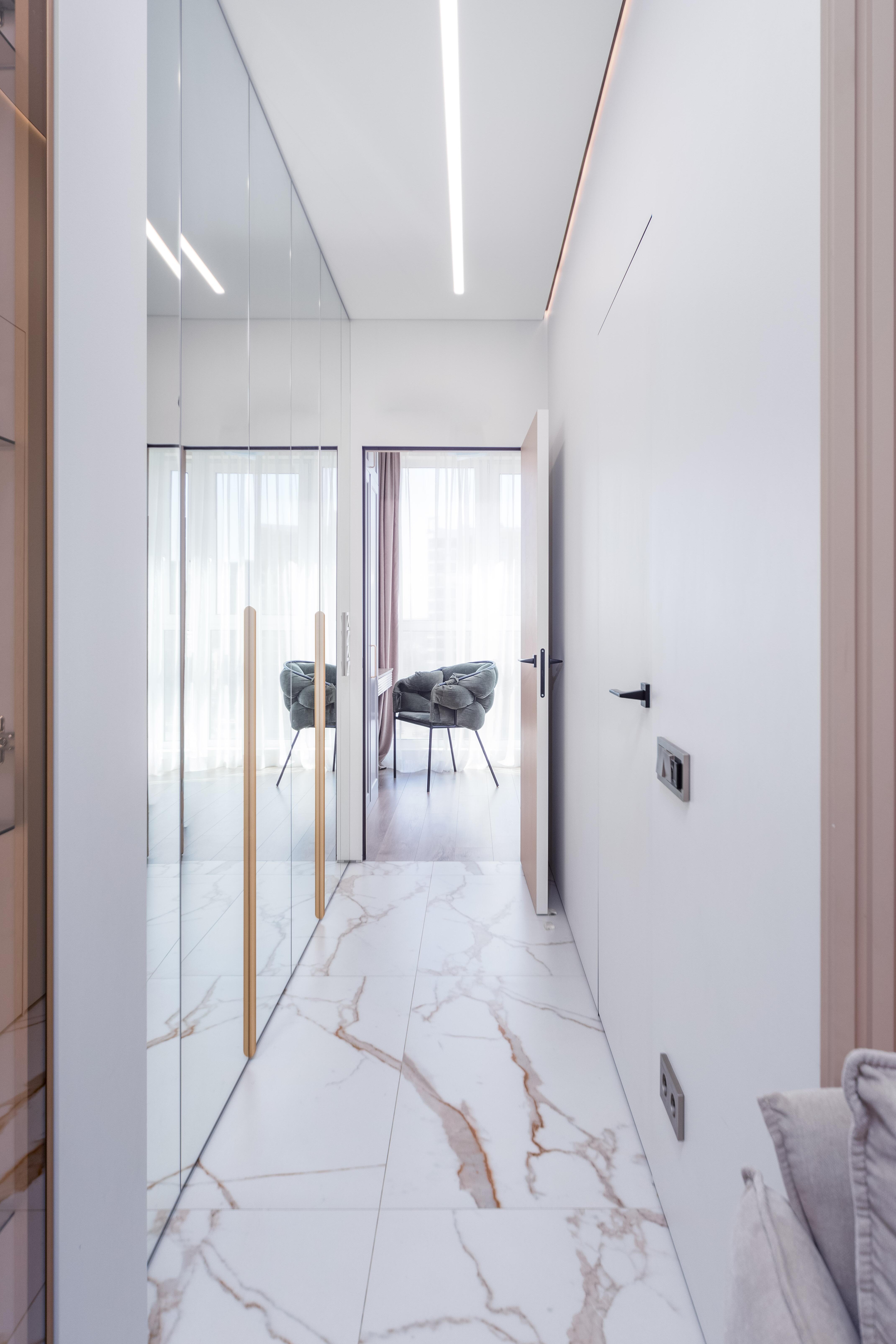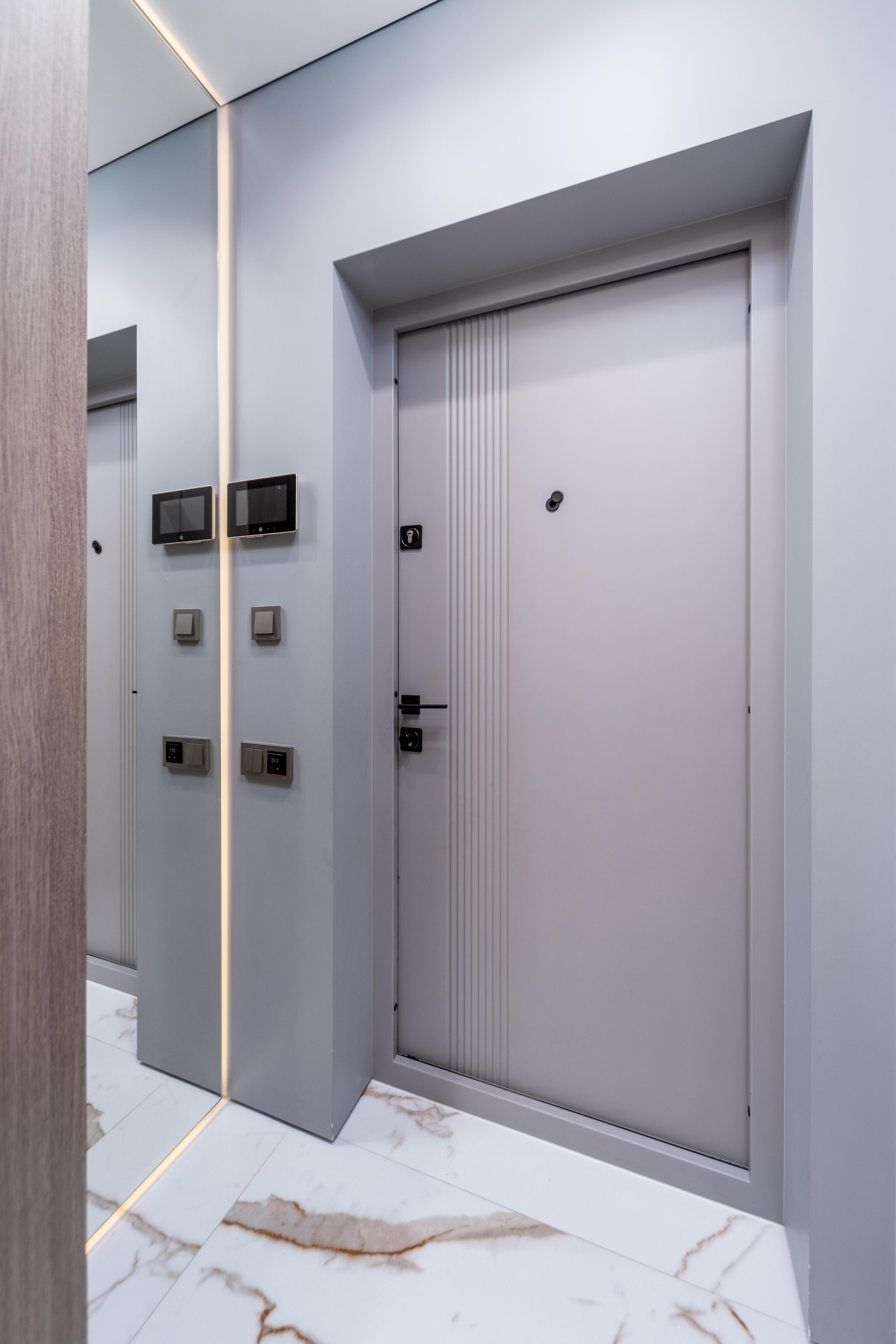 - Прихожая: шкаф для верхней одежды и хранения обуви, зеркало от пола до потолка с подсветкой, подогрев пола, видеодомофон.