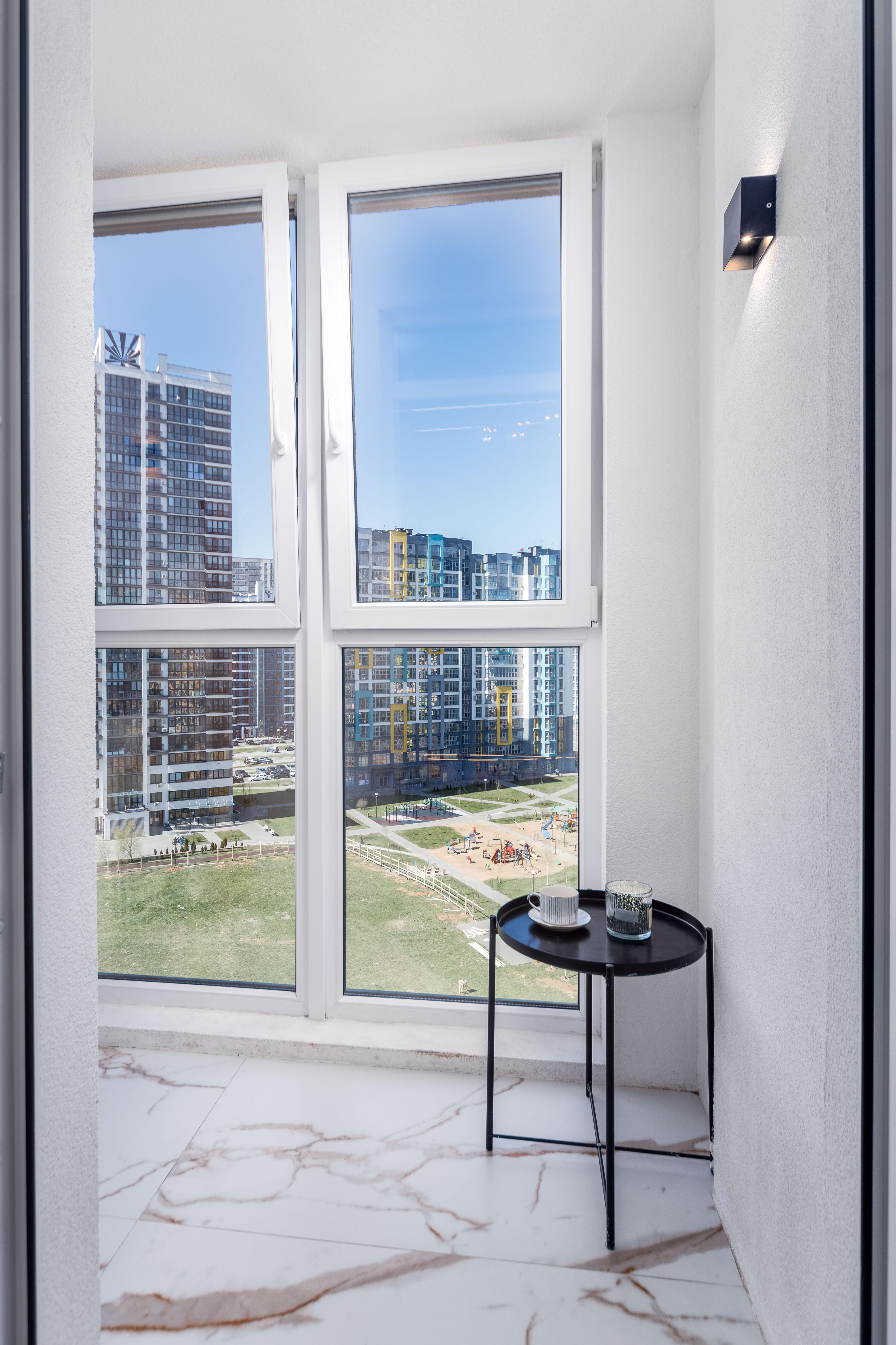 Расположение окон: прилегающие дома не примыкают близко – никакого эффекта «окно в окно», полная приватность. Окна спальни выходят на панораму жилой застройки, окна кухни-гостиной и детской комнаты выходят на тихий благоустроенный внутренний двор.