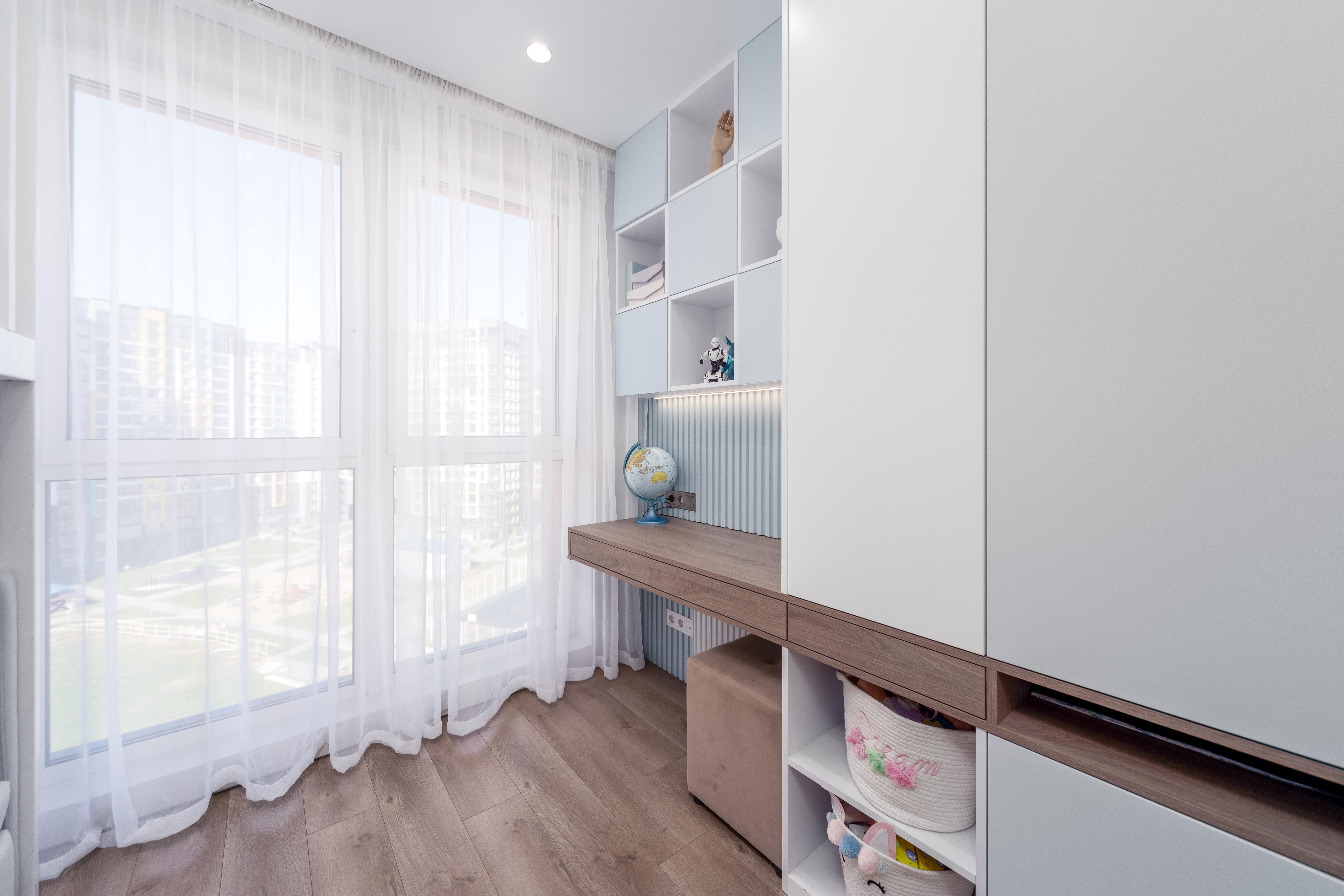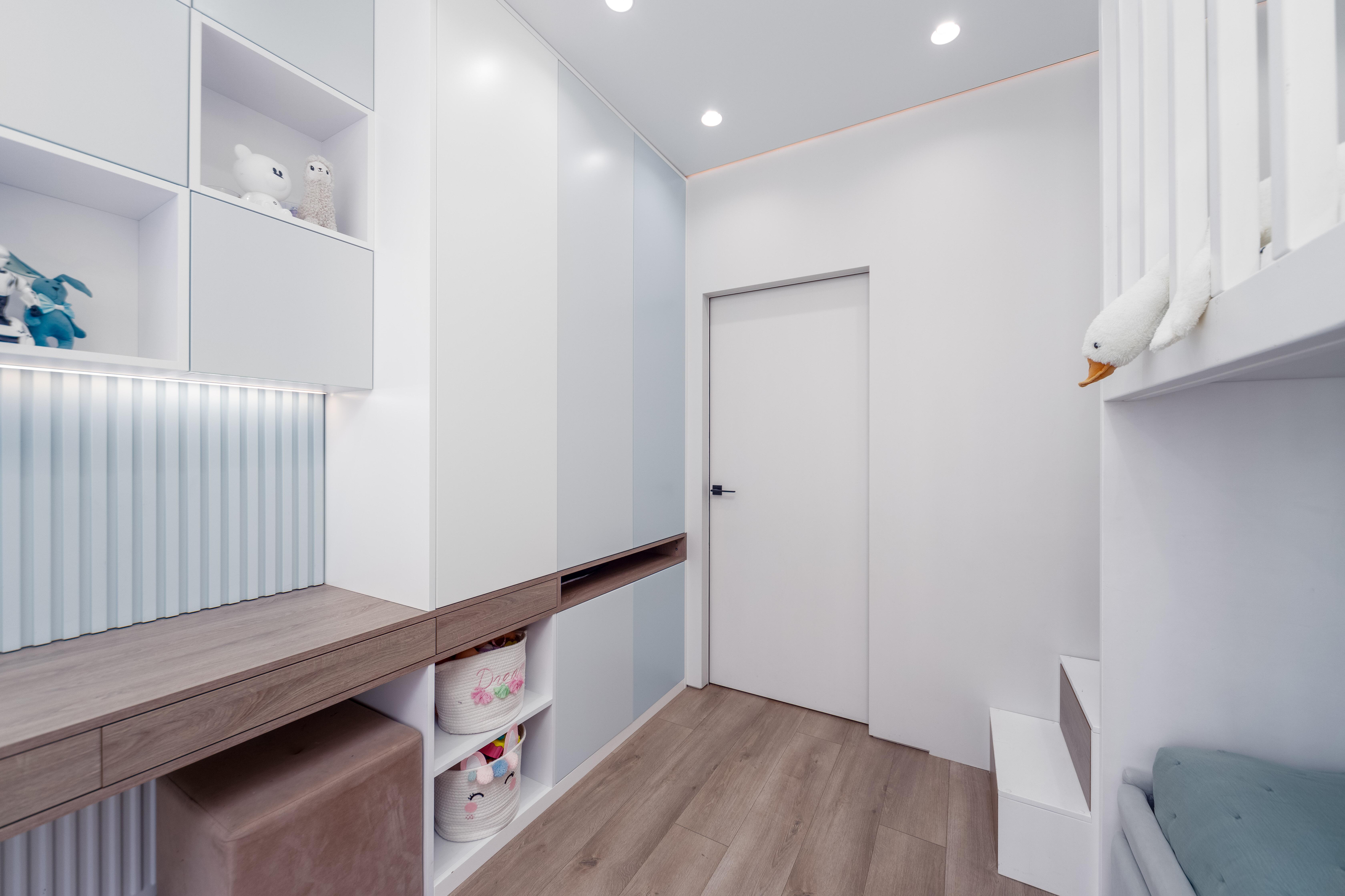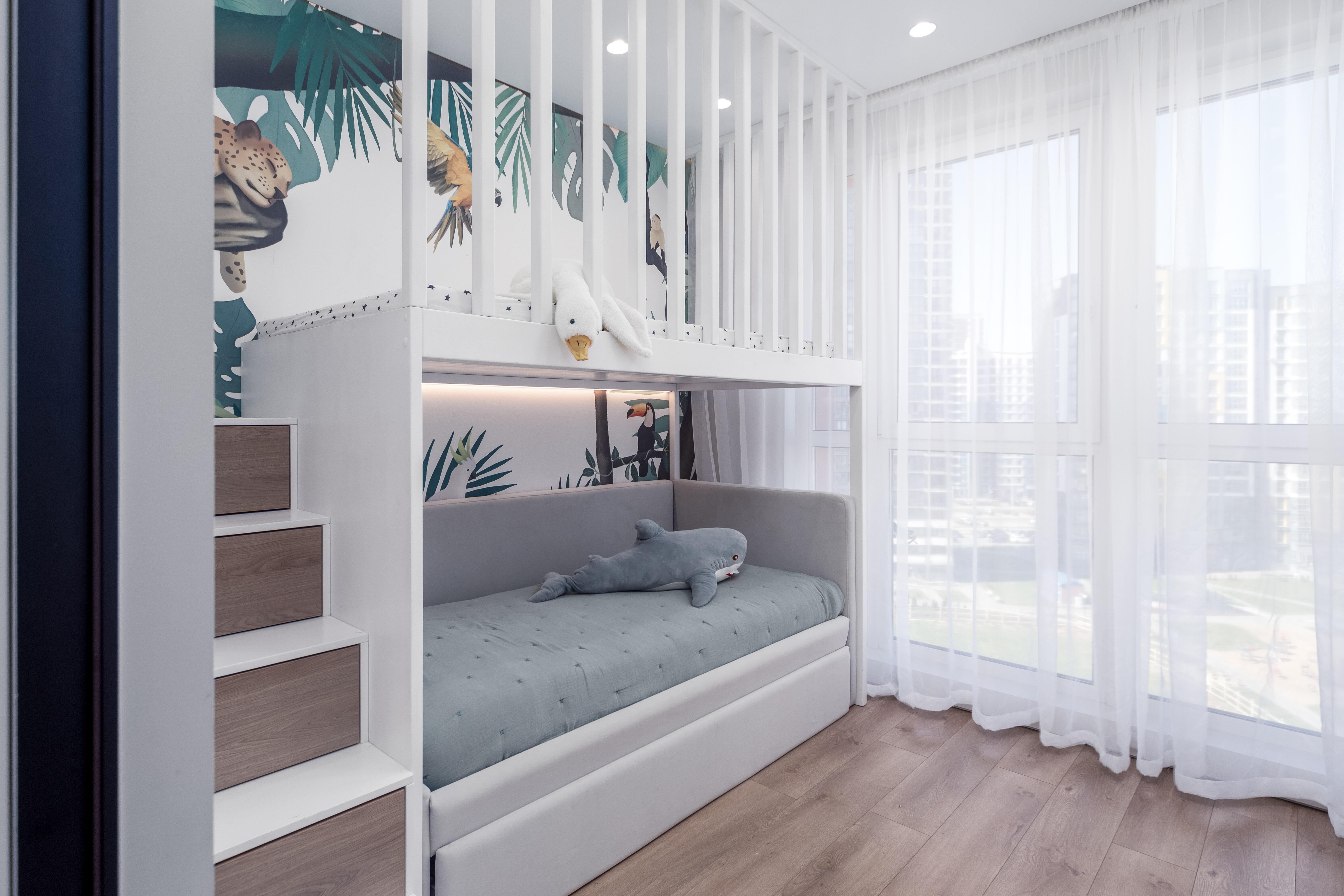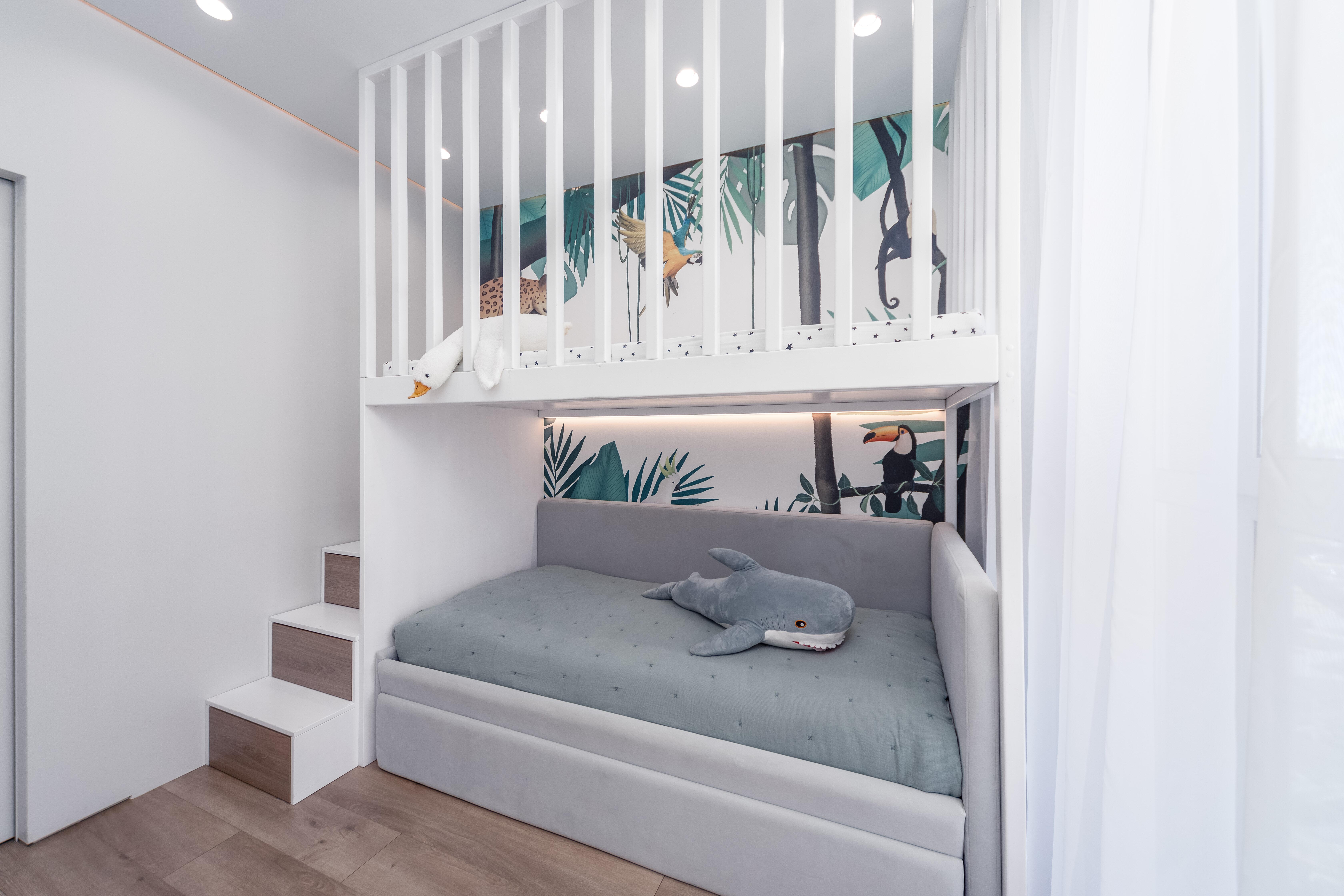 - Детская комната: двухуровневая спальная зона – готовое решение для двоих детей, продуманная зона для хранения, письменный стол.