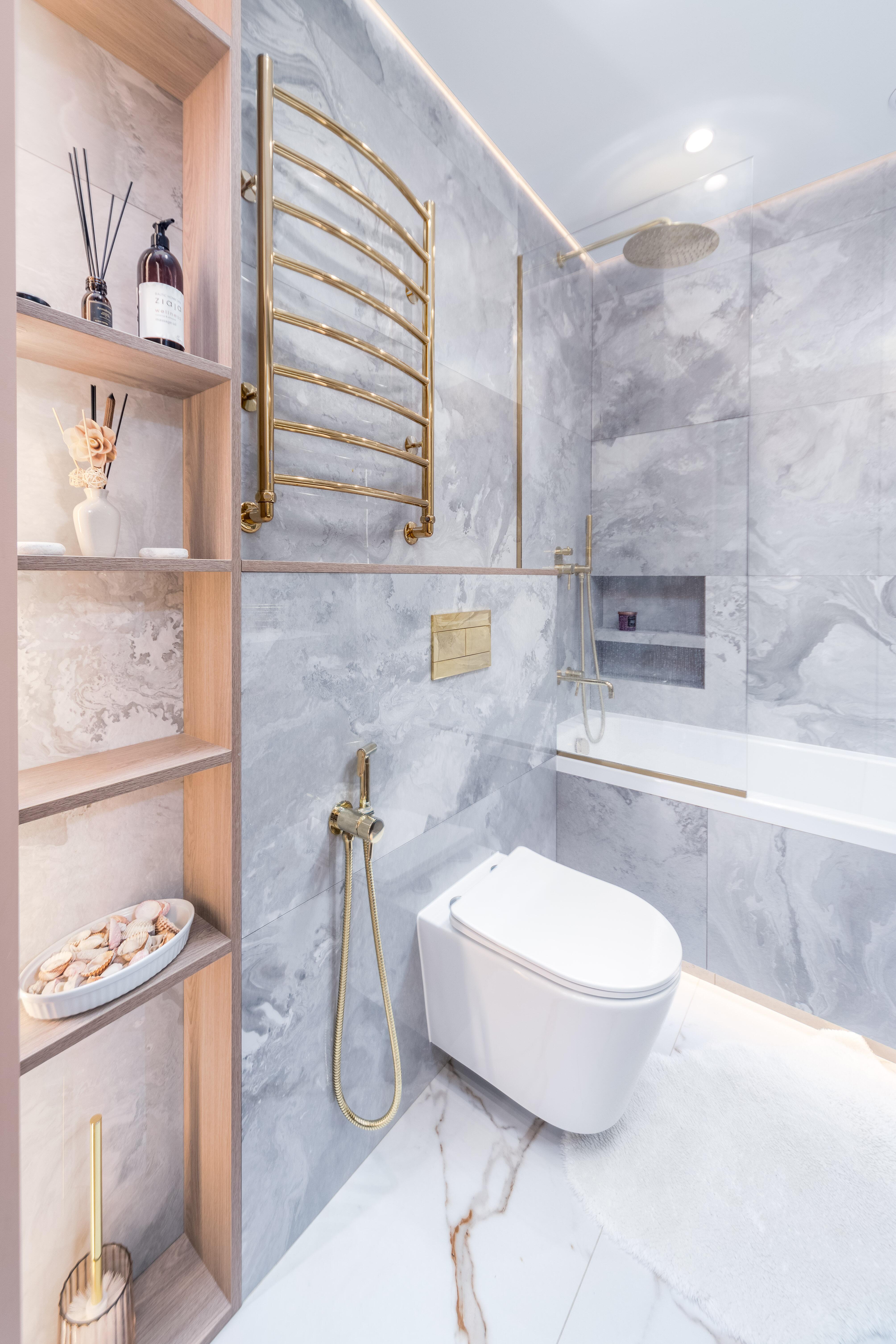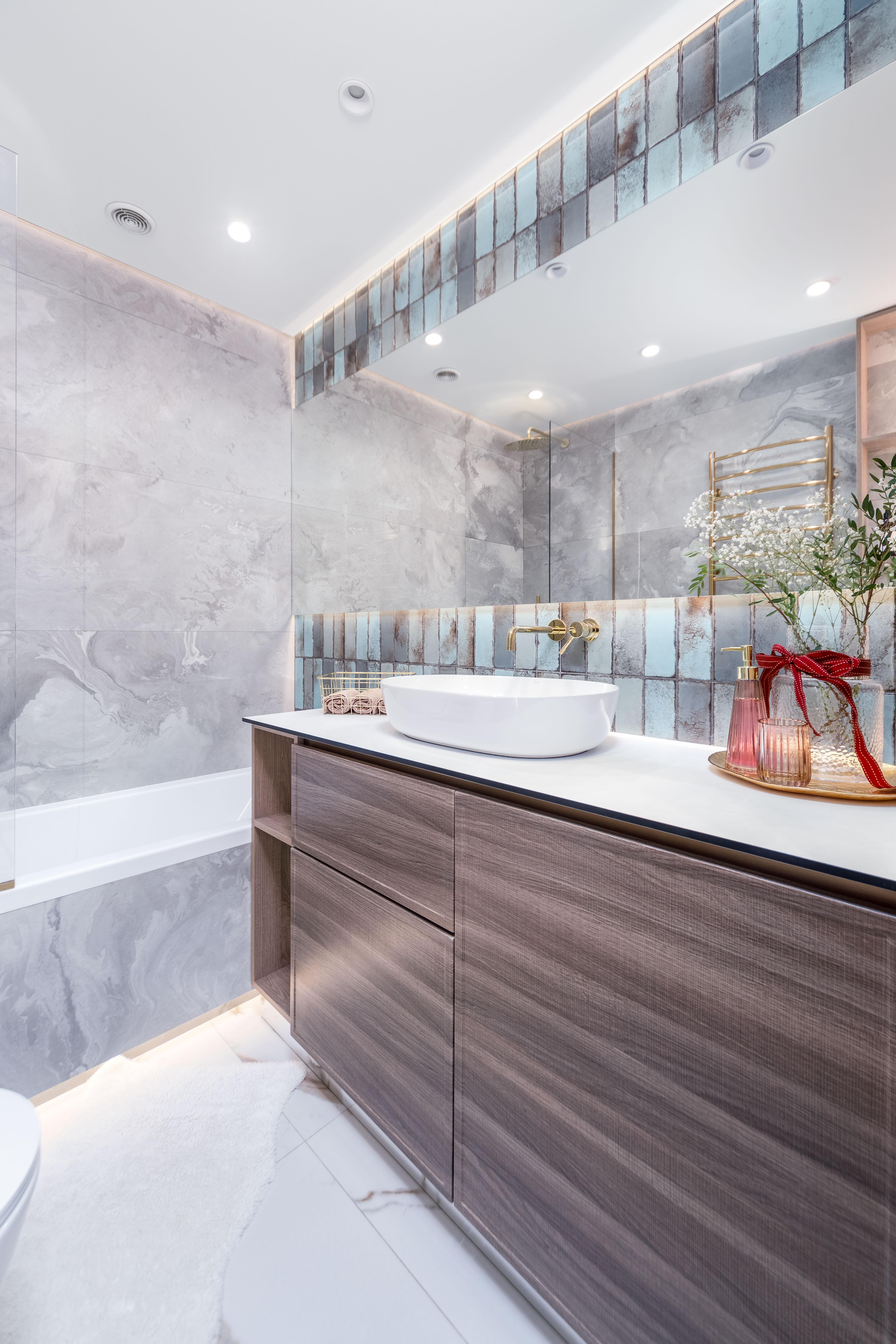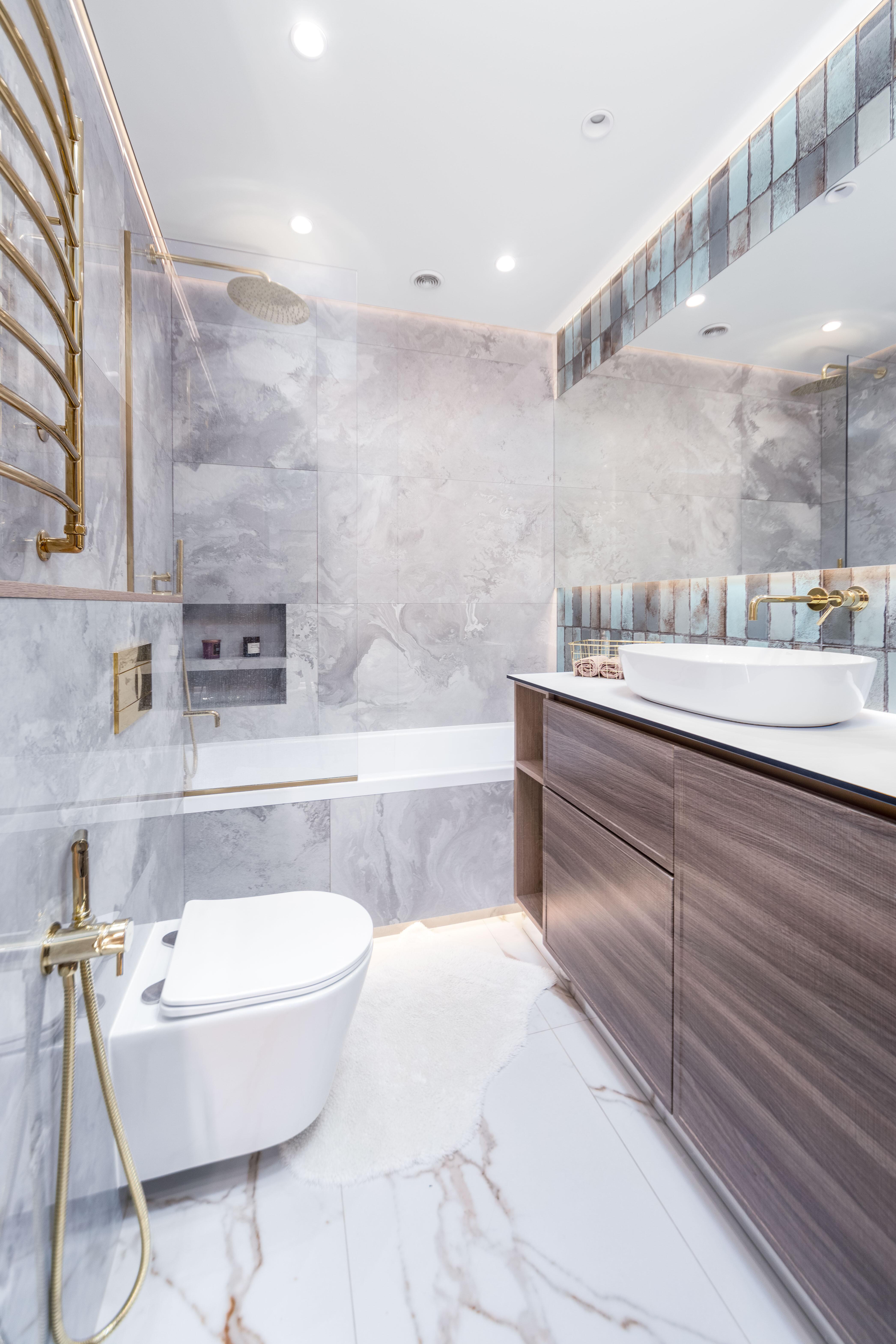 - Санузел: полноценная ванна с встроенным душем и стеклянным защитным экраном, стиральная машина, накопительный водонагреватель, просторная столешница с накладной раковиной.