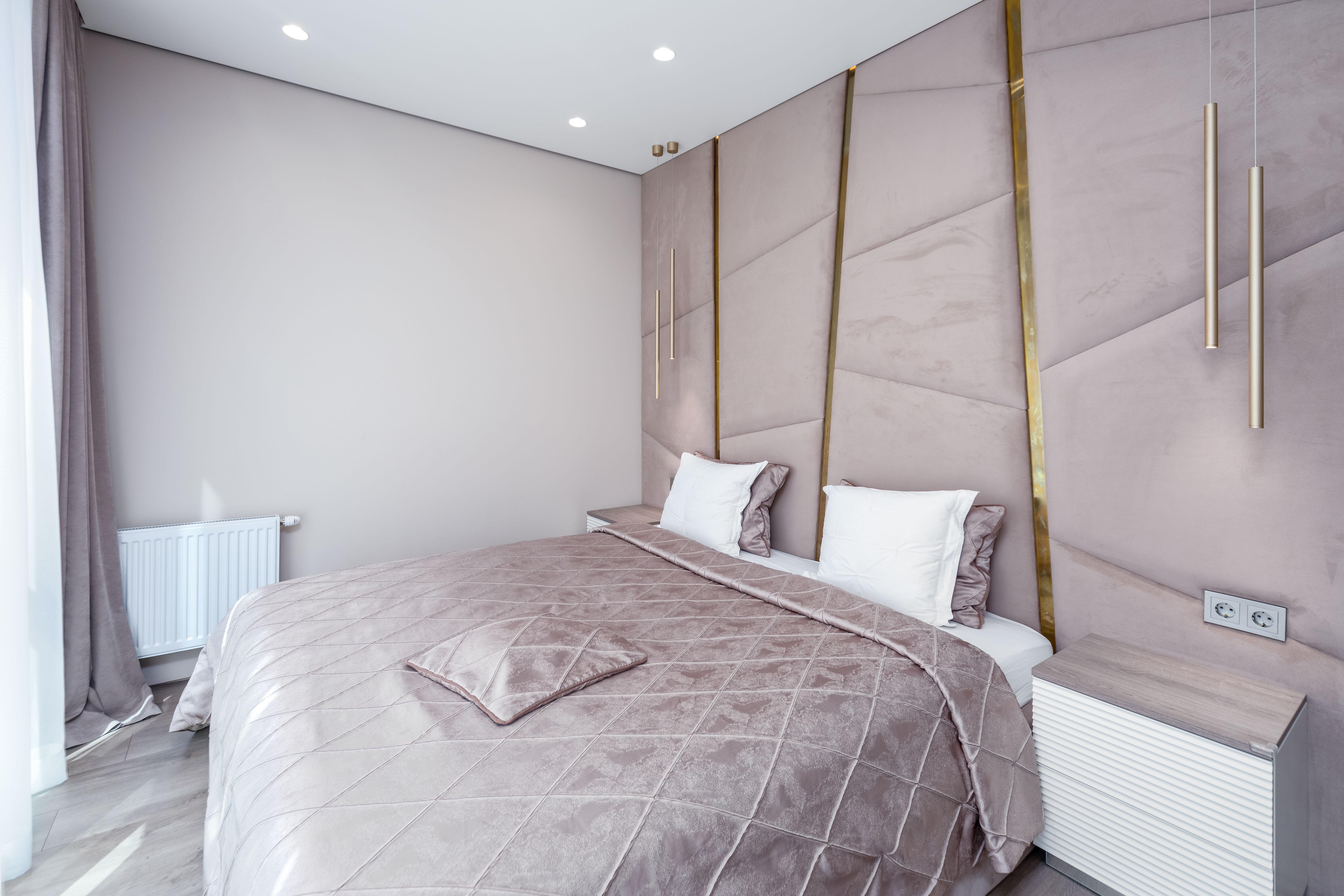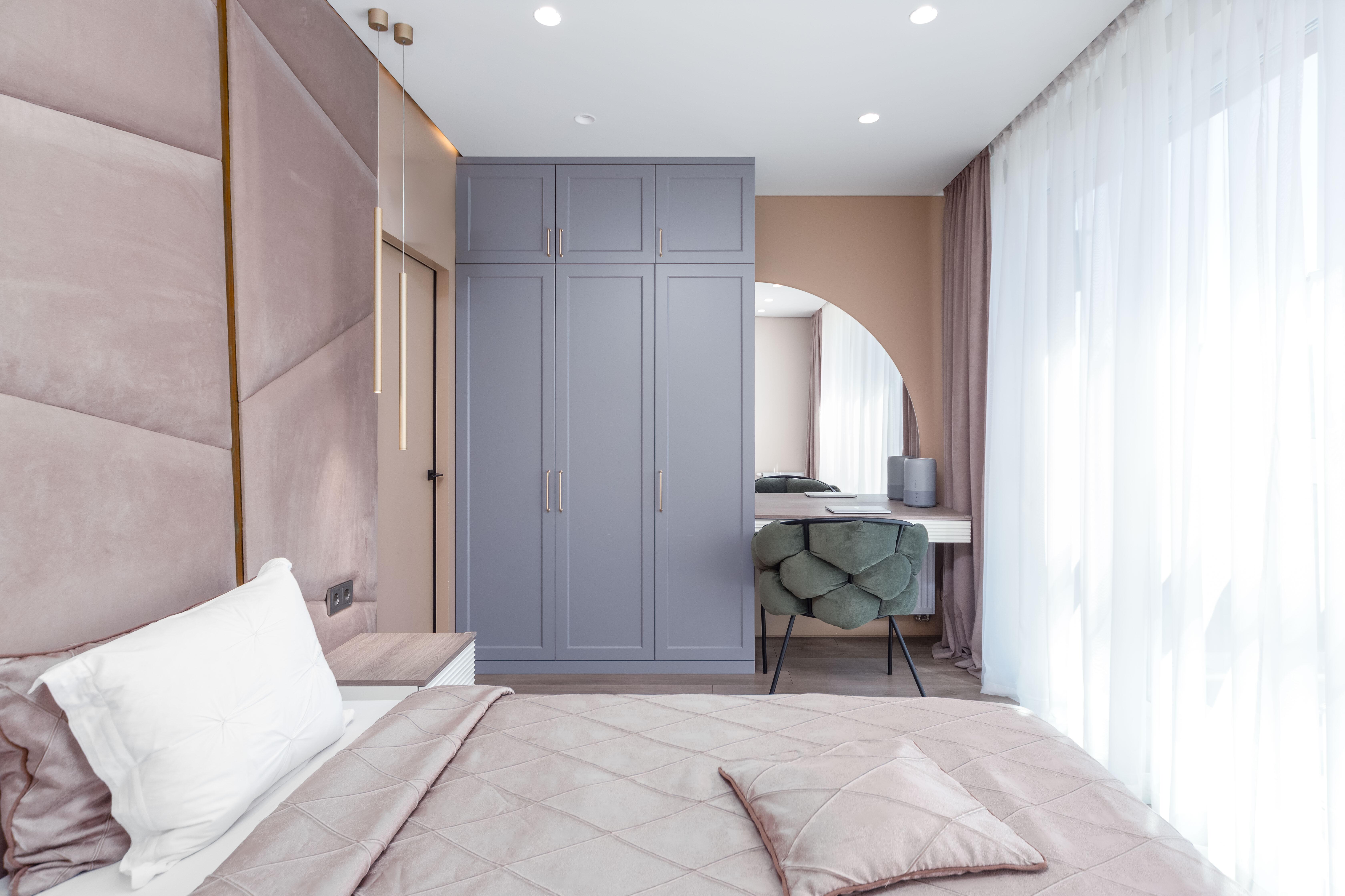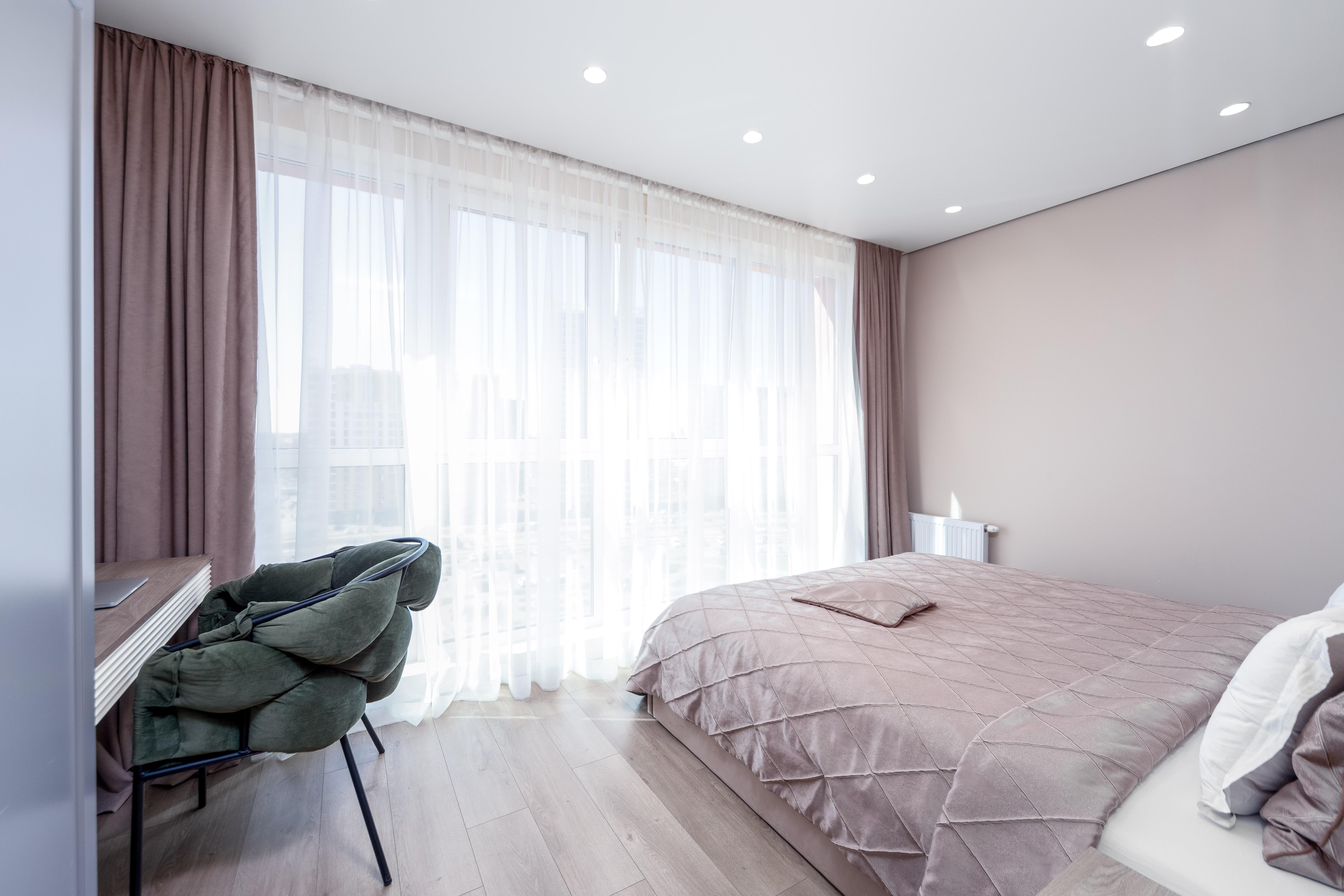 - Спальня: двуспальная кровать с ортопедическим матрасом, шкаф для хранения выполнен по индивидуальному заказу из крашеного МДФ, стены окрашены качественной интерьерной краской премиум-сегмента, напольное покрытие – ламинат 33 класса европейского производства, натяжной потолок Fericoс теневым профилем, двери скрытого монтажа окрашены в тон стен для создания цельного пространства, современный напольный теневой плинтус, система кондиционирования (на фото кондиционер не показан, коммуникации выведены, монтаж блока в ближайшее время).