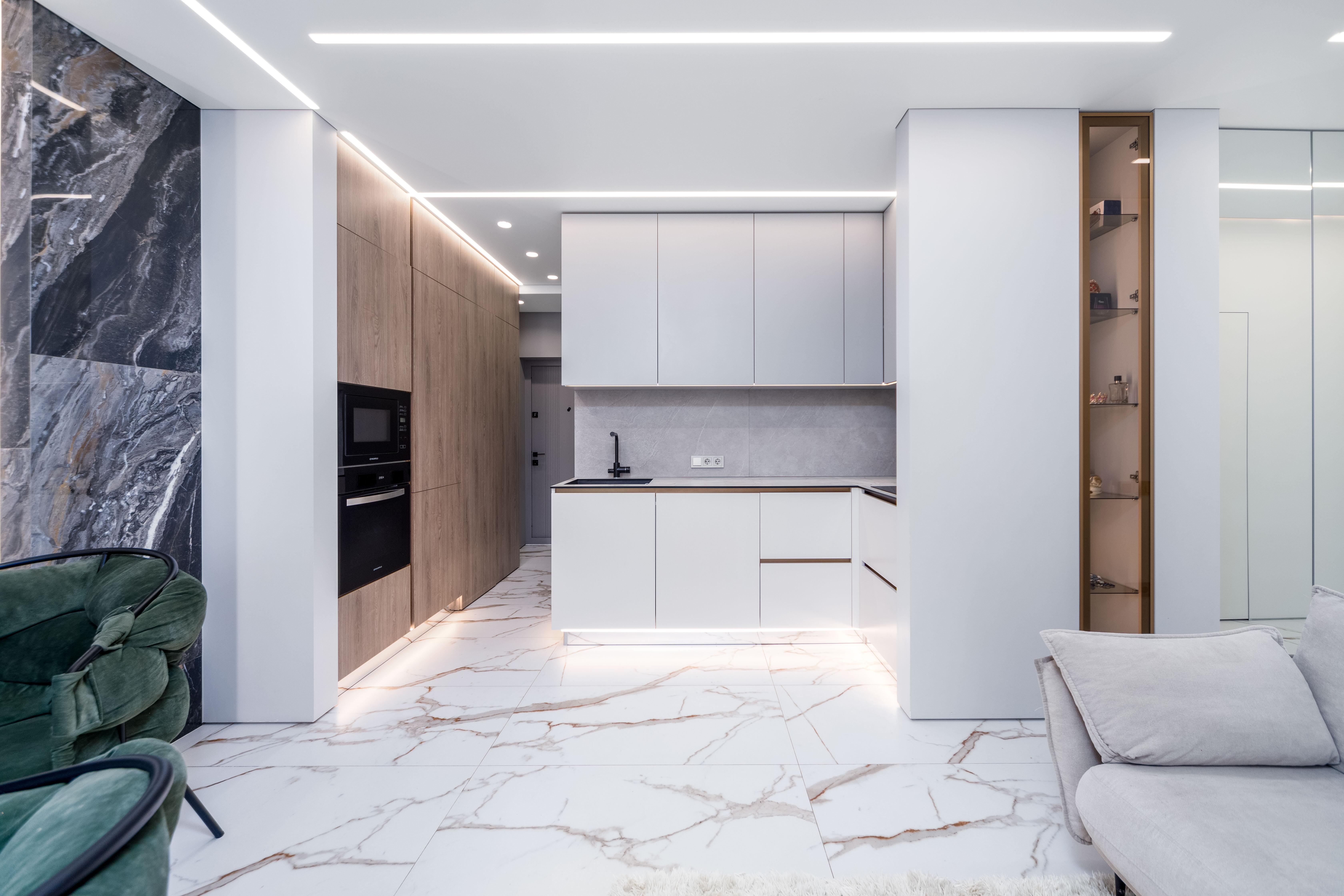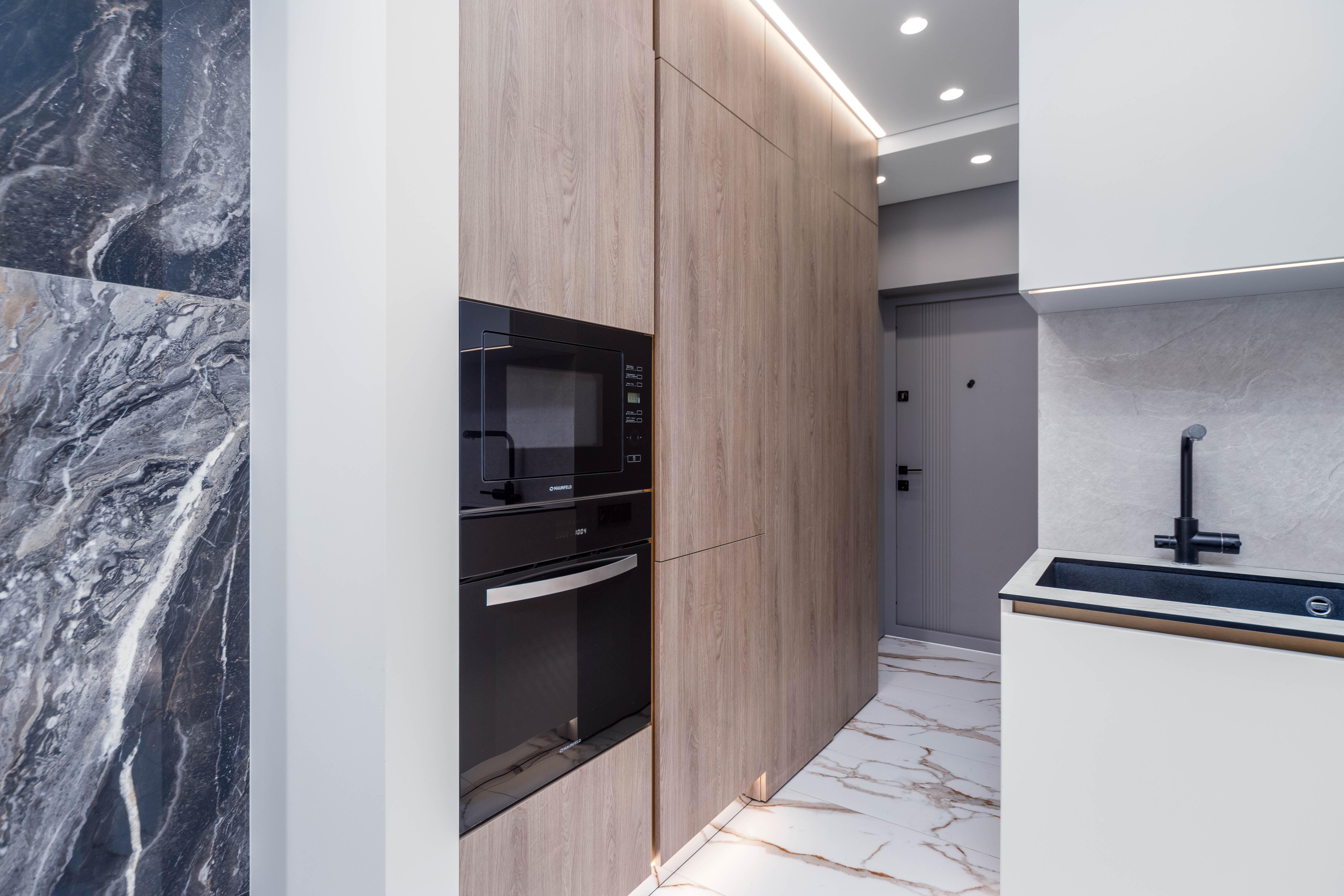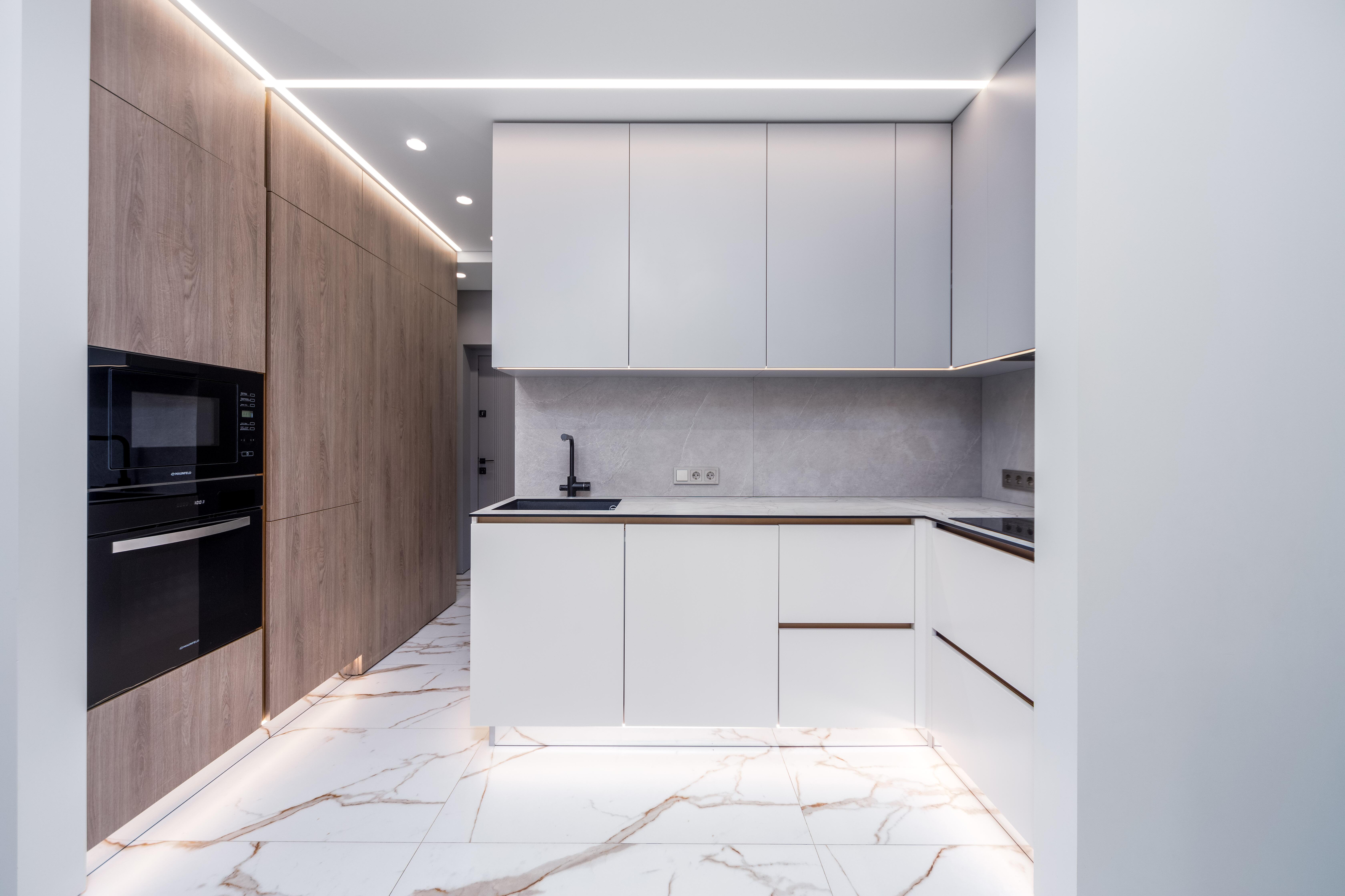- Кухня-гостиная: встроенный кухонный гарнитур с фасадами из крашеного МДФ и ДСП Egger, столешница из компакт-плиты, австрийская фурнитура, современная встроенная техника, установлена система обратного осмоса.