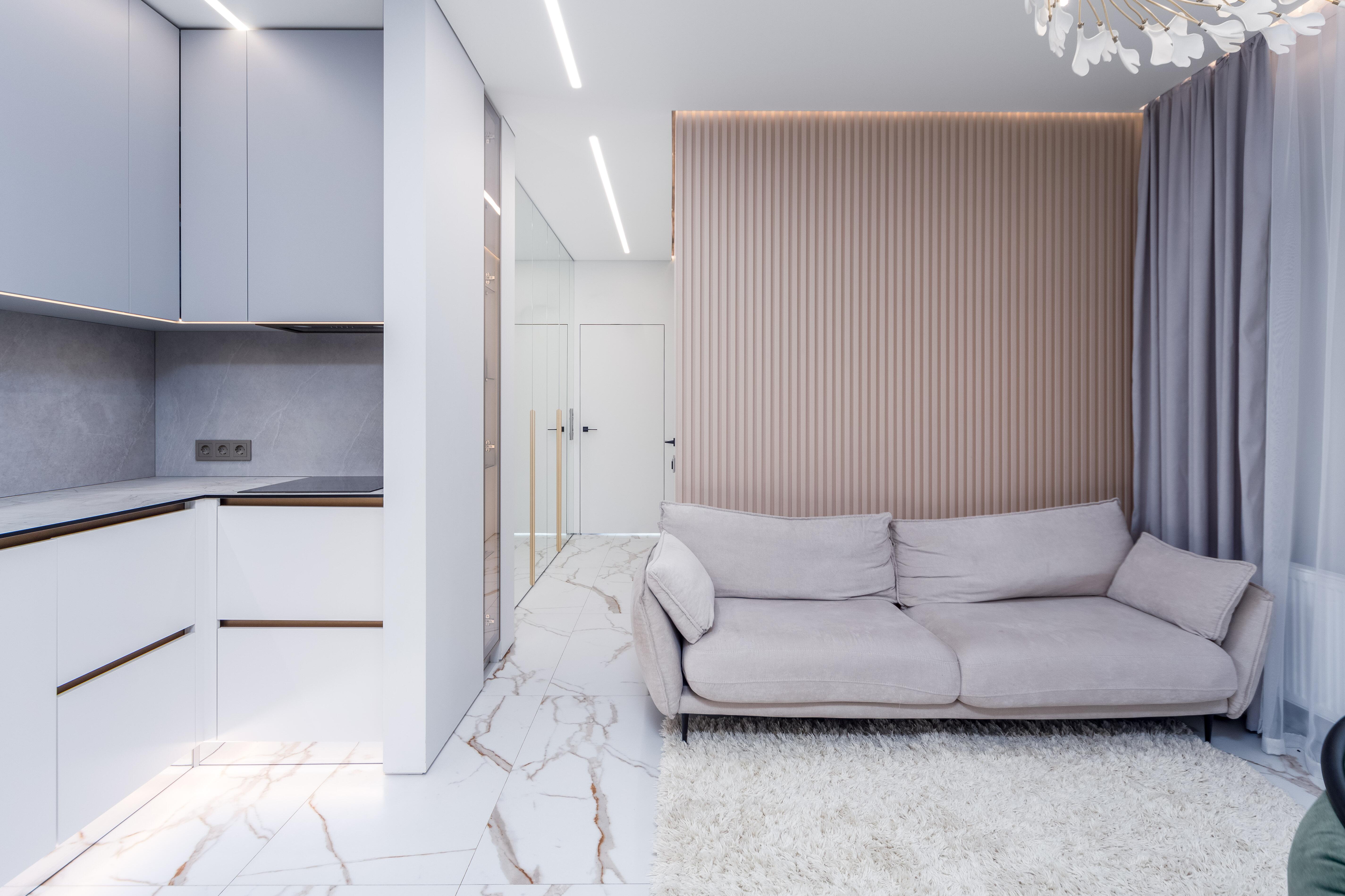 На полу и стенах итальянский керамогранит, подогрев пола, акцентная стена за диваном – объёмные гипсовые панели, изысканная обеденная группа с удобными стульями, телевизор LGOLEDдиагональ65 дюймов, система кондиционирования (на фото кондиционер не показан, коммуникации выведены, монтаж блока в ближайшее время).