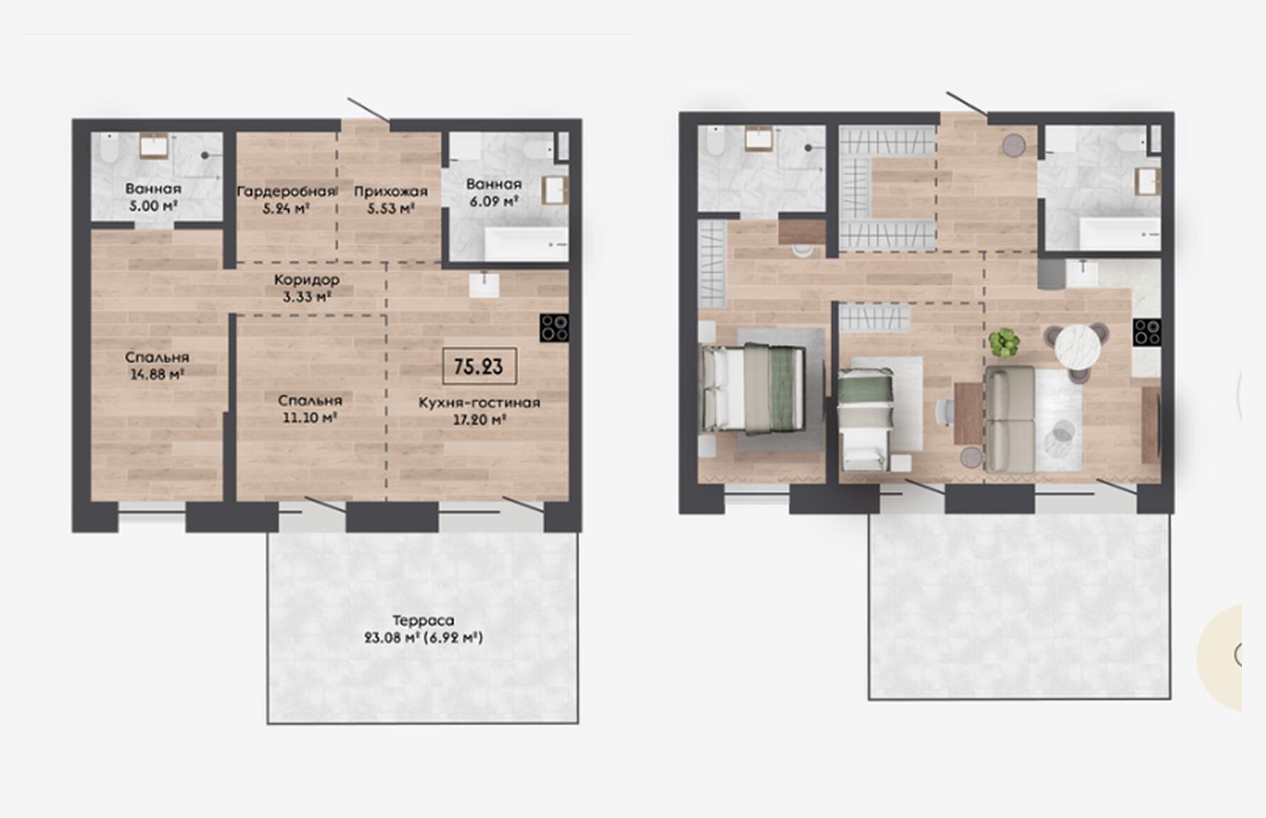 Квартиры с участками-террасами на 1 этаже (19–23 м2) Мастер-спальни с гардеробными и санузлами Мансардные квартиры с антресолями Квартиры с террасами на кровле Такие форматы подойдут тем, кто ищет квартиру как частный дом или квартиру с террасой в Минском районе.