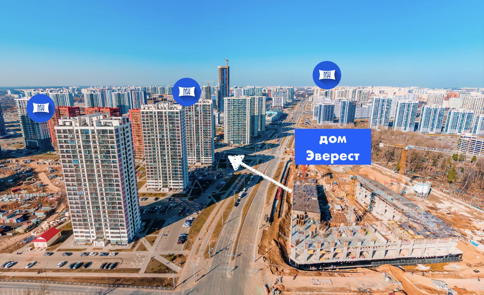 станция метро «Аэродромная», Международный финансовый коммерческий центр, торгово-общественный центр «Авиа Молл». В доме«Эверест» предусмотрены встроенные административно-торговые помещения на 1 этаже, бизнес-апартаменты со 2 по 15 этаж и подземный одноуровневый гараж-стоянка на 239 машино-мест с зарядными станциями для электромобилей, помещениями для хранения велосипедов и мототехники в местах общего пользования.