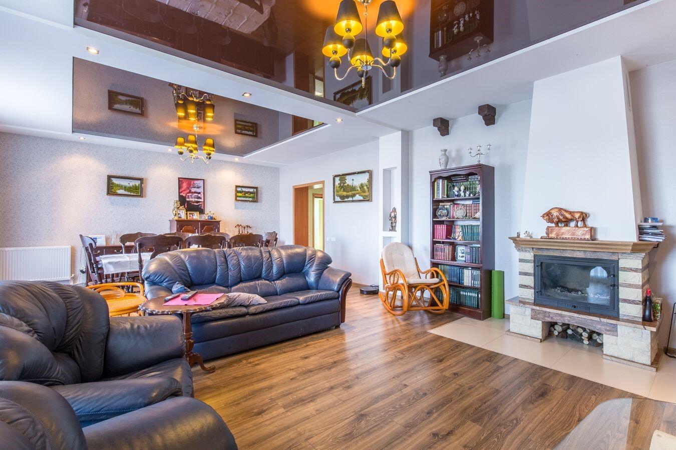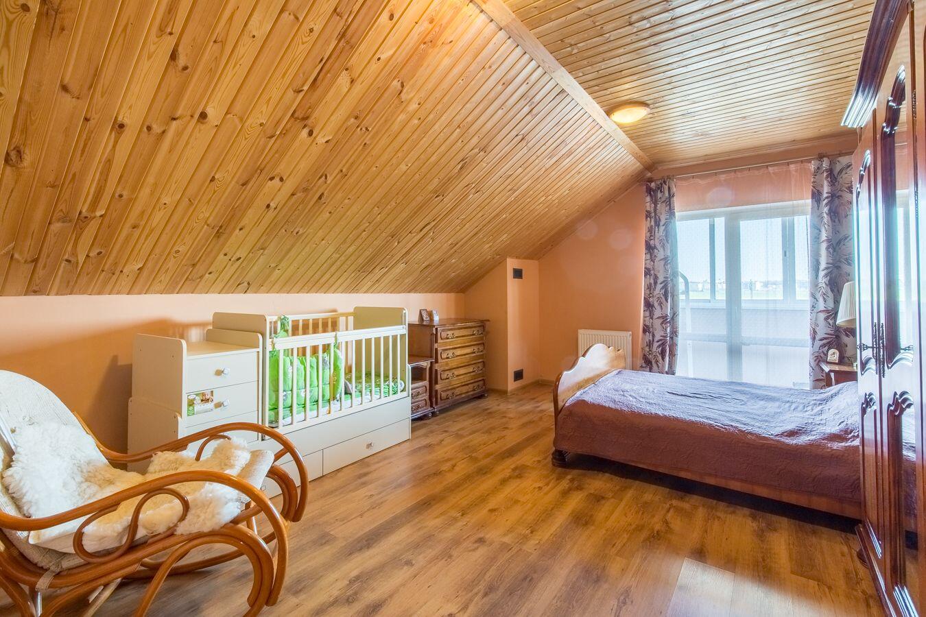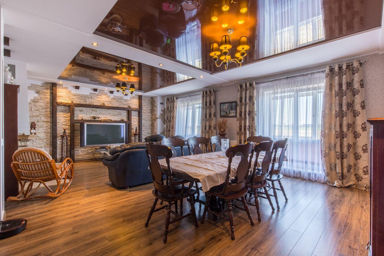 Кухня светлая и элегантная, оборудована техникой BOSCH: индукционная плита, посудомоечная машина. Большая и шикарная гостиная в классическом стиле с камином. В коридоре, санузле и кухне полы - керамическая плитка с подогревом. На мансардный этаж ведёт лестница из массива ольхи и дуба.