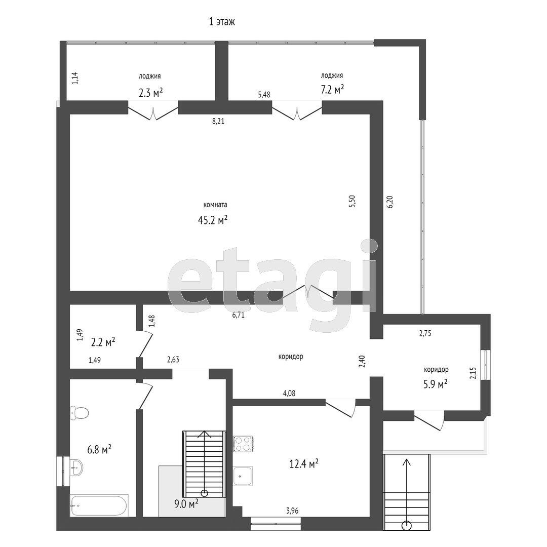 -- 1-й этаж – h 2.80m, кухня 12,4м2, гостиная 44,8м2, санузел, прихожая, кладовая, большая лоджия.
