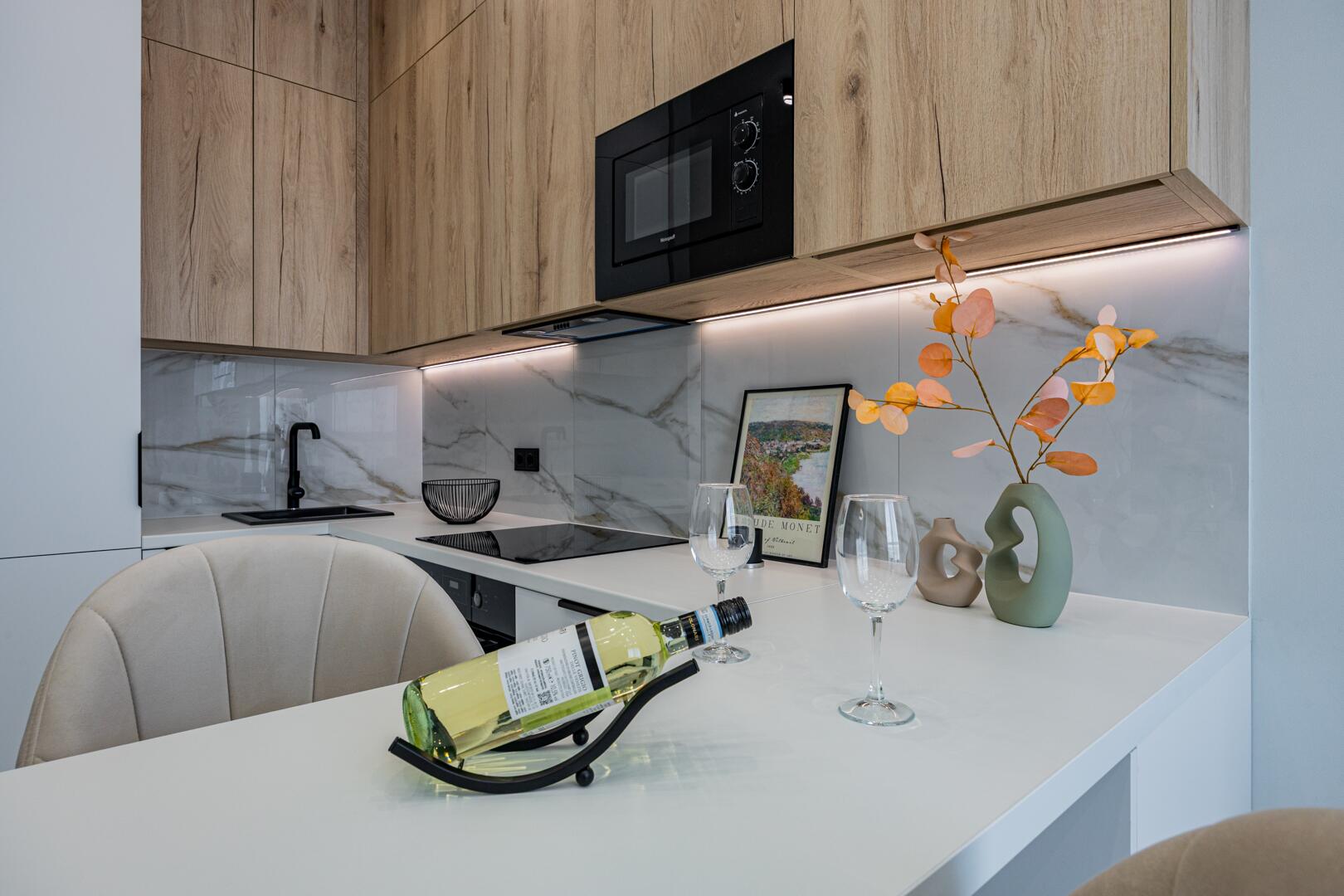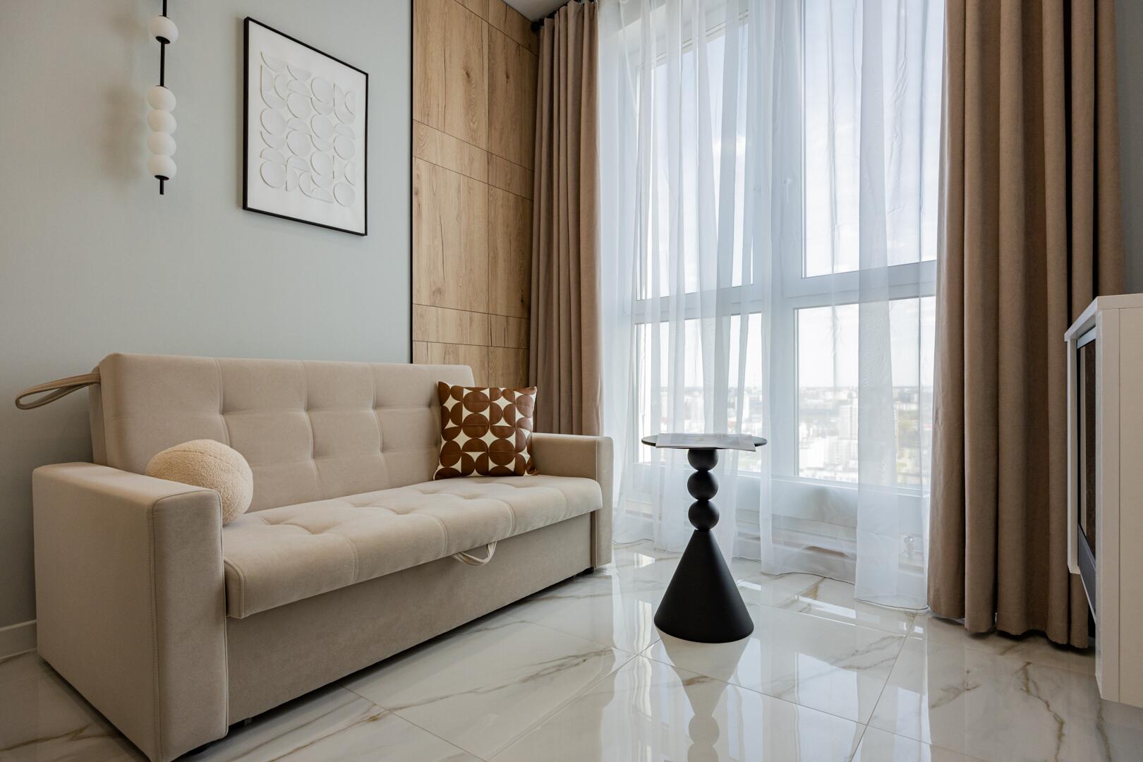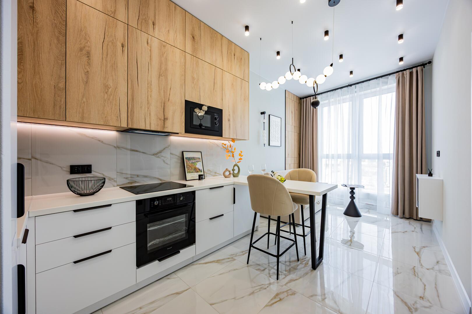 Продается современная квартира с изолированной комнатой, кухней-гостиной, гардеробной.