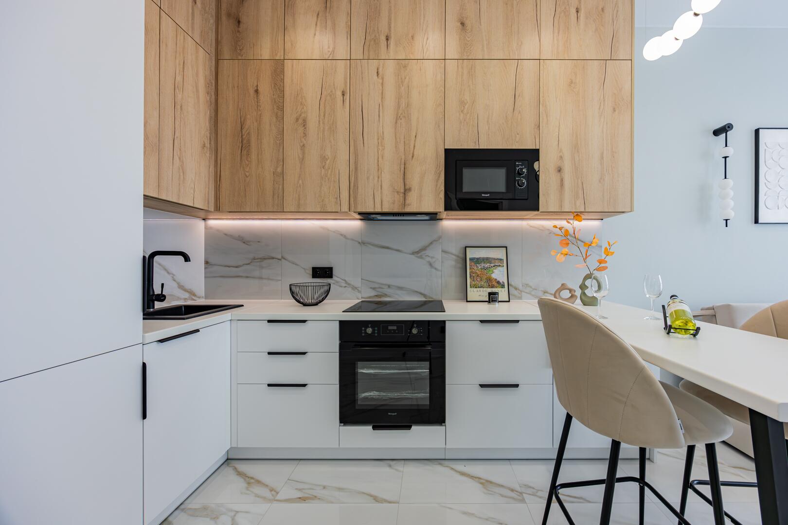 ∙ Встроенная кухня, со всей техникой: электрическая варочная панель, вытяжка, встроенный холодильник, встроенная микроволновая печь. Кухонный стол, два стула, раскладывающийся диван.