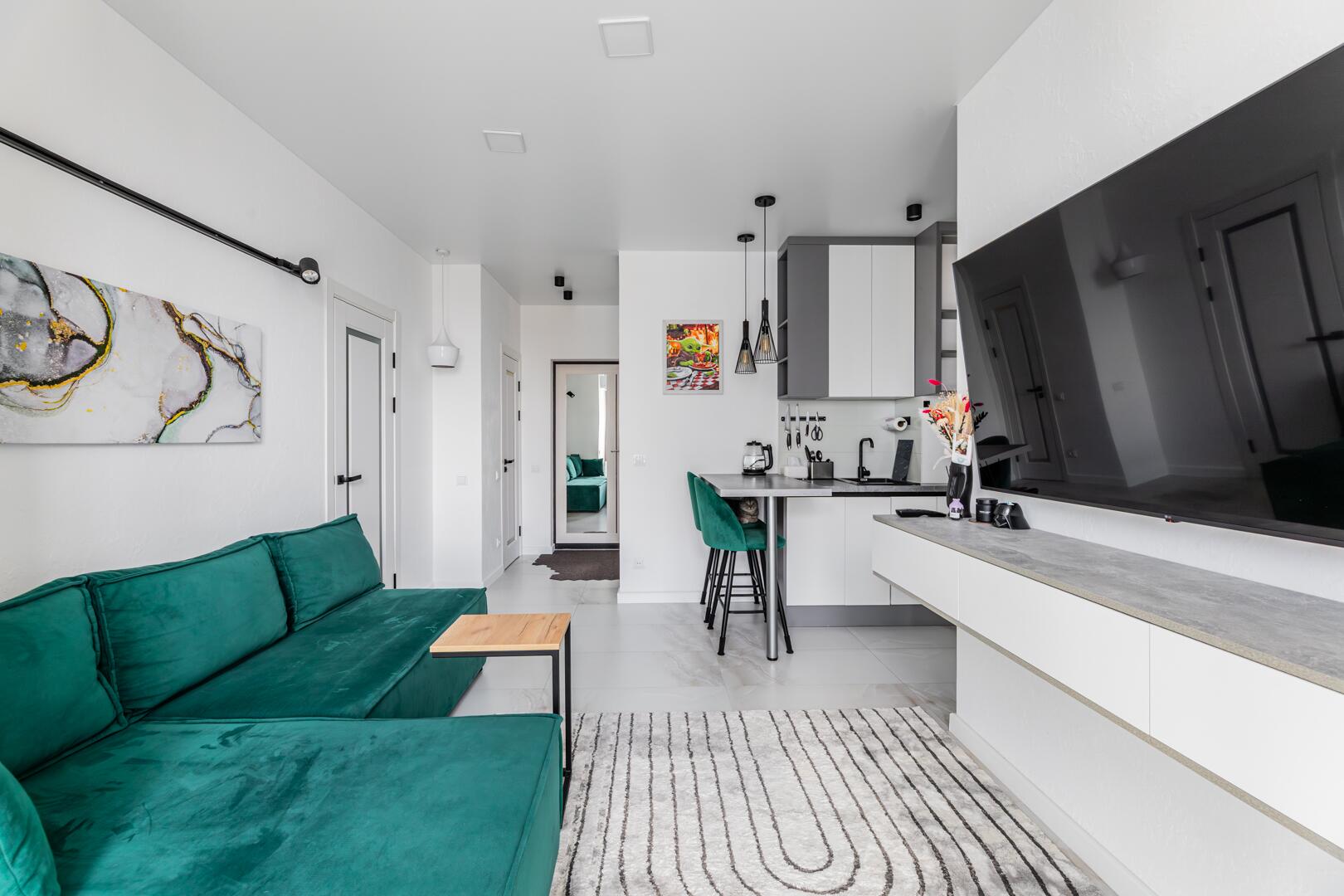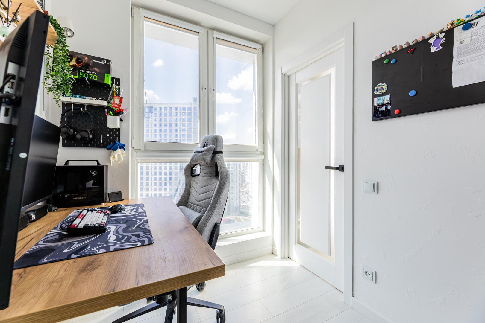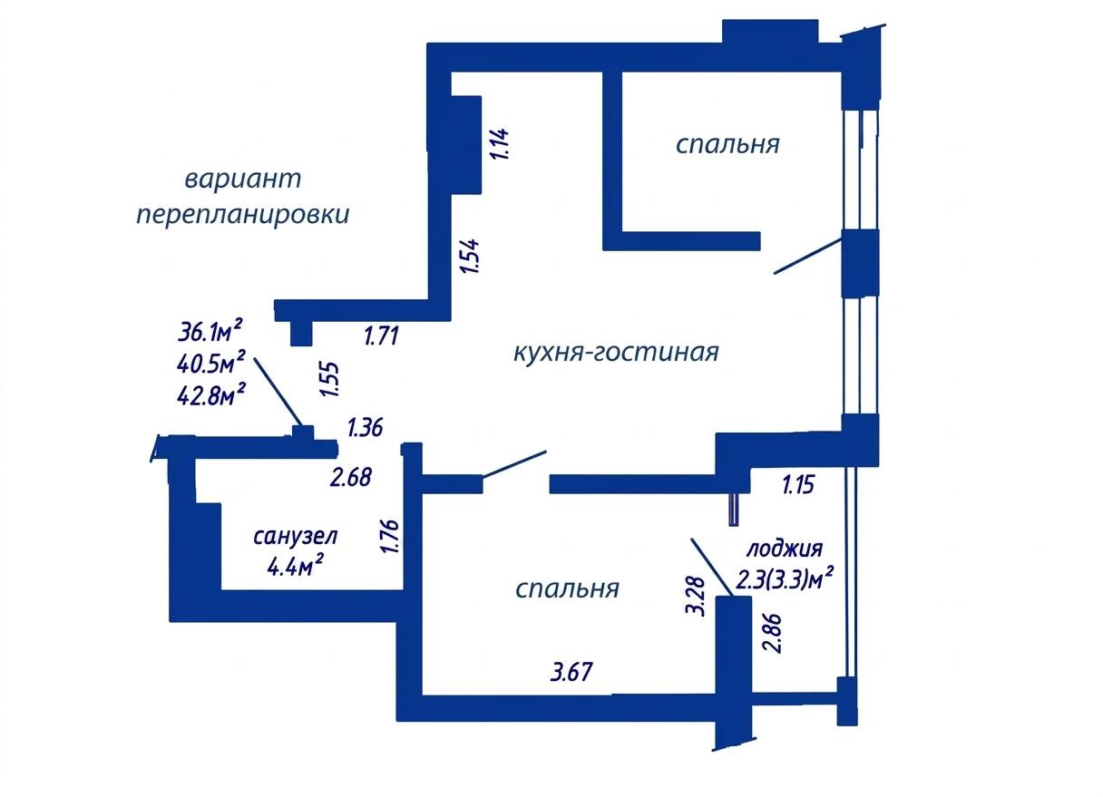 Планировка включает: спальню, рабочий кабинет и кухню-гостиную