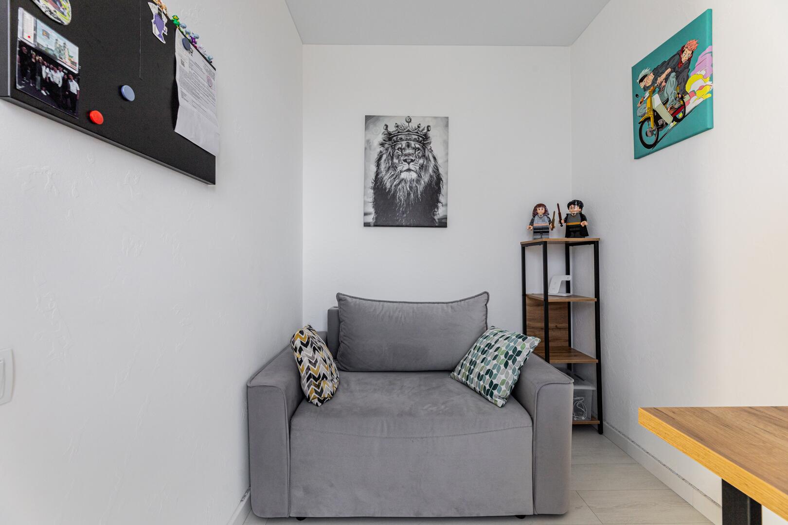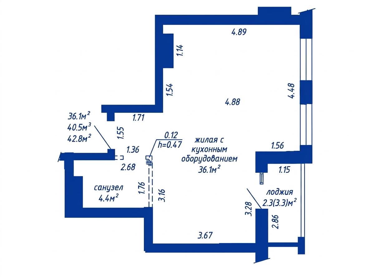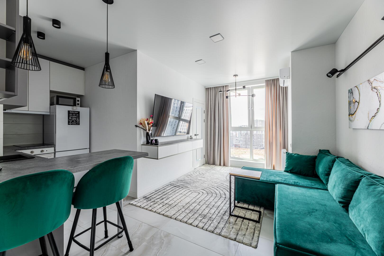 Планировка включает: спальню, рабочий кабинет и кухню-гостиную