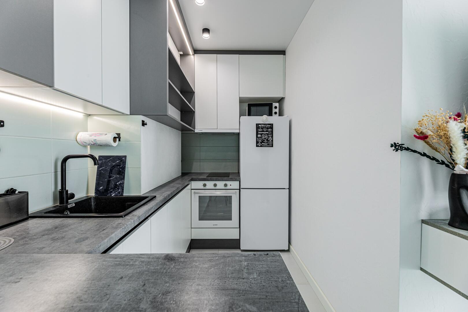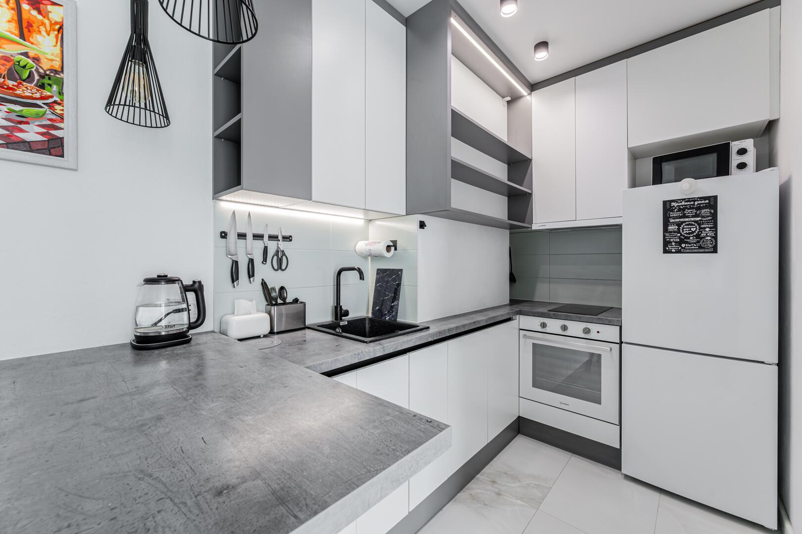 -Современная кухня с барной стойкой и встроенной техникой: духовой шкаф, электрическая варочная панель, вытяжка, холодильник