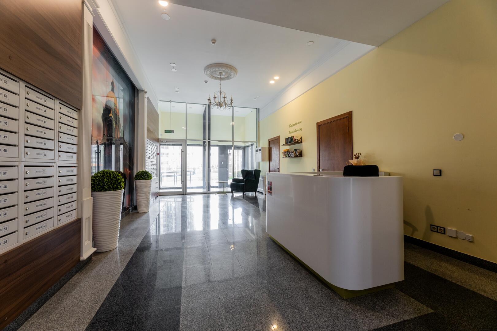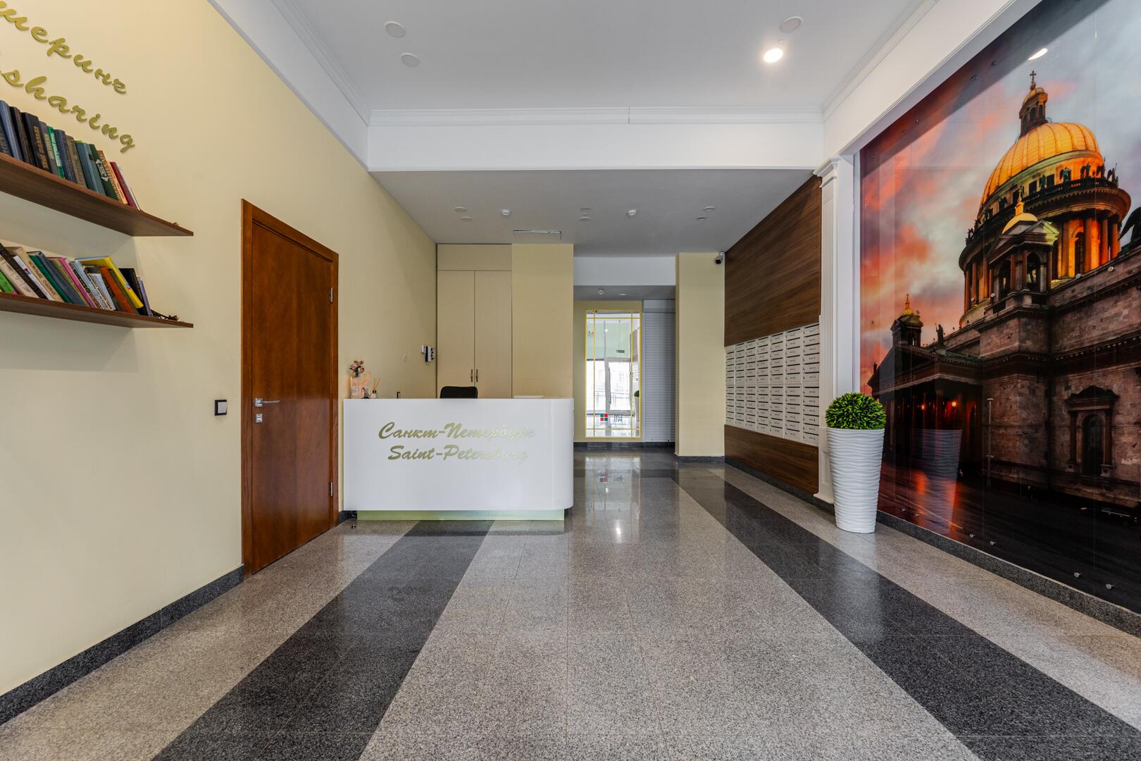 Дом Санкт Петербург представляетПросторное лобби на первом этаже с местом для консьержа. Комфортную зону ожидания, санитарную комнату и колясочнуюВыход на две стороны дома, видеодомофон. 2 Скоростных бесшумных лифта