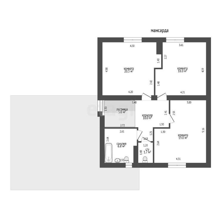 На втором этаже застройки находится: 3 изолированные комнаты, ванная комната, санузел.