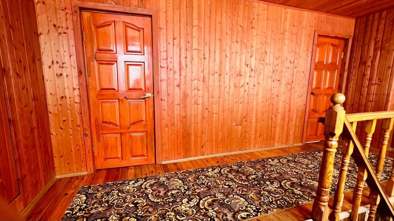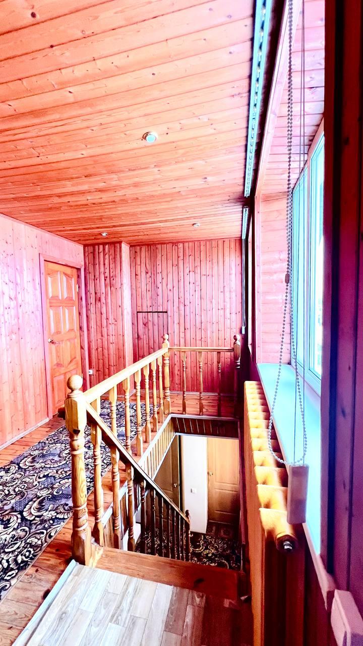 Внутри дома мансардная часть отделана деревом, на первом этаже стены оштукатурены, покрашены и оклеяны обоями, что создаёт уютную и тёплую атмосферу. По всему дому установлены стеклопакеты, входная дверь металлическая, межкомнатные двери - деревянные и МДФ.